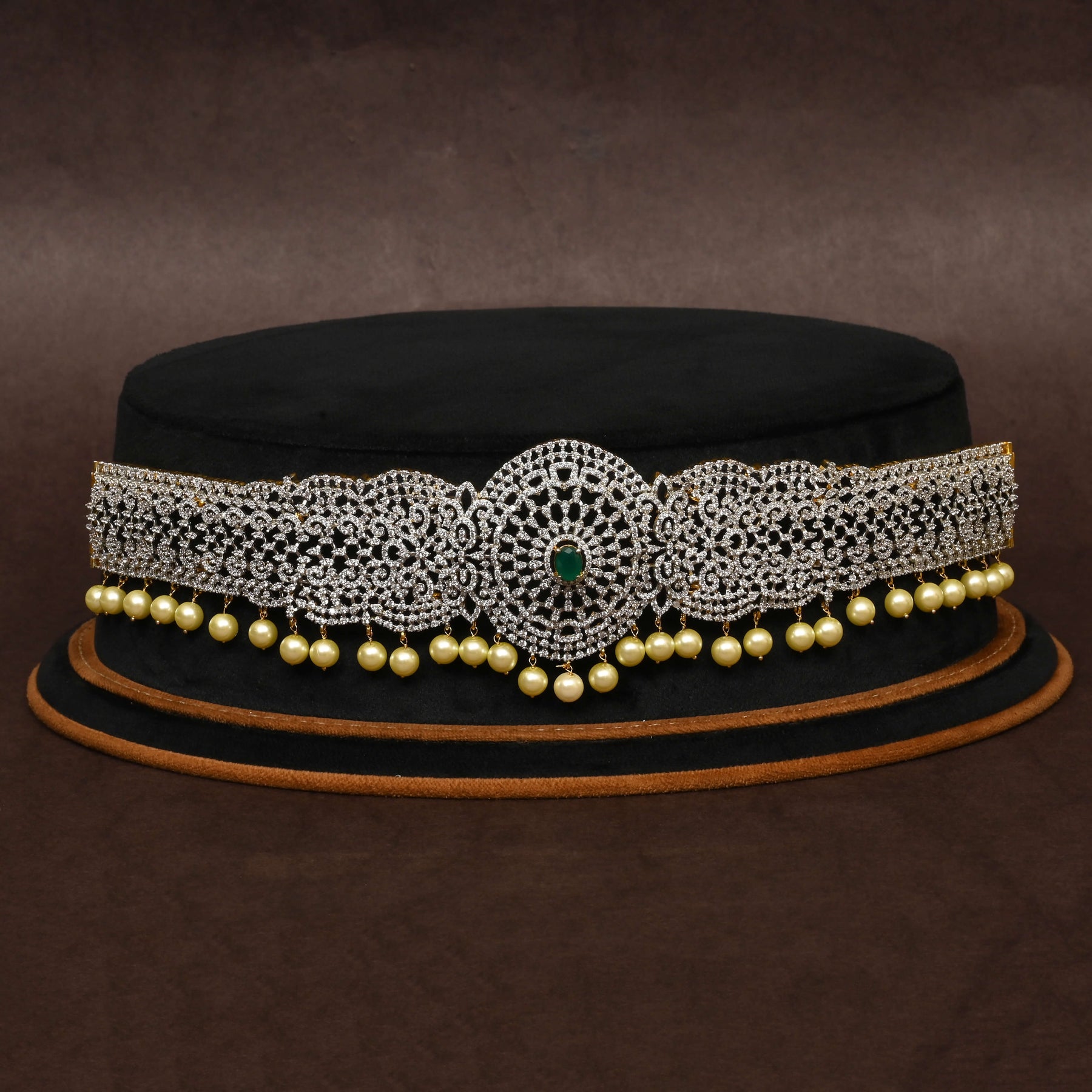 This CZ Vaddanam features a diamond finish that highlights its exquisite craftsmanship. Adorned with semi-precious emerald stones and genuine CZ stones, each piece is meticulously handcrafted to ensure uniqueness. The one-of-a-kind design blends traditional elegance with contemporary flair, making it a distinguished addition to any jewelry collection.