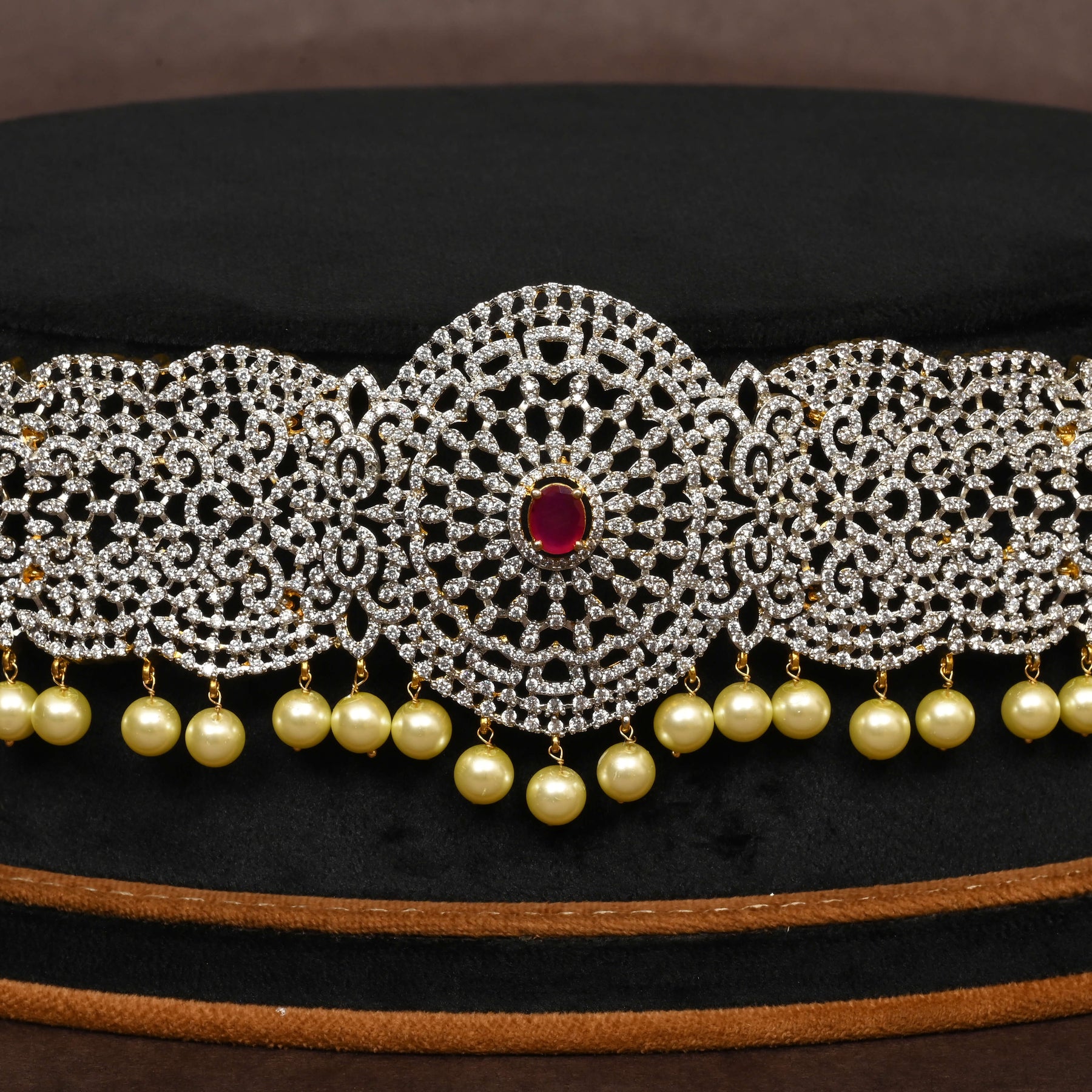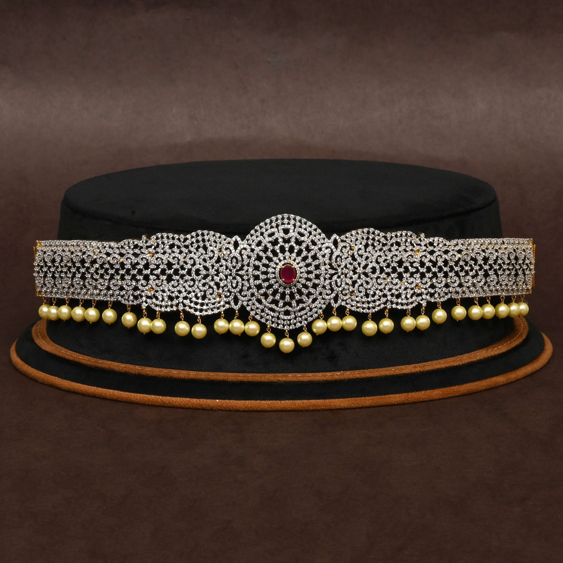 Elevate your traditional look with this exquisite CZ Vaddanam, expertly handcrafted to perfection. Featuring a dazzling diamond finish and real CZ stones, it showcases a unique, one-of-a-kind design accentuated by semi-precious ruby stones. This piece combines timeless elegance with meticulous craftsmanship, making it a stunning statement accessory for special occasions.