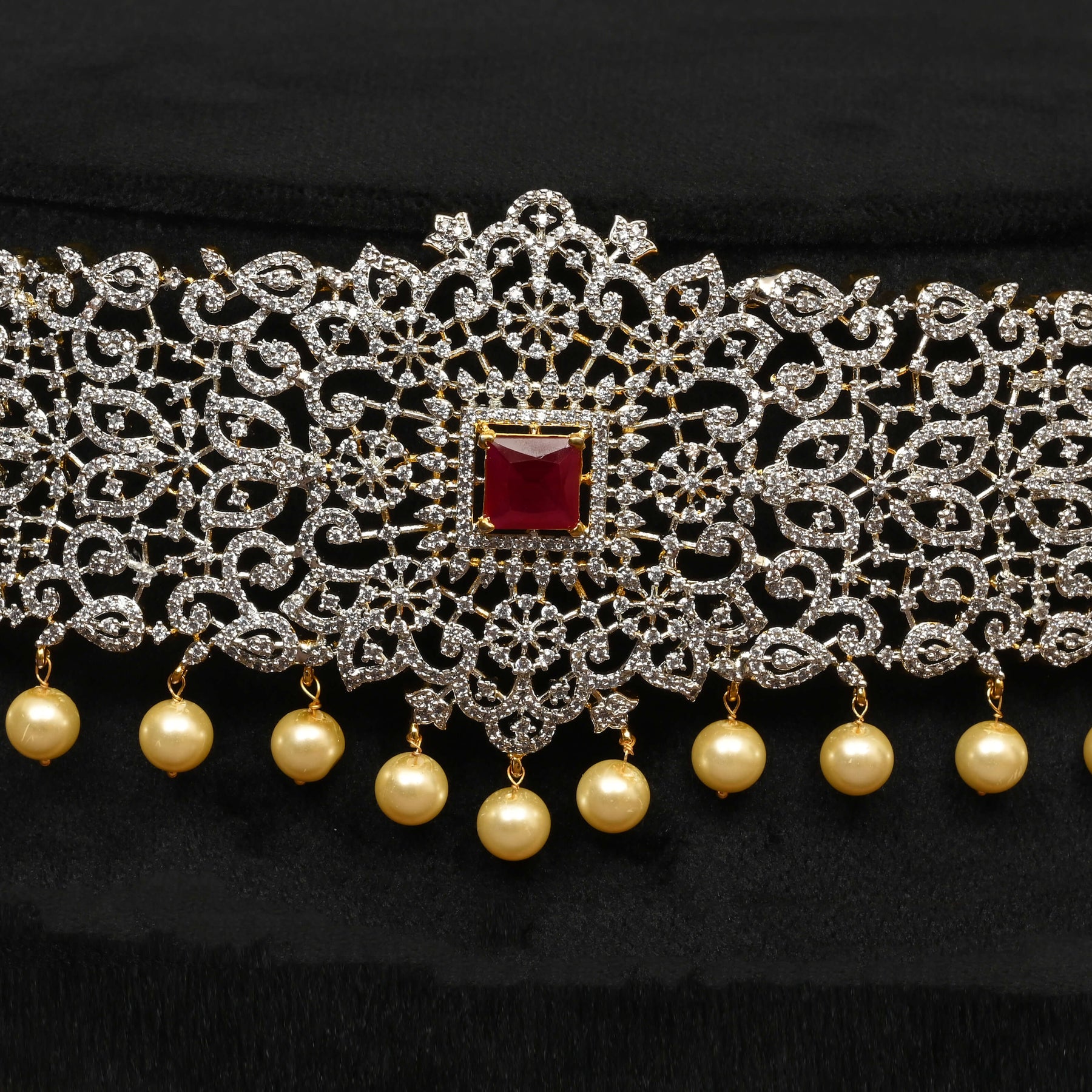 Elevate traditional elegance with this handcrafted CZ Vaddanam featuring a diamond-finished array of real cubic zirconia stones. Accented by semi-precious ruby stones, its one-of-a-kind design offers both authenticity and timeless beauty. Perfect for those seeking exquisite craftsmanship and distinctive style in their jewelry collection.