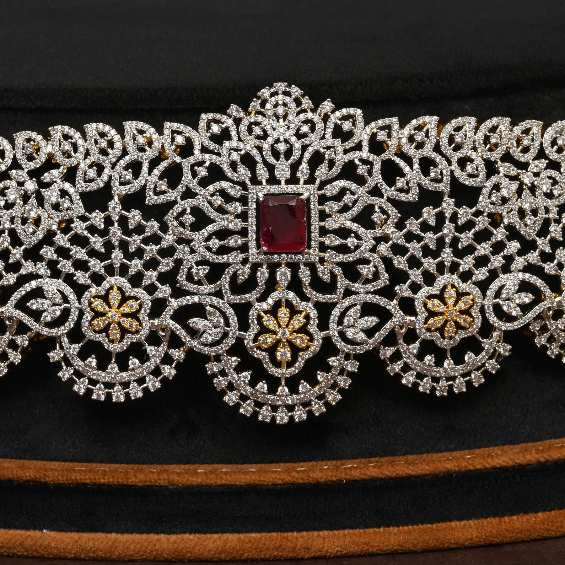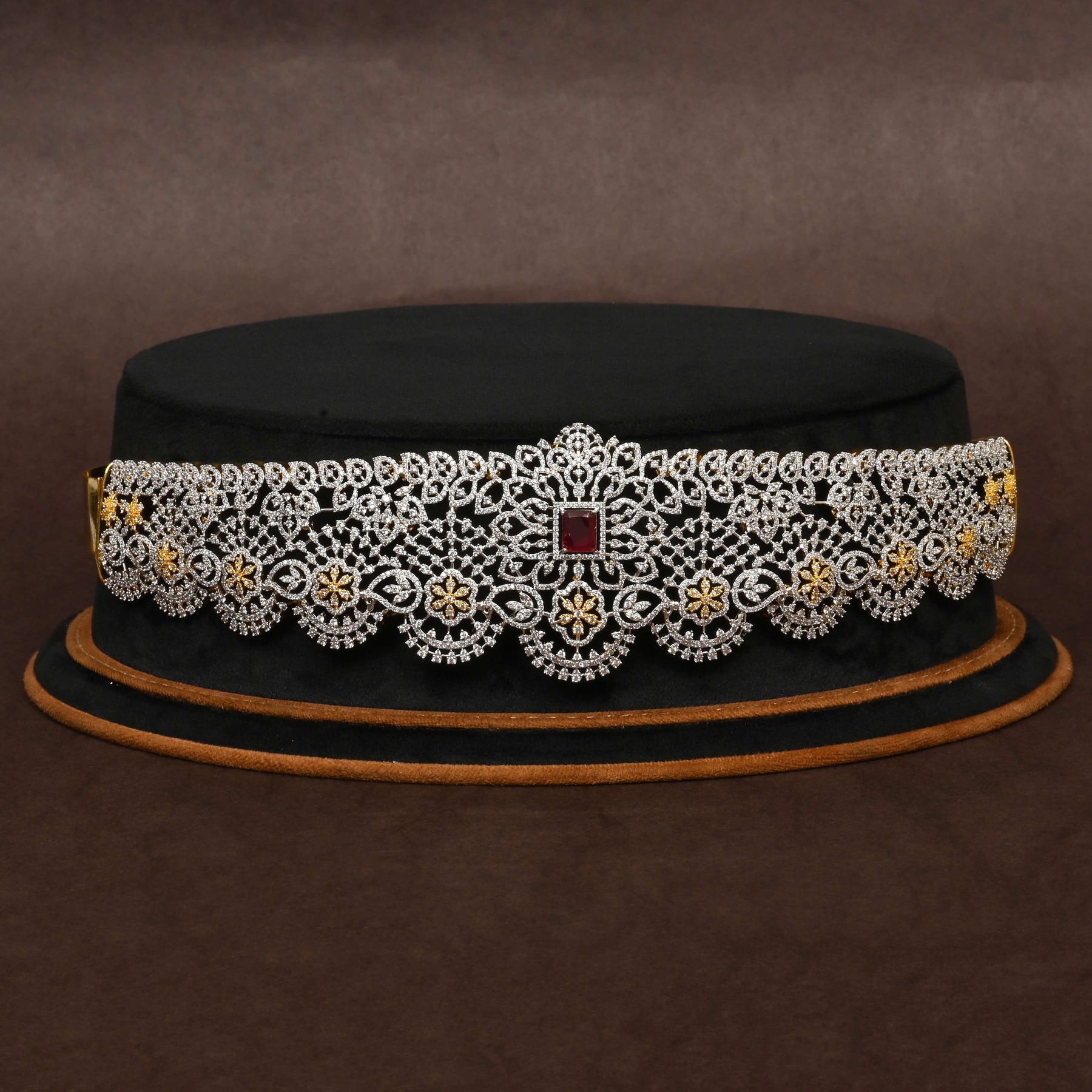 This handcrafted CZ Vaddanam features a unique design enriched with real cubic zirconia stones set in a diamond finish, complemented by semi-precious ruby accents. Its exquisite craftsmanship and one-of-a-kind detailing make it a standout piece, perfect for adding elegance to traditional attire while ensuring lasting brilliance and quality.