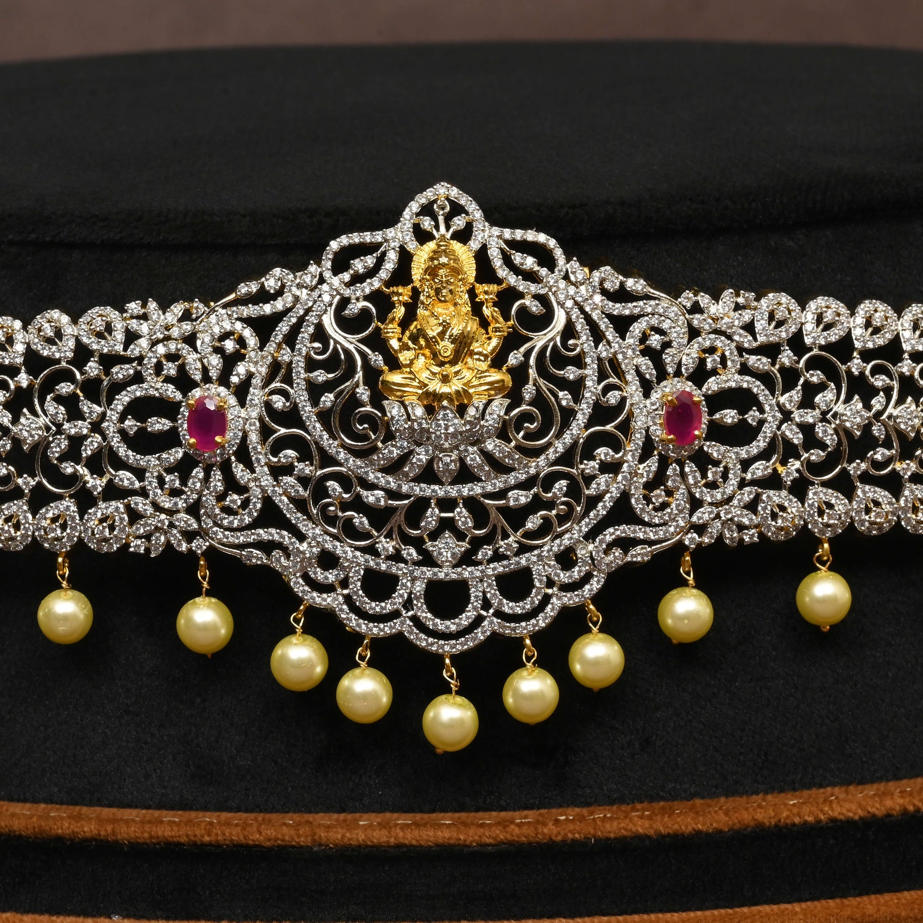 This CZ Vaddanam features a stunning goddess Lakshmi centerpiece, intricately handcrafted to highlight her divine elegance. Adorned with genuine CZ stones and a semi-precious ruby, this piece blends traditional artistry with refined luxury. Its unique, one-of-a-kind design ensures a timeless accessory that complements special occasions while embodying cultural heritage.