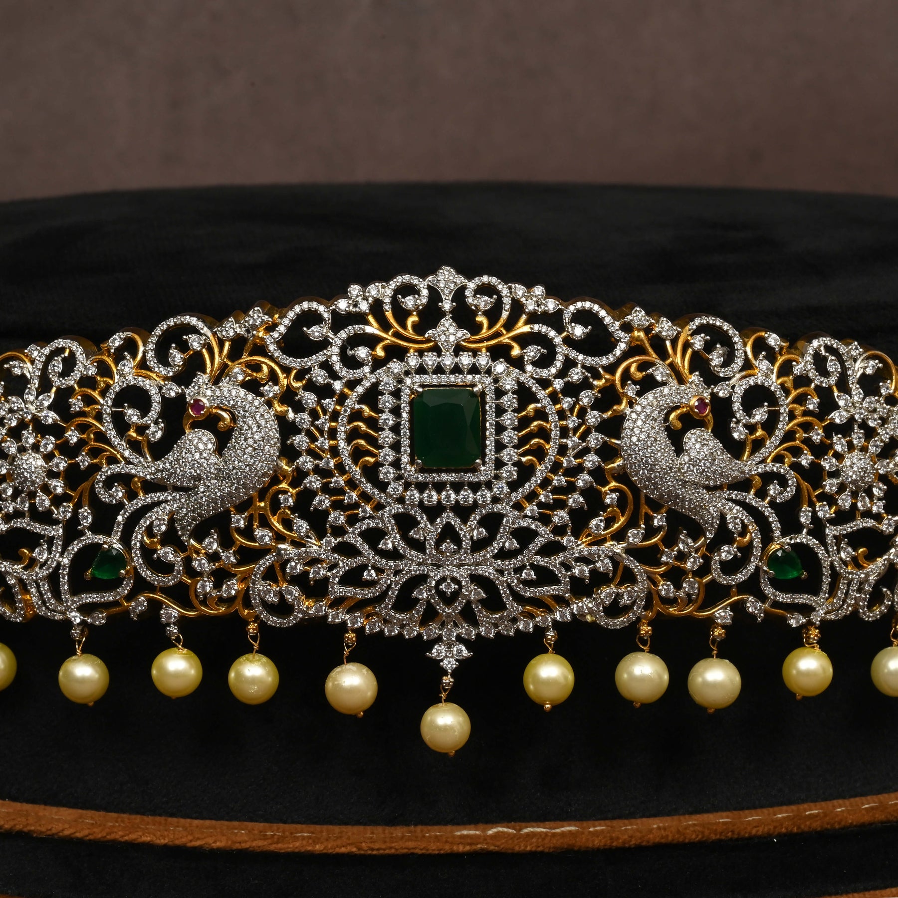 Experience the artistry of this handcrafted CZ Vaddanam featuring a stunning peacock design with a diamond finish. Embedded with real CZ stones and a semi-precious emerald centerpiece, this unique piece combines traditional elegance with meticulous craftsmanship. Its one-of-a-kind design makes it a perfect statement accessory for special occasions.