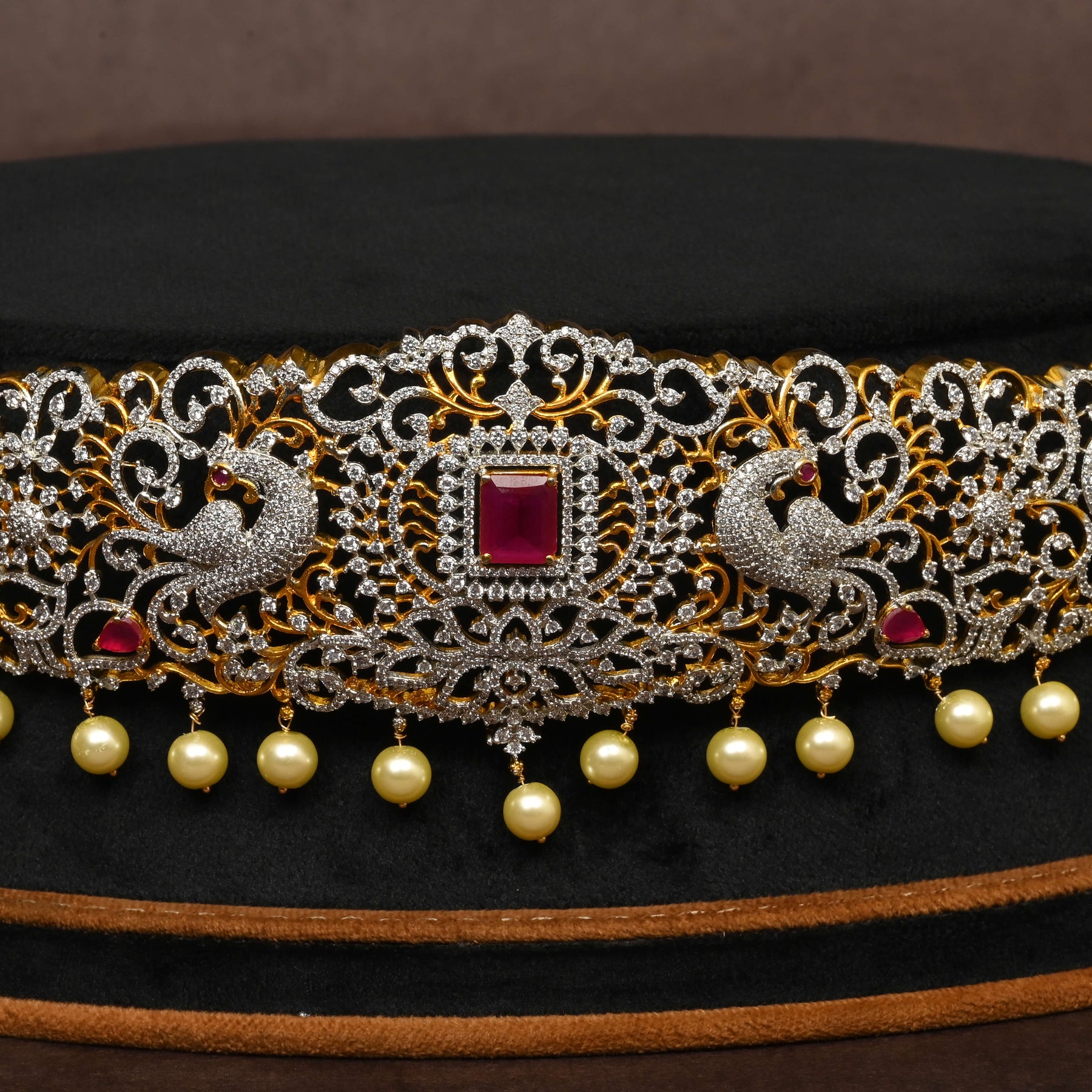 This exquisite CZ Vaddanam features a stunning peacock design meticulously handcrafted to showcase intricate artistry. Adorned with real CZ stones in a diamond finish and accented by semi-precious ruby stones, this piece offers a unique blend of brilliance and vibrant color. Its one-of-a-kind design ensures a luxurious statement, perfect for enhancing traditional attire with elegance and sophistication.