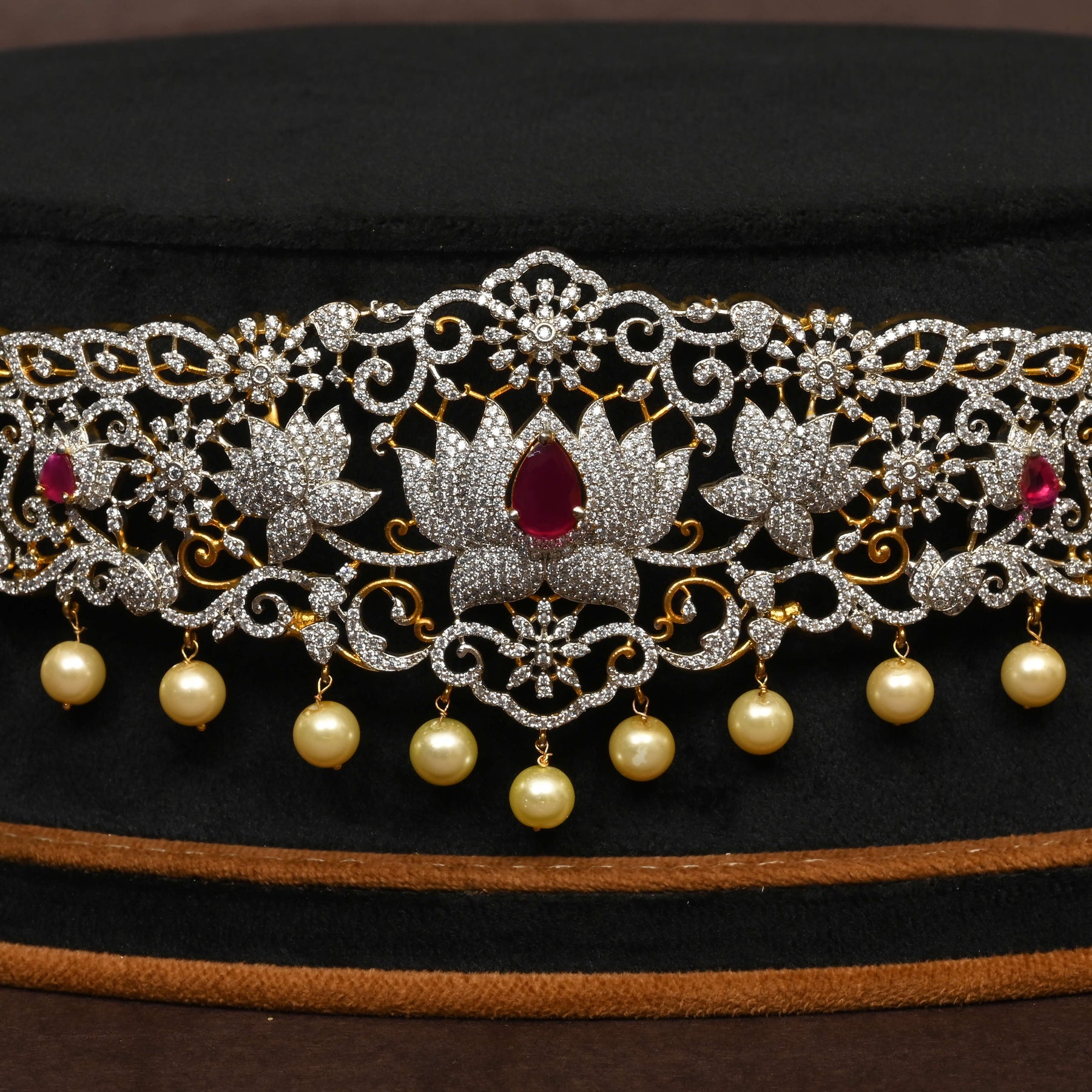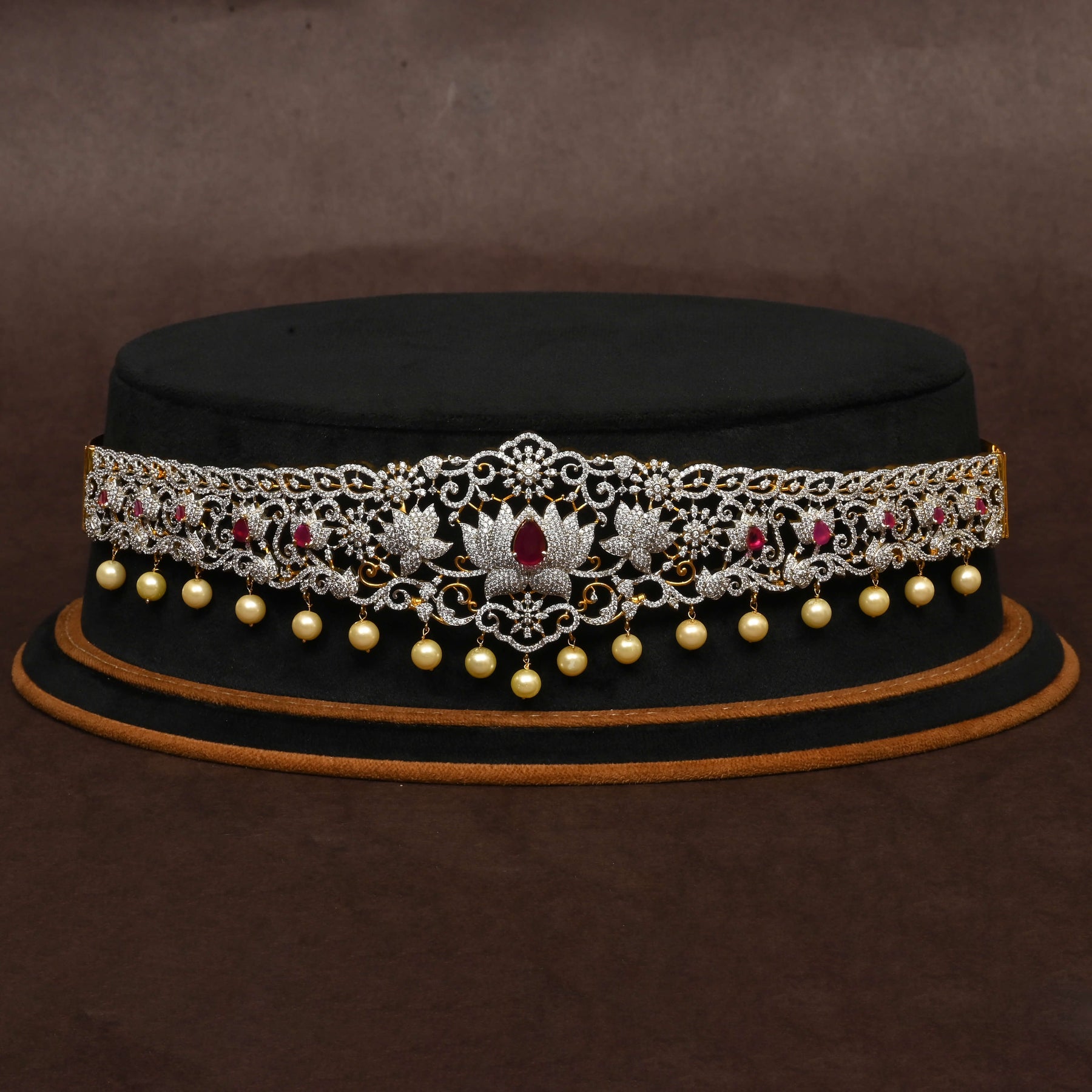 This handcrafted CZ Vaddanam showcases an exquisite lotus design, embellished with genuine CZ stones for unmatched brilliance. Featuring a semi-precious ruby stone accent, this one-of-a-kind piece combines traditional artistry with modern elegance, making it a timeless addition to your collection.