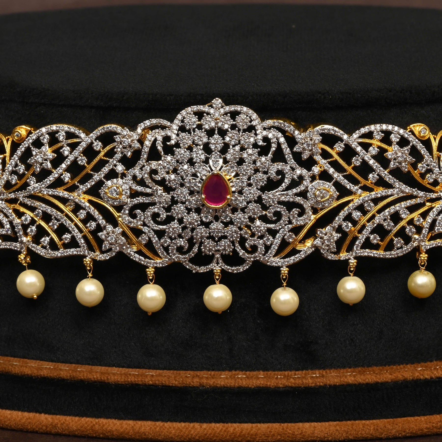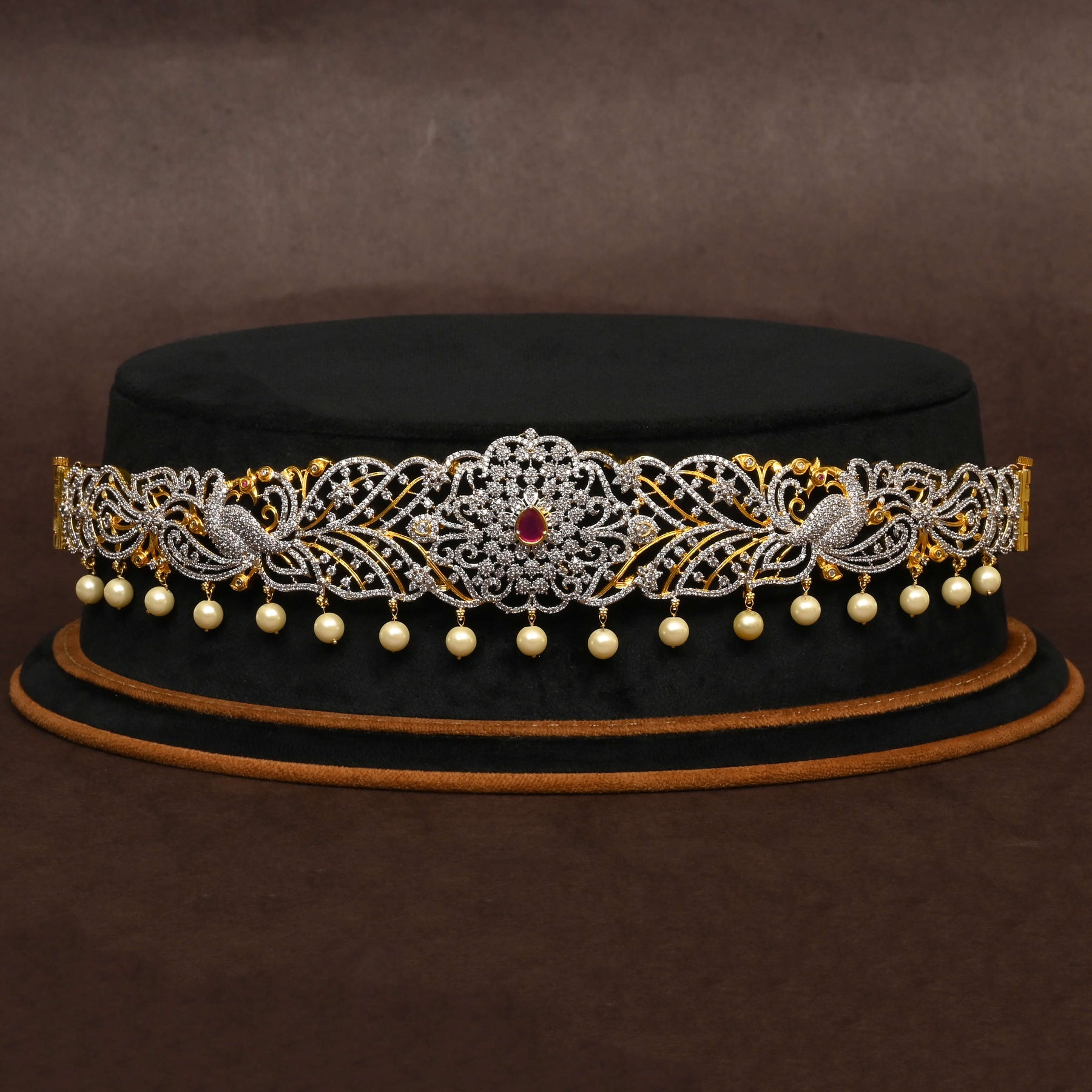 This exquisite CZ Vaddanam showcases a stunning peacock design adorned with real cubic zirconia stones, offering brilliant sparkle and elegance. Handcrafted with meticulous attention to detail, it features semi-precious ruby stones and delicate pearl danglings, making each piece truly unique. Perfect for special occasions, this one-of-a-kind design blends traditional artistry with refined beauty, enhancing your ensemble with timeless sophistication.