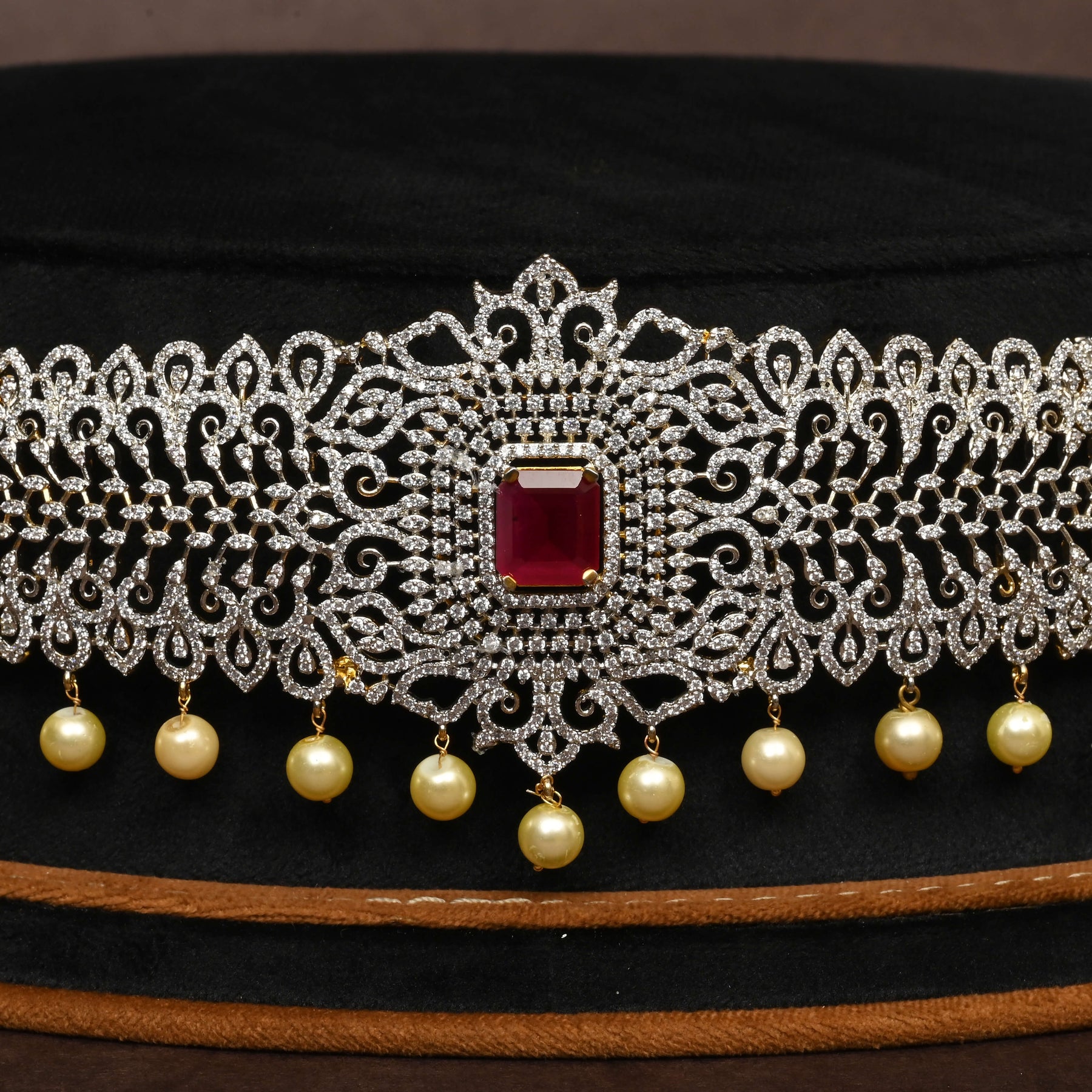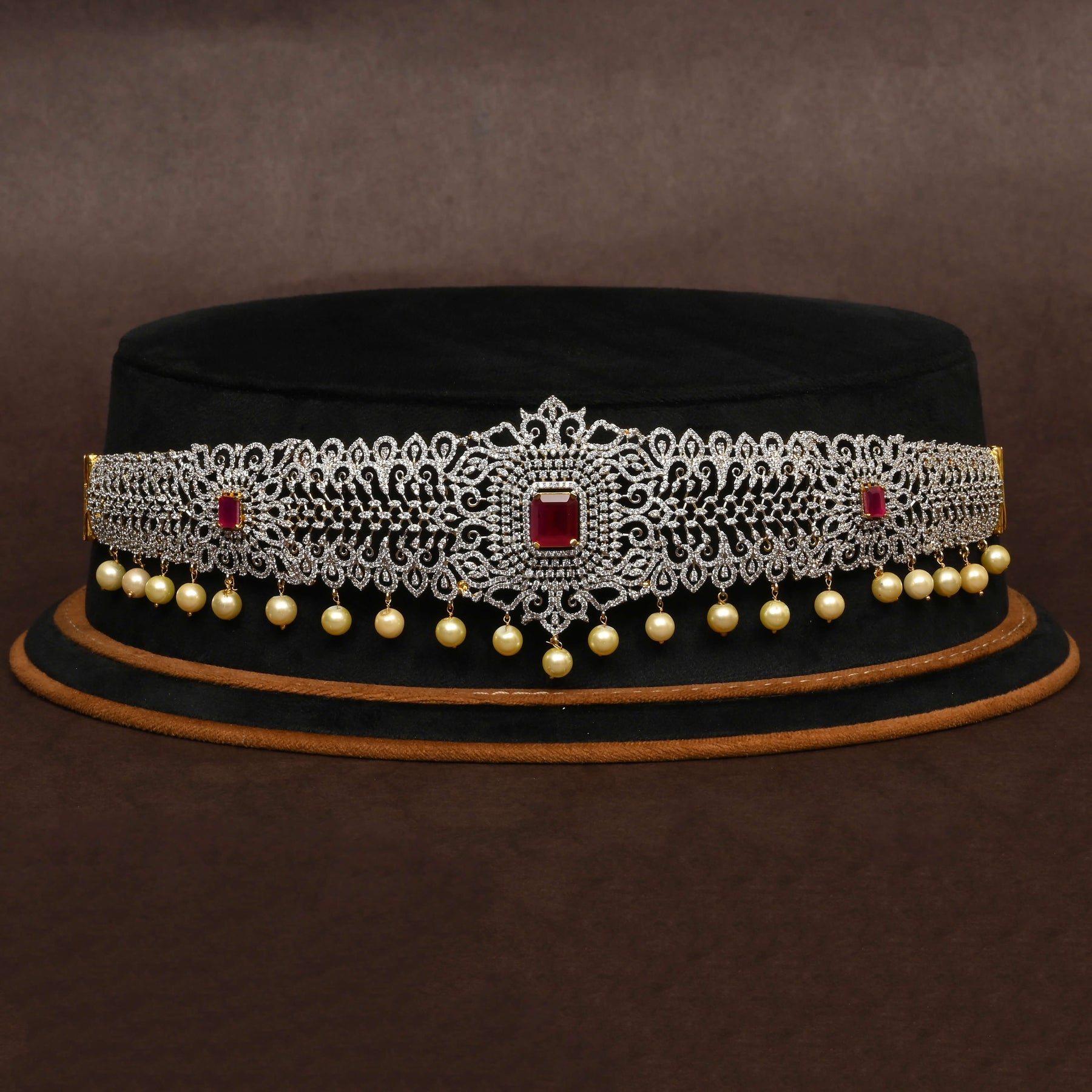 This exquisite CZ Vaddanam features a stunning diamond finish that adds elegant brilliance to any traditional look. Handcrafted with precision, it showcases genuine CZ stones and a semi-precious ruby centerpiece, creating a unique, one-of-a-kind design. Perfect for special occasions, this piece combines meticulous artistry with timeless beauty, making it a distinguished addition to your jewelry collection.