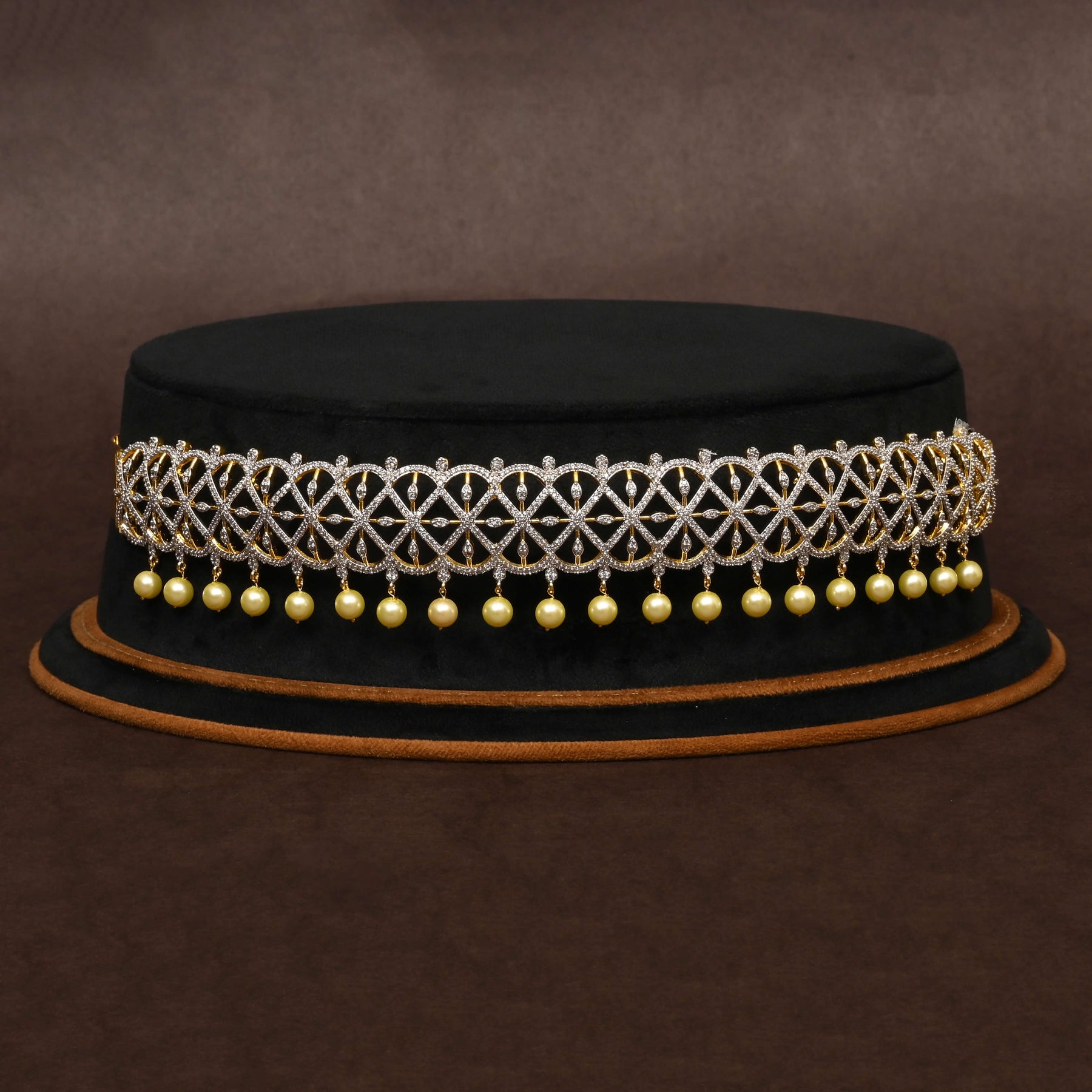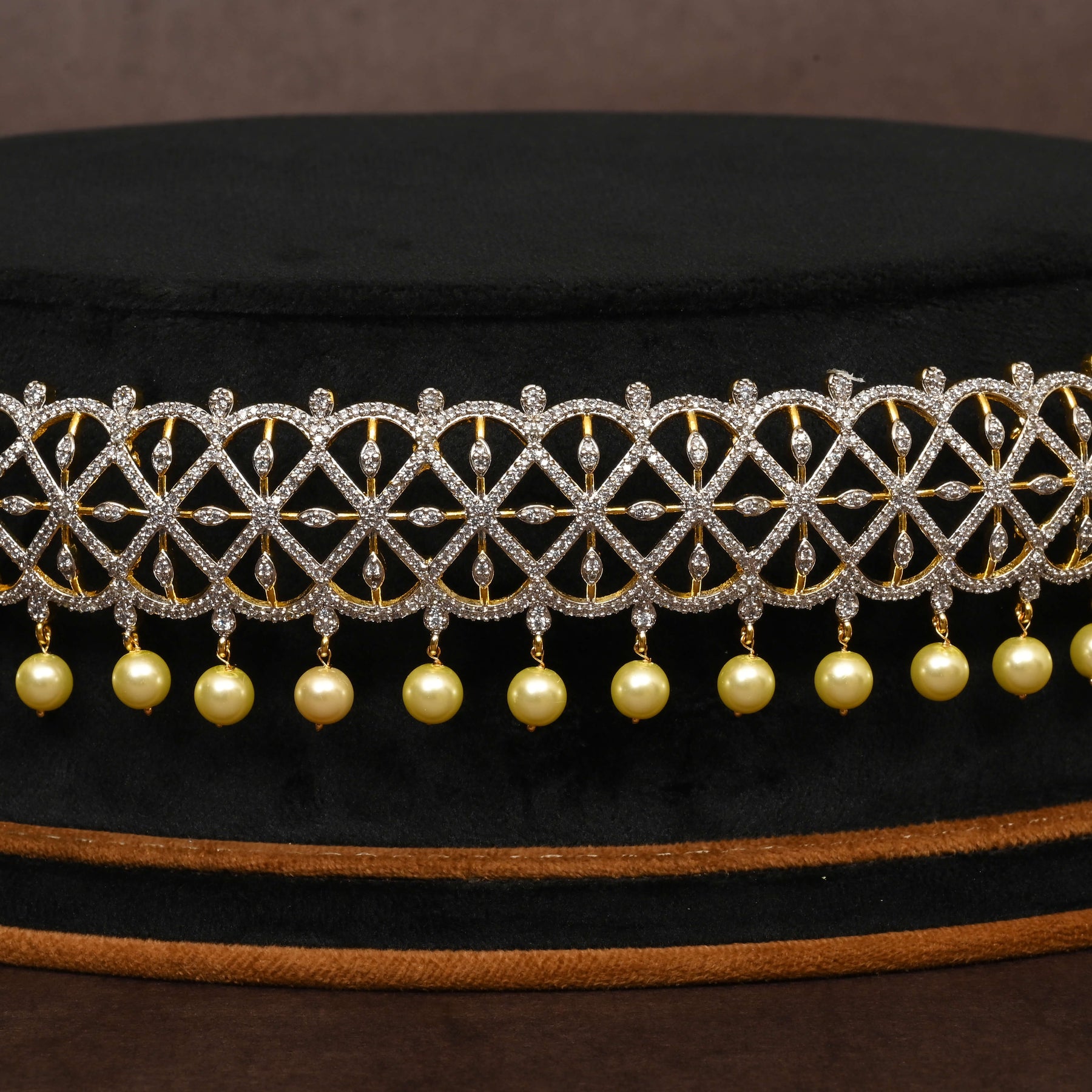 The CZ Vaddanam showcases expert craftsmanship with its unique, one-of-a-kind design. Handcrafted with real CZ stones, it features a striking diamond finish that enhances its elegance. Delicate pearls dangle gracefully, adding a refined touch to this traditional waist ornament. Perfect for elevating any special occasion, this piece blends timeless tradition with exceptional artistry.