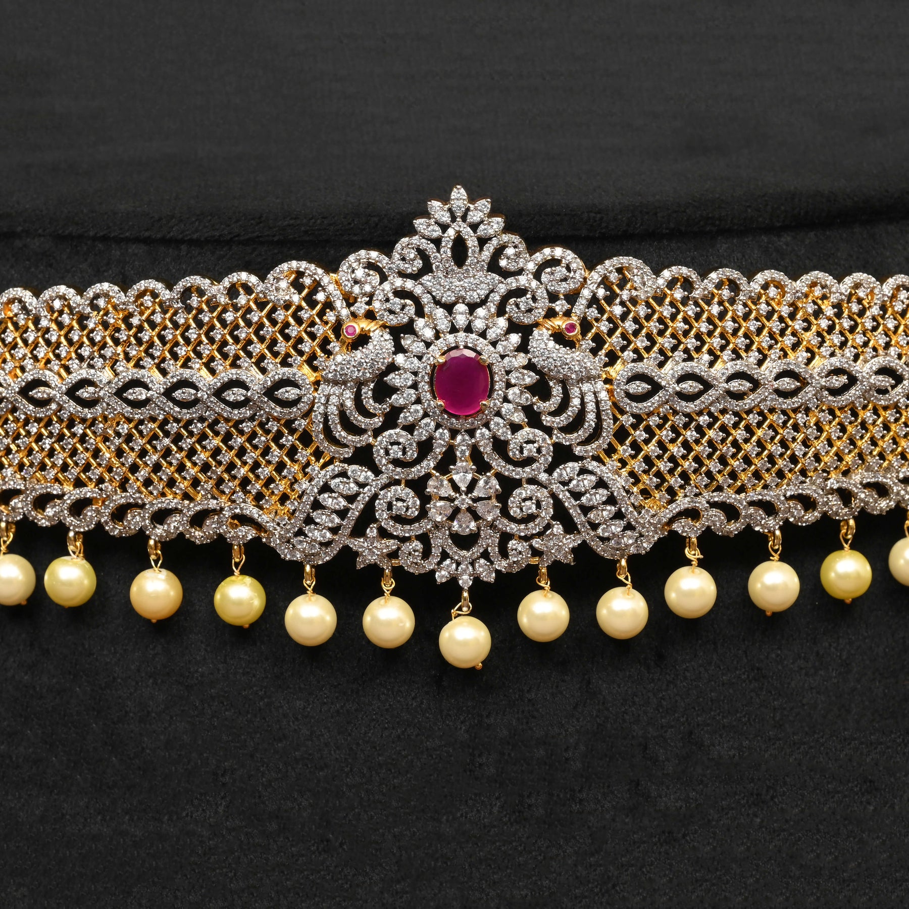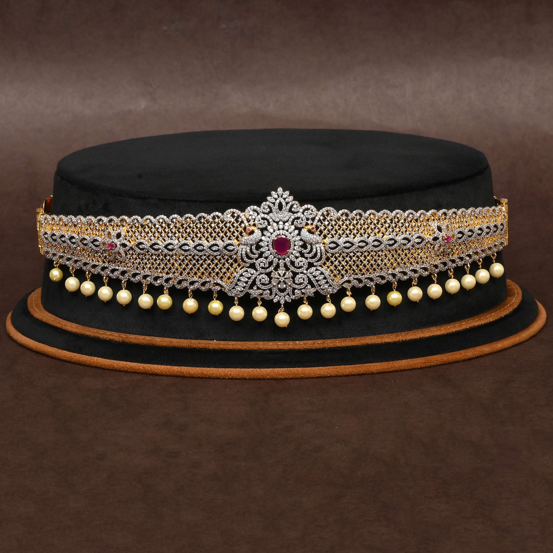 This CZ Vaddanam features a stunning diamond finish, enhanced by genuine cubic zirconia stones that offer brilliant sparkle. Adorned with a semi-precious ruby centerpiece, this handcrafted piece showcases exceptional artisanal skill. Its unique, one-of-a-kind design makes it a distinguished addition to any traditional collection. Perfect for special occasions, it combines elegance with durability, reflecting refined craftsmanship.