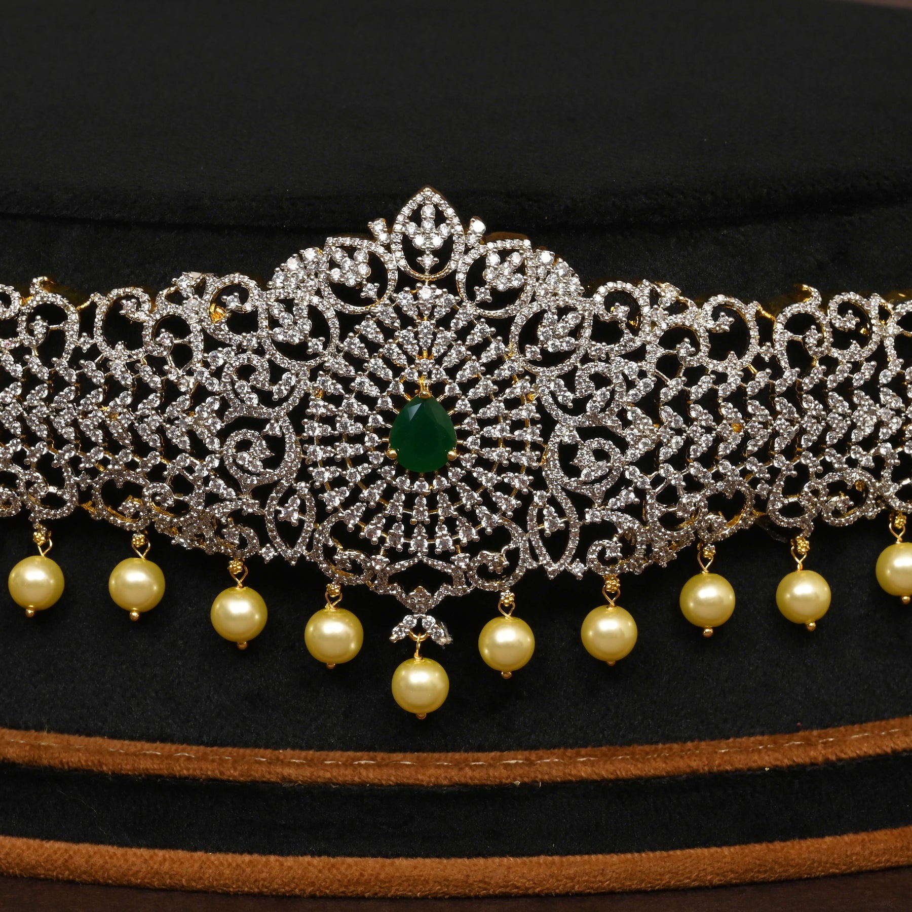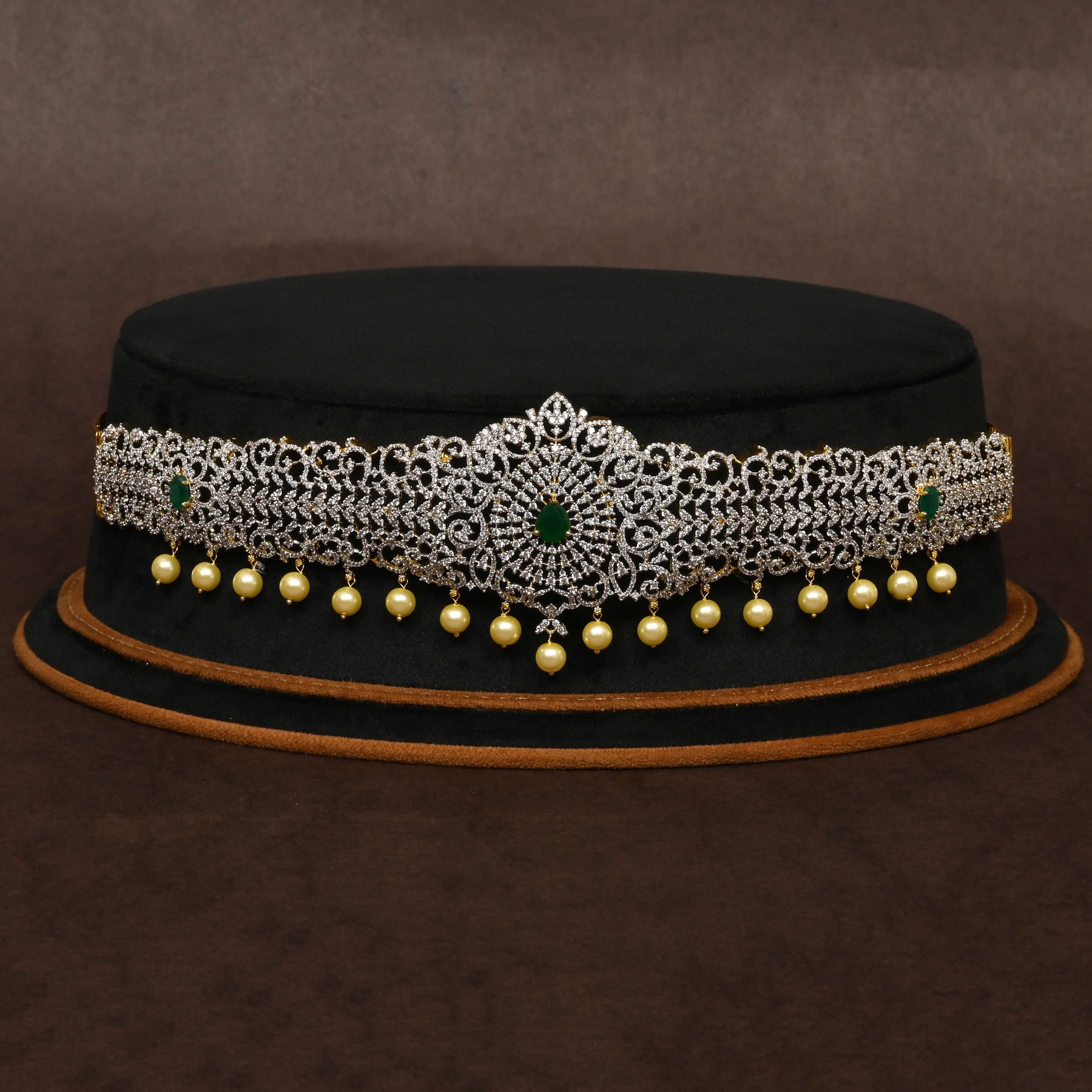 This CZ Vaddanam showcases expert craftsmanship with a unique one-of-a-kind design, blending real CZ stones in a sparkling diamond finish. Accented by semi-precious emerald stones, this handcrafted piece offers a refined elegance that enhances traditional wear with a modern touch. Perfect for those seeking quality and exclusivity in their jewellery collection.