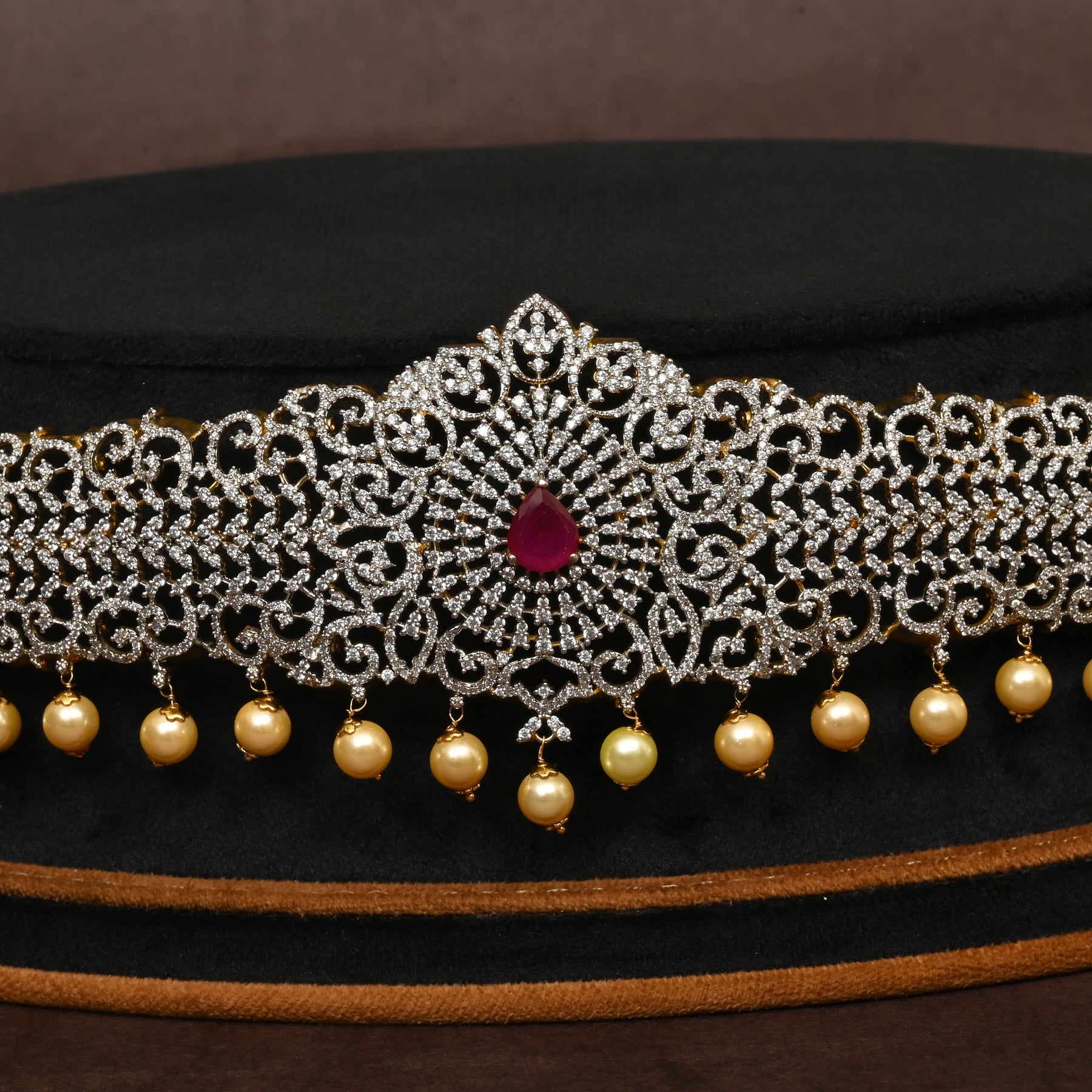 Elevate traditional elegance with this handcrafted CZ Vaddanam, featuring a diamond-finished design that enhances every detail. Adorned with real CZ stones and a semi-precious ruby stone centerpiece, this piece offers a unique blend of brilliance and color. Its one-of-a-kind craftsmanship ensures exclusivity and timeless appeal, perfect for special occasions that demand refined beauty.