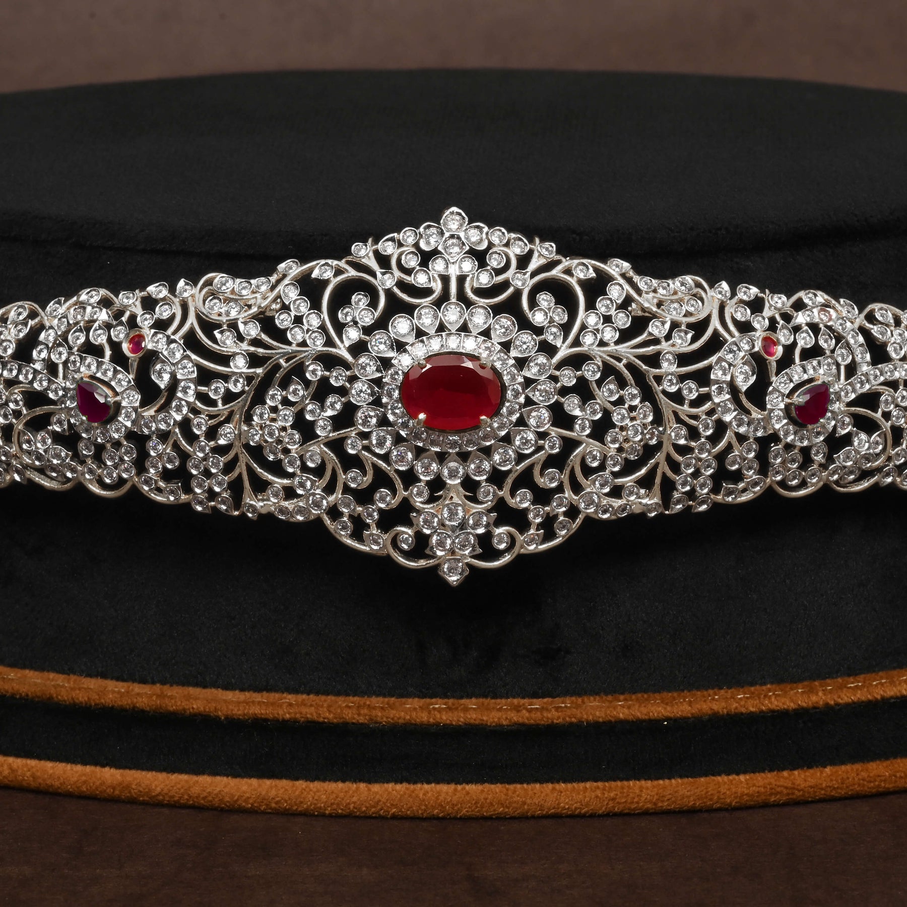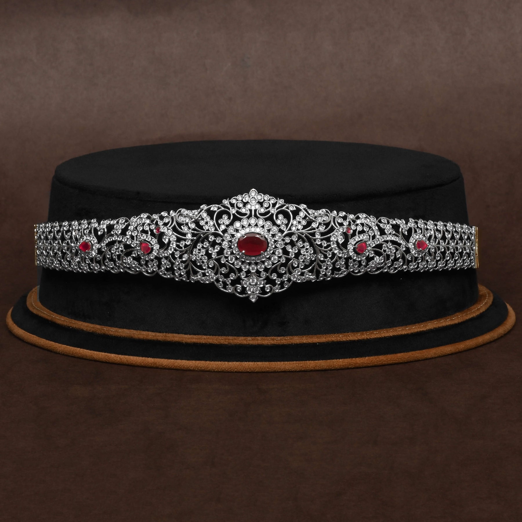This exquisite CZ Vaddanam features a stunning gold finish that complements its handcrafted artistry. Adorned with semi-precious ruby stones and genuine cubic zirconia, this one-of-a-kind design offers a blend of traditional elegance and lasting brilliance. Perfect for enhancing your special occasion ensemble with expert craftsmanship and distinctive style.