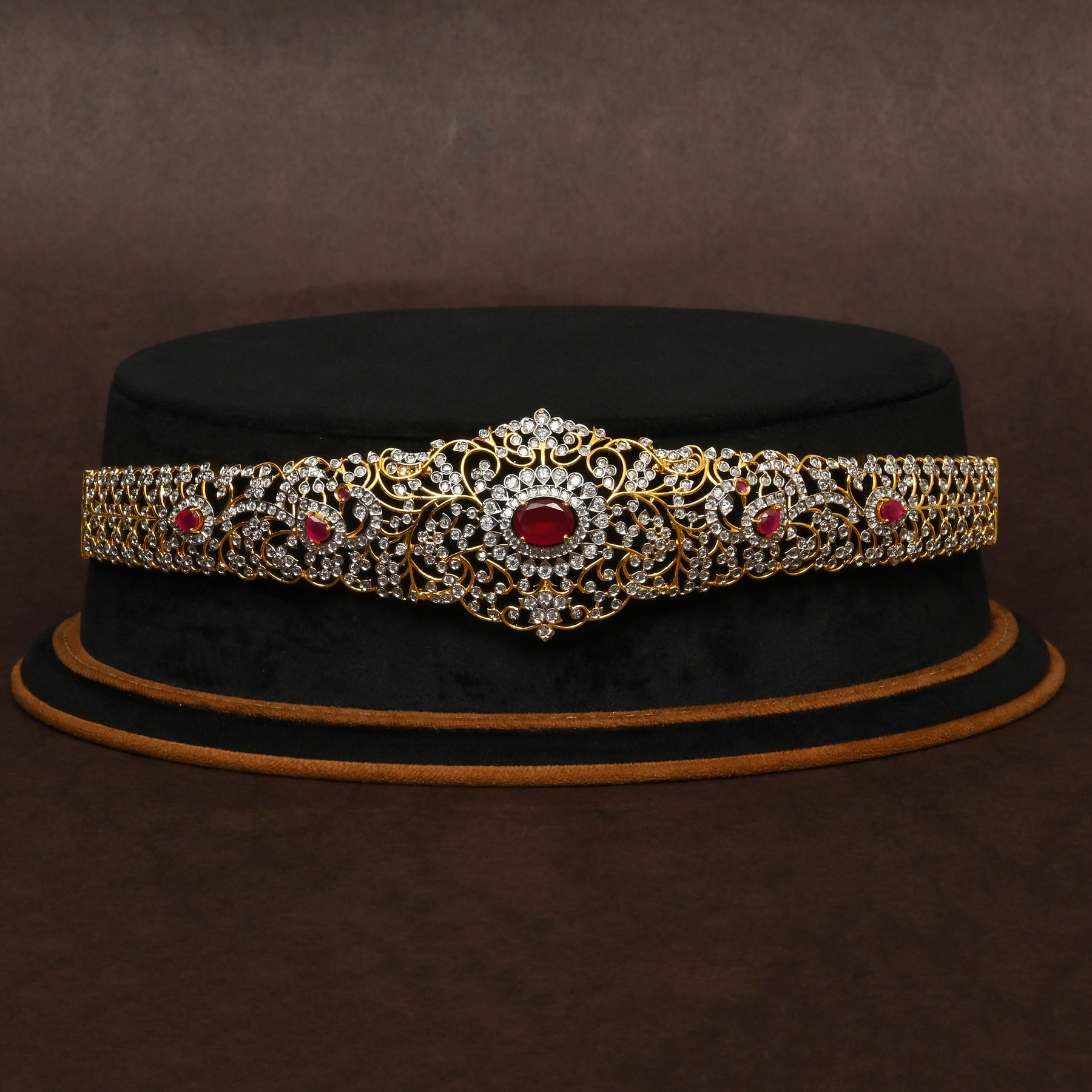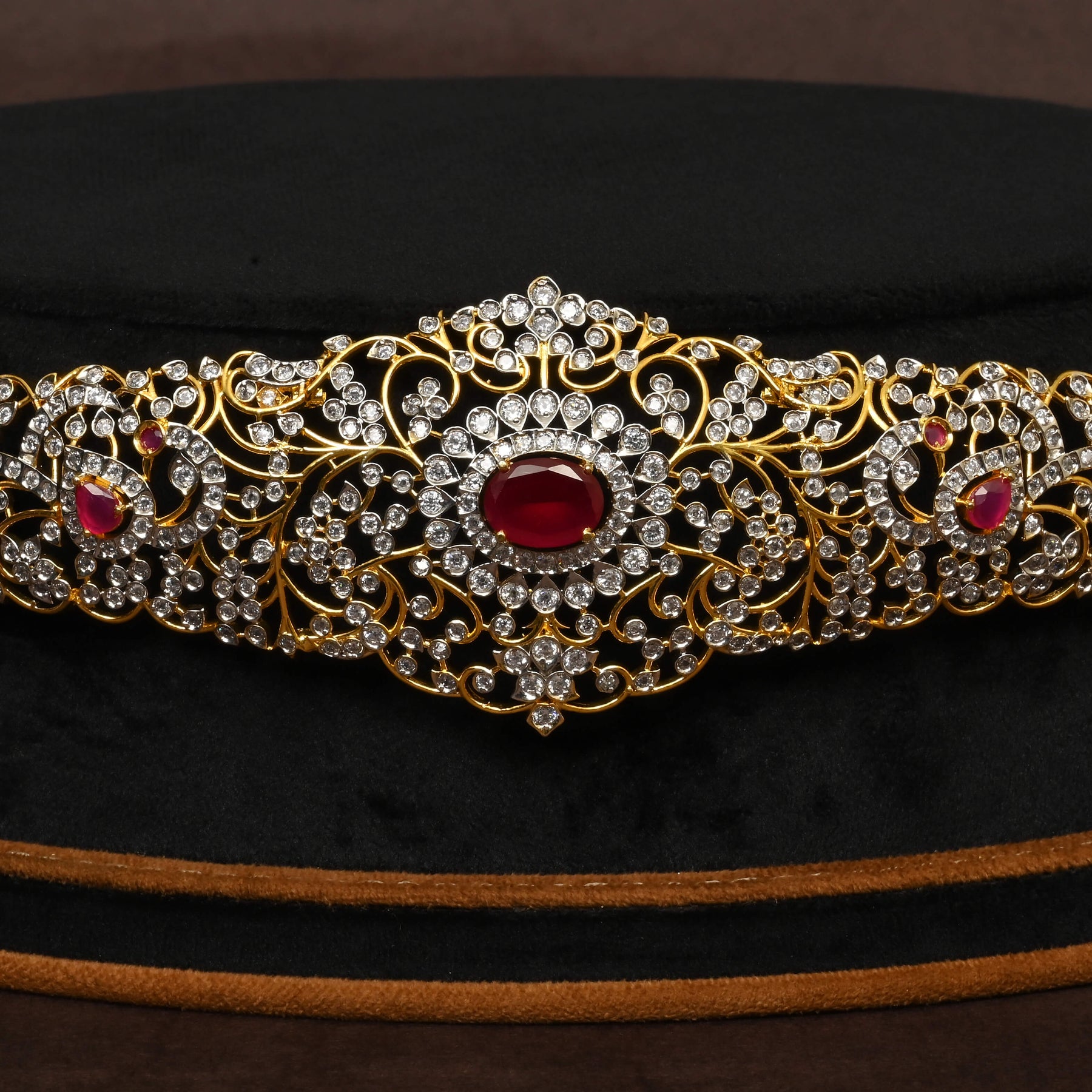 The CZ Vaddanam features a captivating diamond finish that enhances its intricate handcrafted design. Adorned with genuine CZ stones and a semi-precious ruby centerpiece, this unique piece offers both luxury and timeless elegance. Its one-of-a-kind craftsmanship makes it a distinguished addition to any traditional collection.