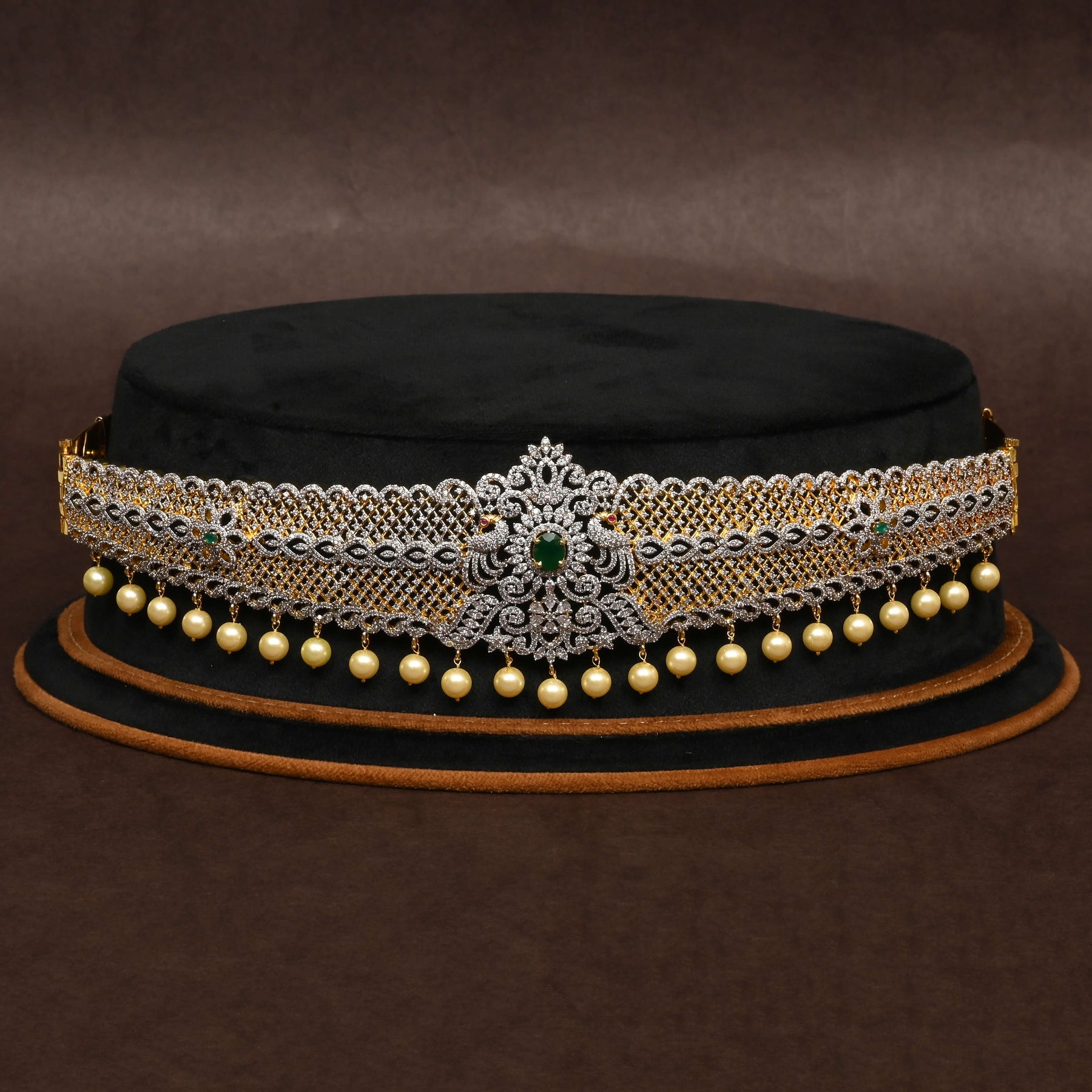 This handcrafted CZ Vaddanam in a diamond finish showcases genuine cubic zirconia stones and a semi-precious ruby centerpiece. Its one-of-a-kind design highlights exquisite craftsmanship, combining traditional style with a contemporary sparkle. Ideal for those seeking a distinctive accessory that adds elegance and charm to special occasions.