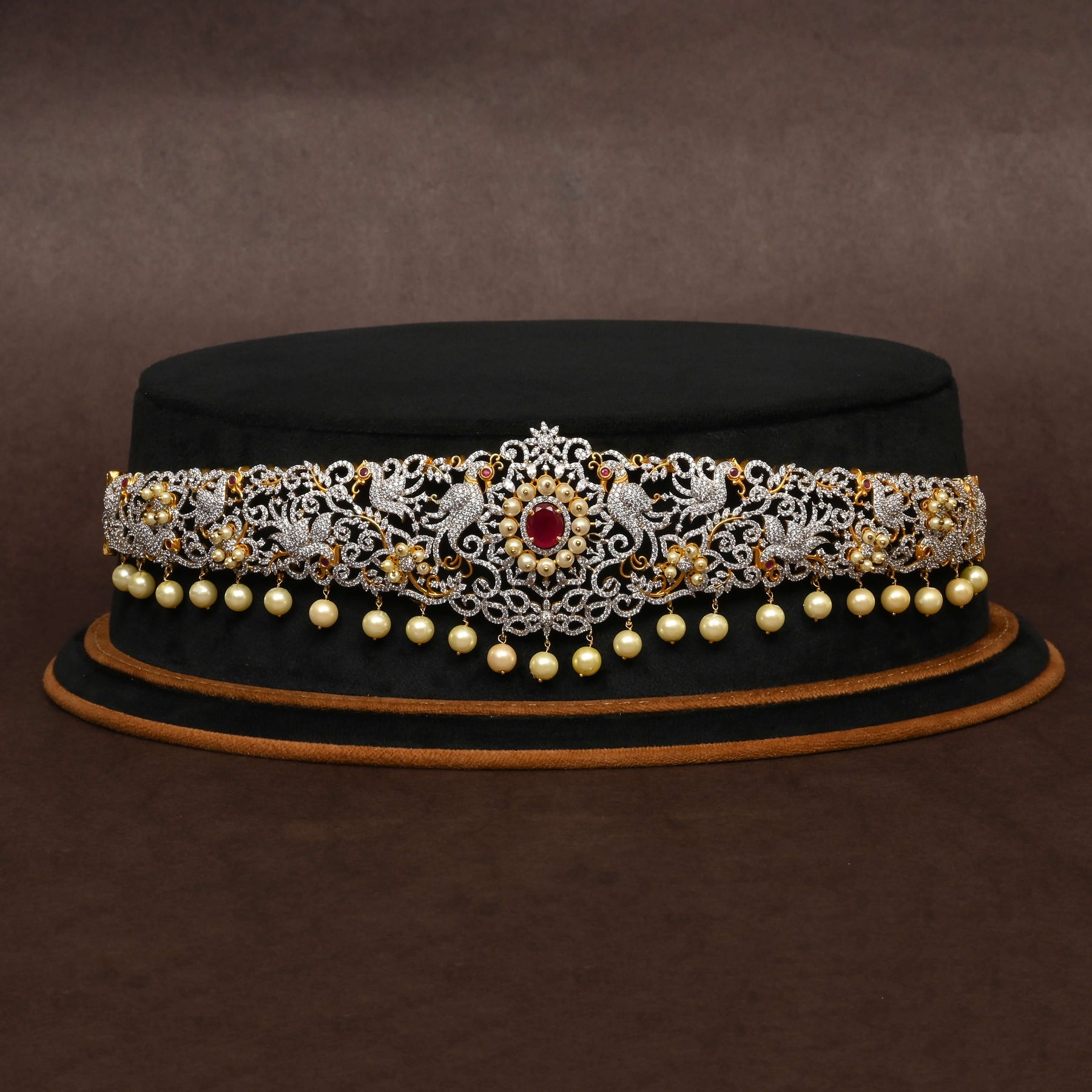 This exquisite CZ Vaddanam features a stunning diamond finish complemented by semi-precious ruby stones. Handcrafted with precision, it showcases intricate peacock motifs adorned with real CZ stones and delicate pearls. Each piece is a one-of-a-kind design, blending traditional artistry with contemporary elegance. Perfect for those seeking a unique statement accessory that highlights craftsmanship and timeless beauty.