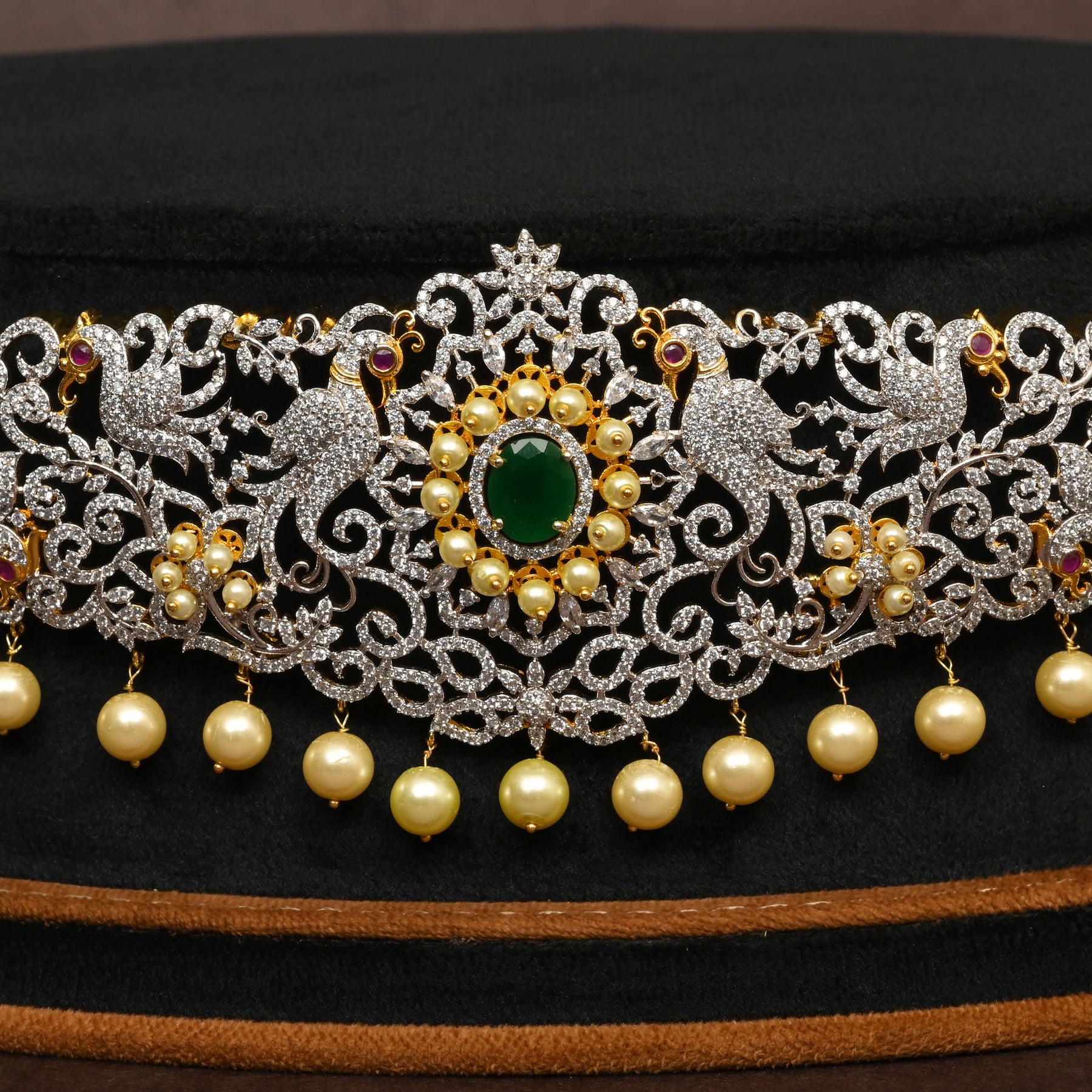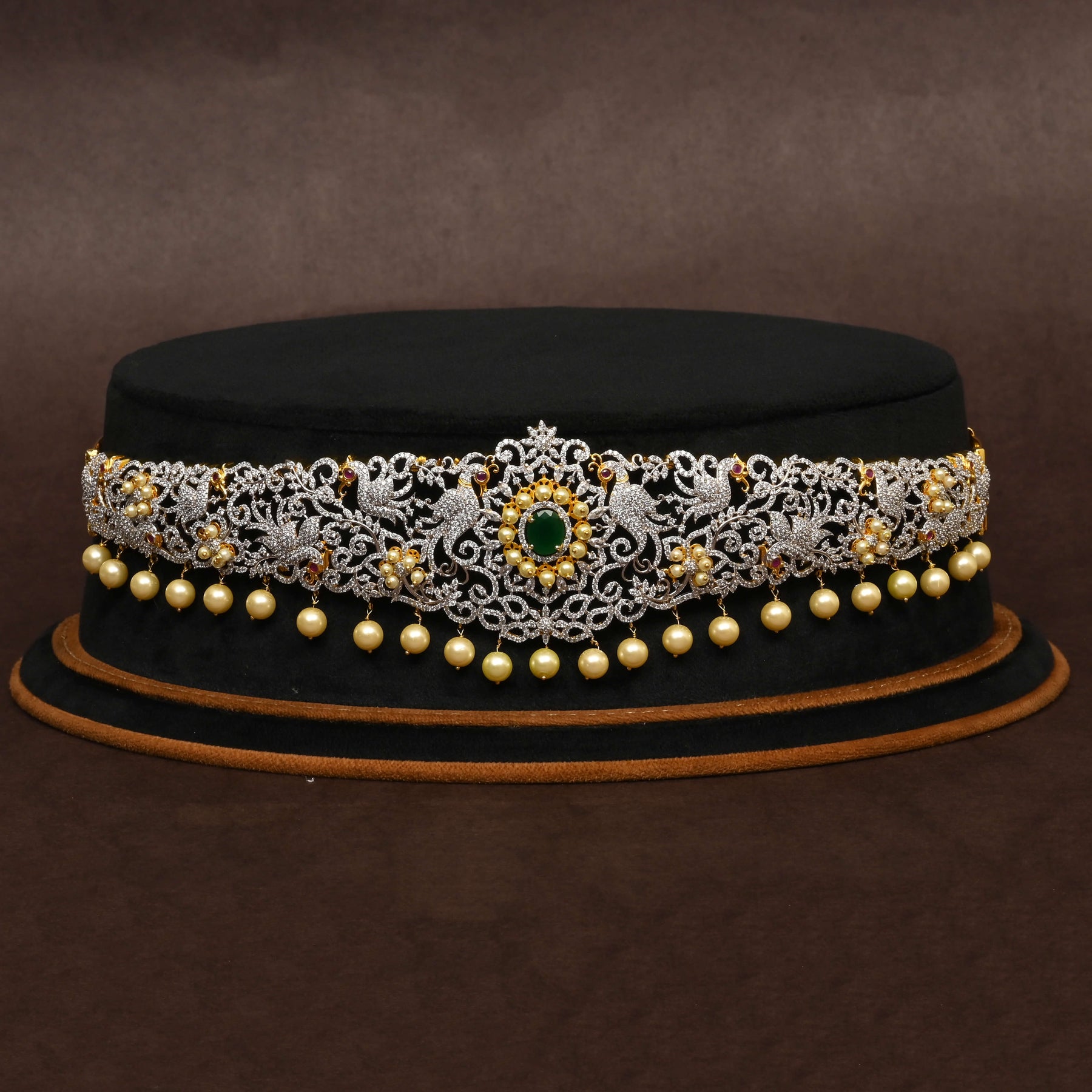 This exquisite CZ Vaddanam showcases a stunning peacock design finished in dazzling diamond accents. Adorned with lustrous pearls and genuine semi-precious emerald stones, it combines timeless elegance with vibrant color. Handcrafted with precision, each piece features authentic CZ stones, making it a unique treasure in your jewelry collection. Perfect for adding a regal touch to any traditional attire, this one-of-a-kind masterpiece reflects expert craftsmanship and meticulous attention to detail.