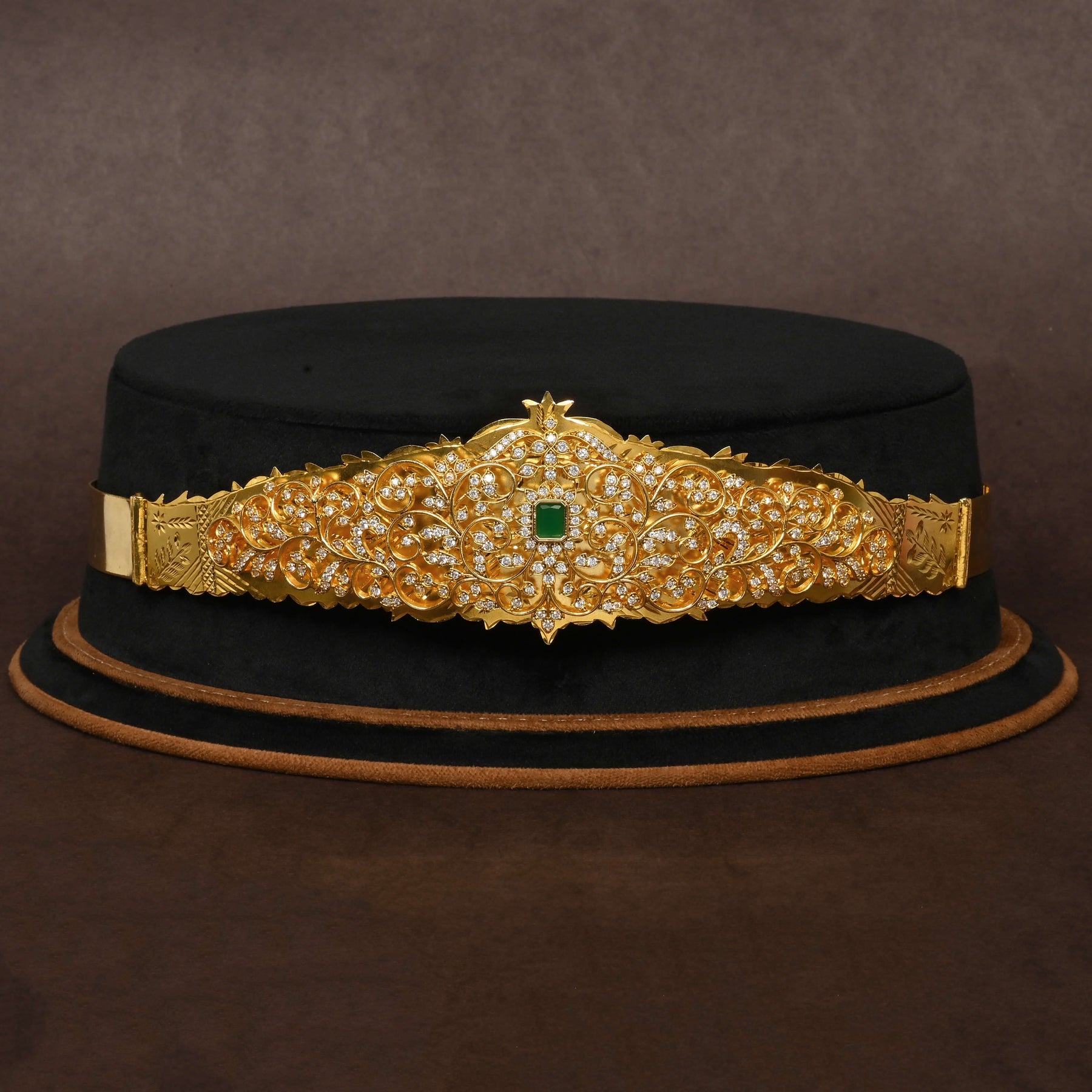 Elevate your traditional attire with this expertly handcrafted CZ Vaddanam, featuring a stunning gold finish that closely resembles authentic gold. Adorned with real cubic zirconia stones, each piece showcases a one-of-a-kind design, combining timeless elegance with exceptional craftsmanship. This Vaddanam offers a luxurious look while maintaining durability, making it a distinguished accessory for special occasions.