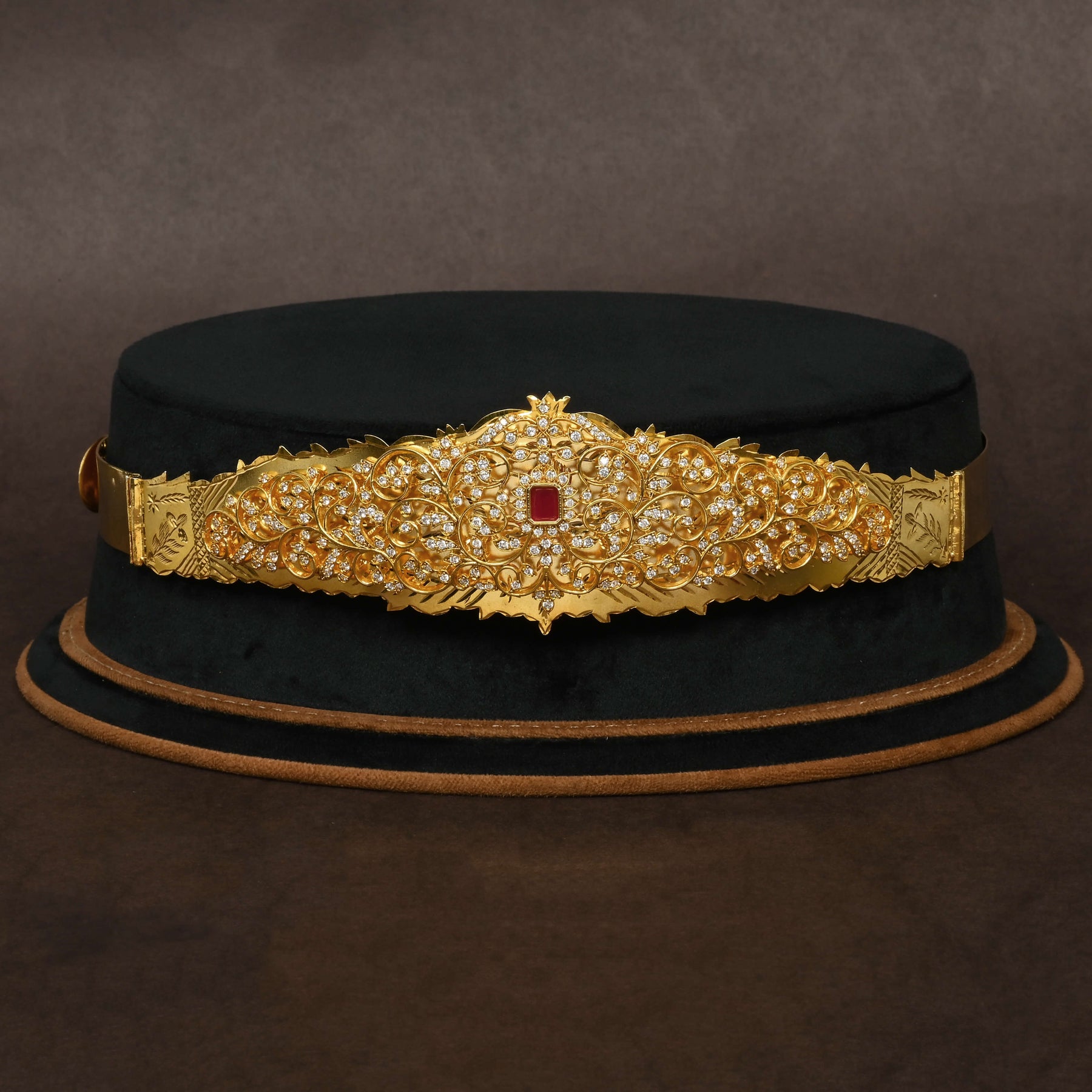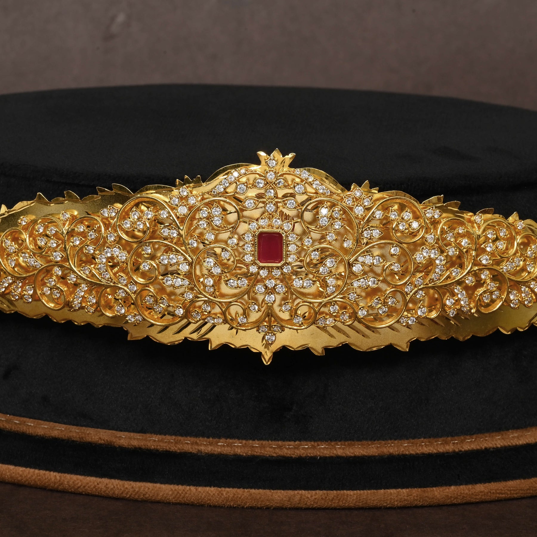 This CZ Vaddanam features a stunning gold finish that mimics the richness of real gold. Handcrafted with precision, it is adorned with genuine cubic zirconia stones and semi-precious ruby accents, creating a unique, one-of-a-kind design. Perfectly blending traditional allure with contemporary elegance, this statement piece enhances any festive or bridal look with its intricate detailing and lasting shine.