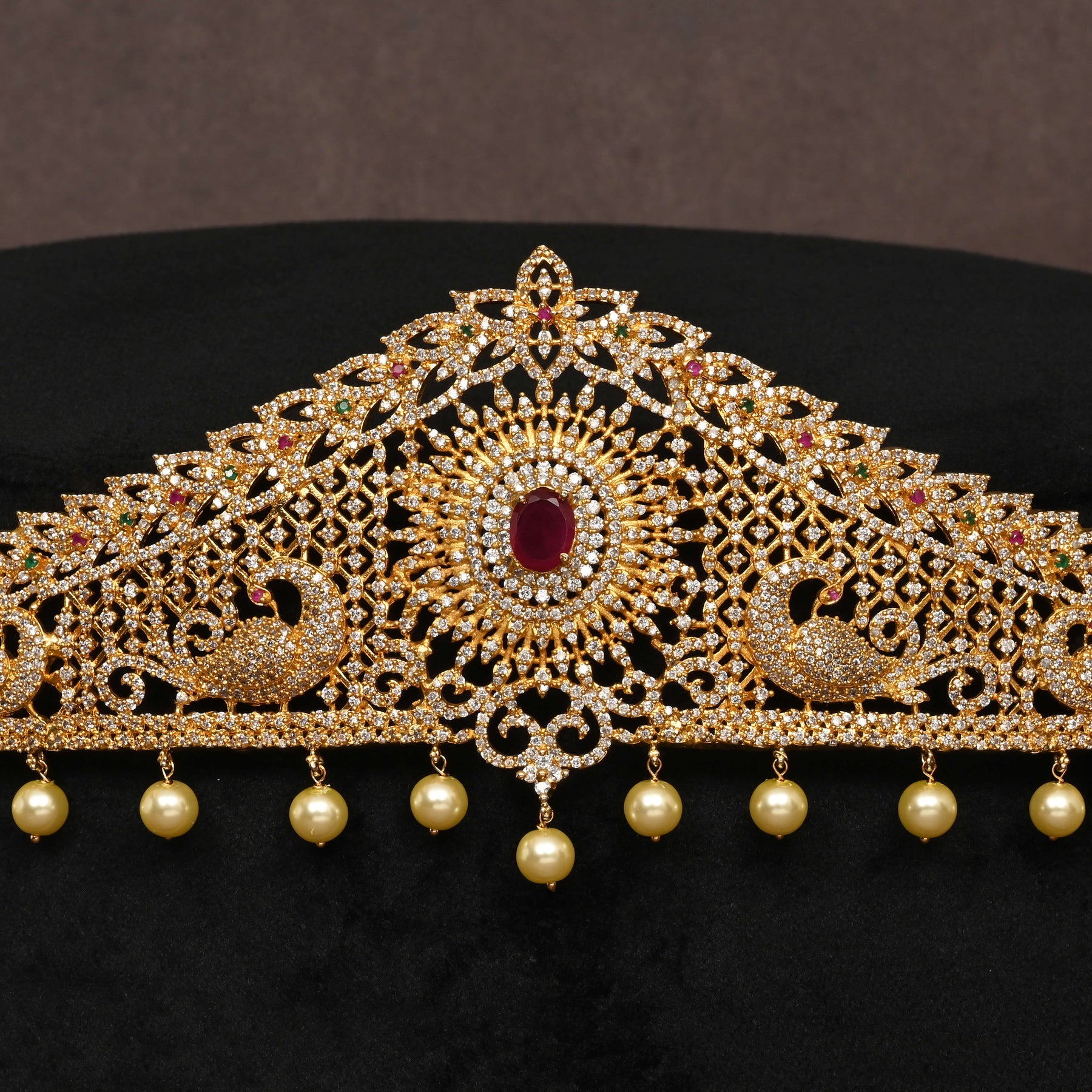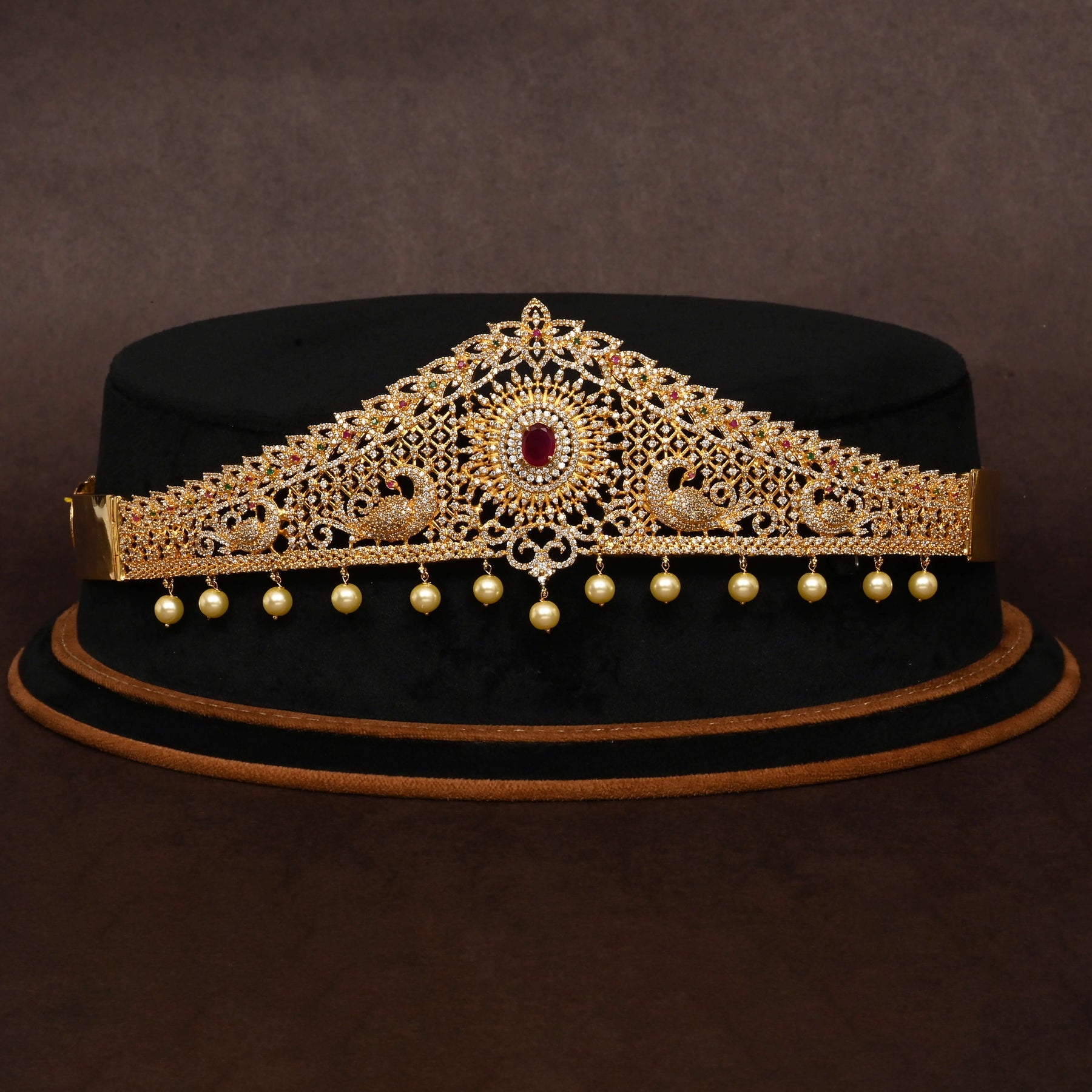 This CZ Vaddanam showcases expert craftsmanship with a luxurious gold finish and genuine CZ stones that add radiant sparkle. Accented with semi-precious ruby stones, it offers a striking contrast that enhances its elegance. Designed to resemble fine gold jewelry, this handcrafted piece features a unique, one-of-a-kind design, making it a distinguished addition to any traditional collection. Perfect for those seeking quality and exclusivity in their adornments.