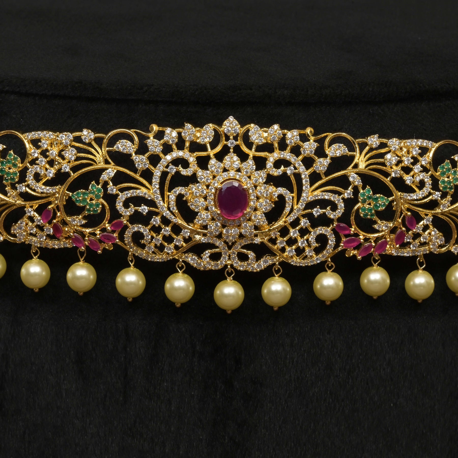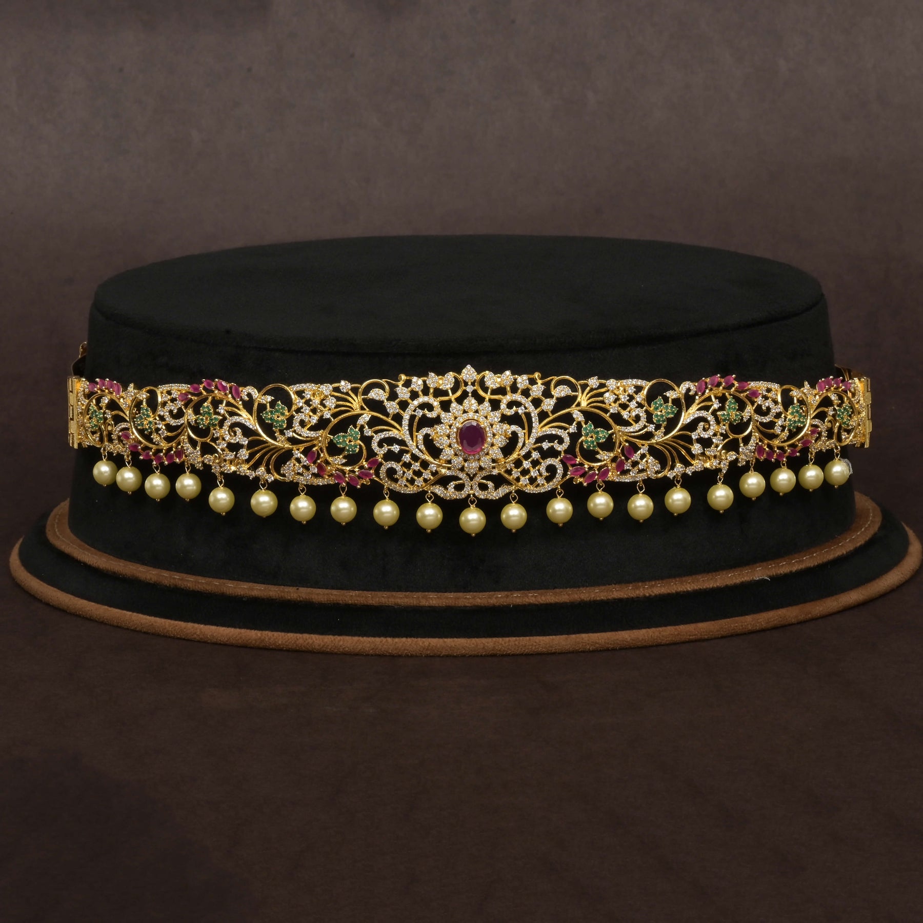 This CZ Vaddanam features a radiant gold finish paired with genuine cubic zirconia stones, offering the luxe appearance of real gold at an accessible value. Expertly handcrafted, each piece showcases a unique design that blends traditional elegance with contemporary craftsmanship. Ideal for those seeking a distinctive statement accessory that highlights fine detailing and superior artistry.