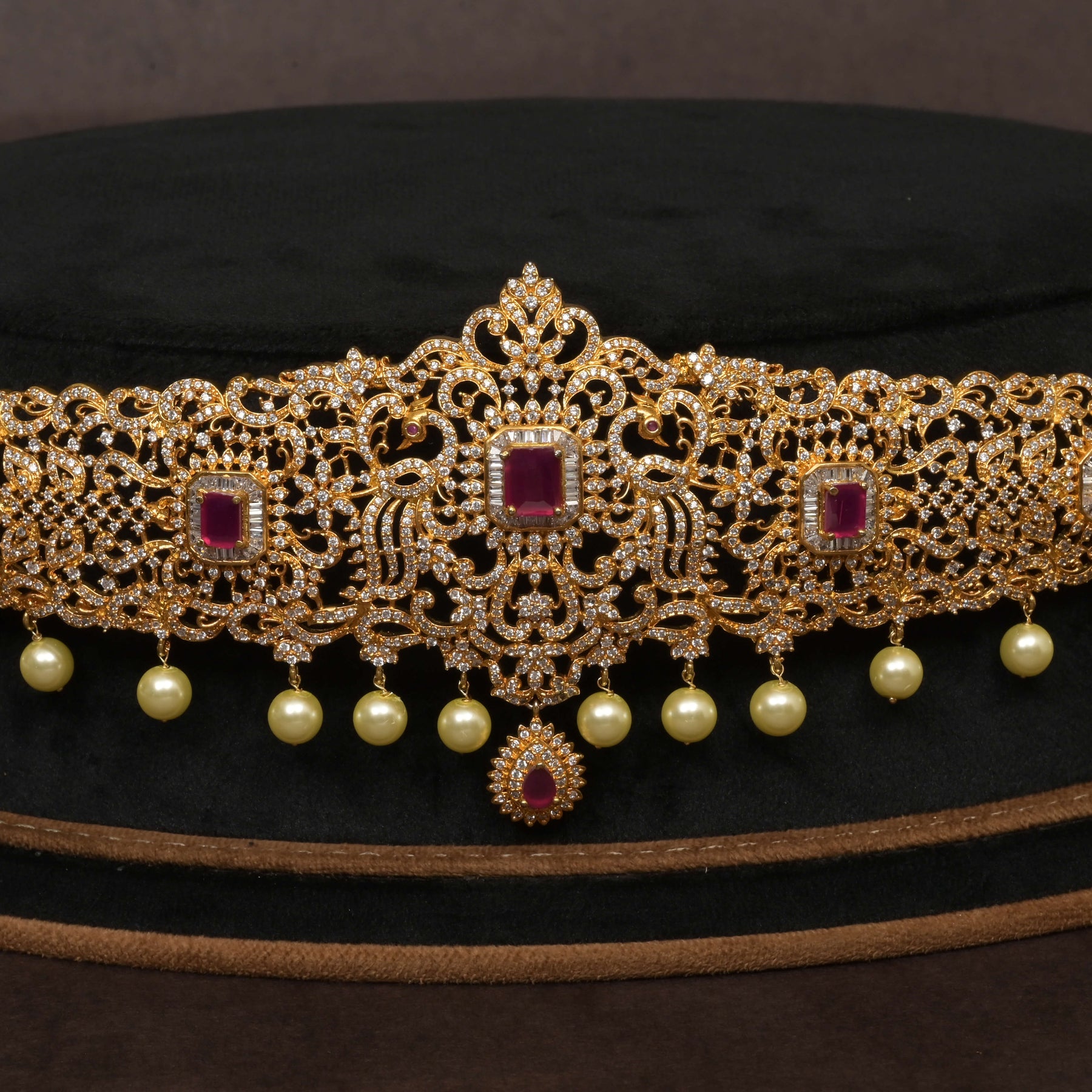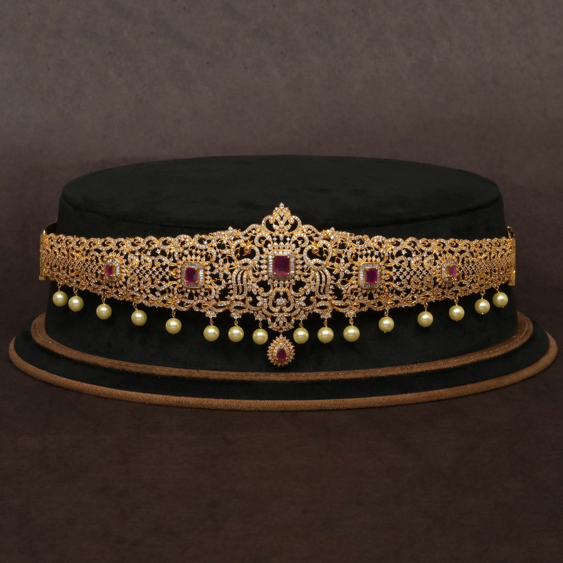 Elevate traditional elegance with the CZ Vaddanam, featuring a stunning gold finish that mimics authentic gold craftsmanship. Handcrafted to perfection, this unique piece showcases genuine cubic zirconia stones and vibrant semi-precious ruby accents, offering an exquisite blend of sparkle and color. Its one-of-a-kind design ensures exclusivity, making it an ideal choice for special occasions where timeless beauty meets expert artistry.