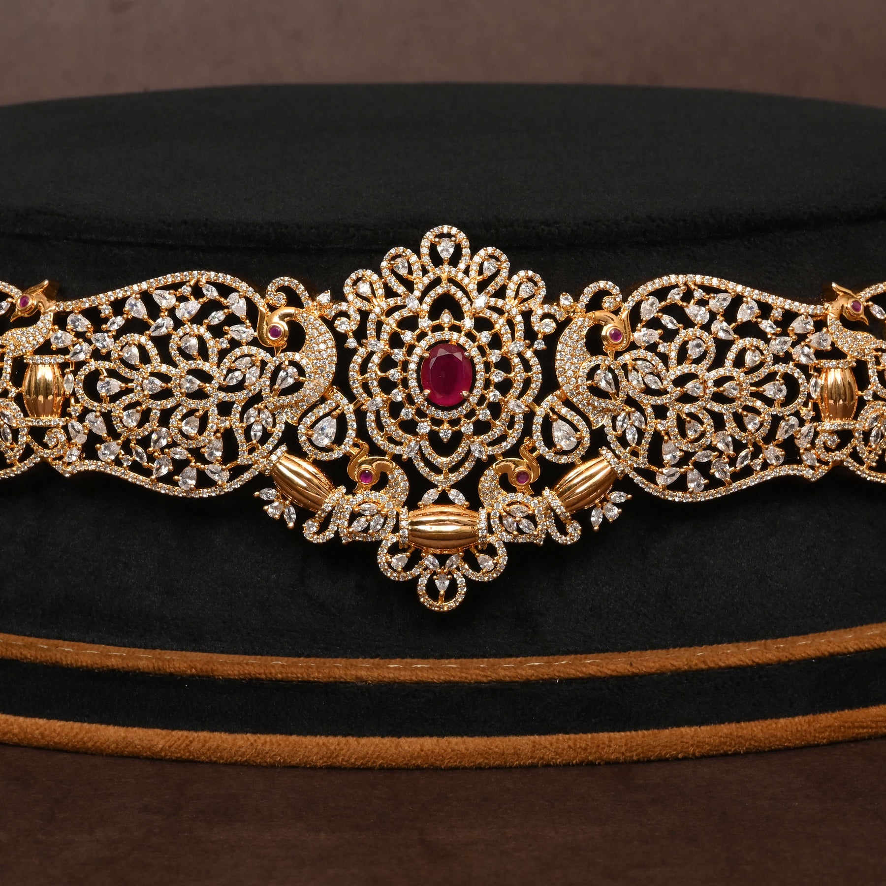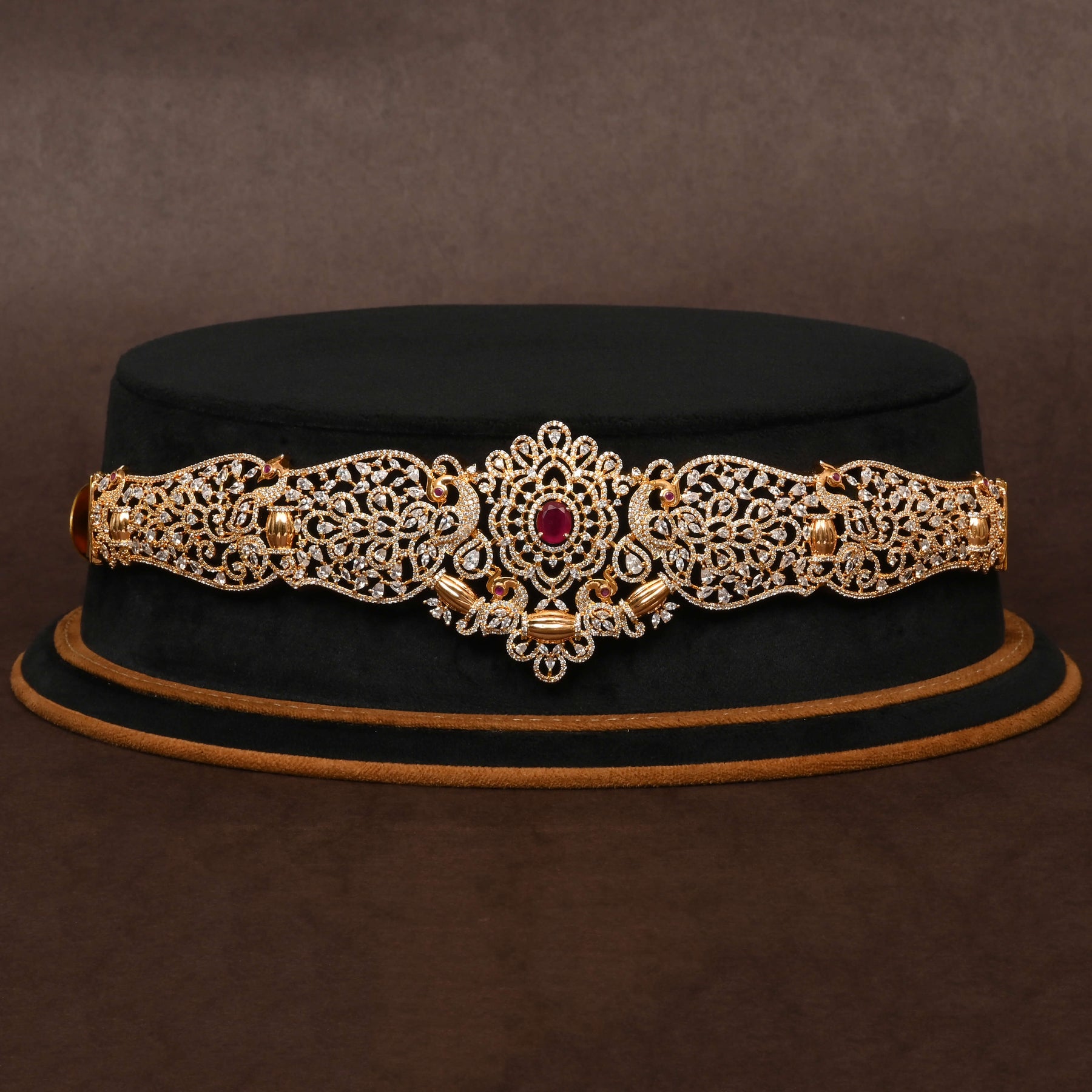 This CZ Vaddanam expertly combines the rich allure of a gold finish with the brilliance of real cubic zirconia stones and semi-precious ruby accents. Handcrafted with meticulous attention to detail, it showcases a one-of-a-kind design that radiates elegance and tradition. The gold-like appearance complements any ethnic ensemble, making it a timeless piece for special occasions.