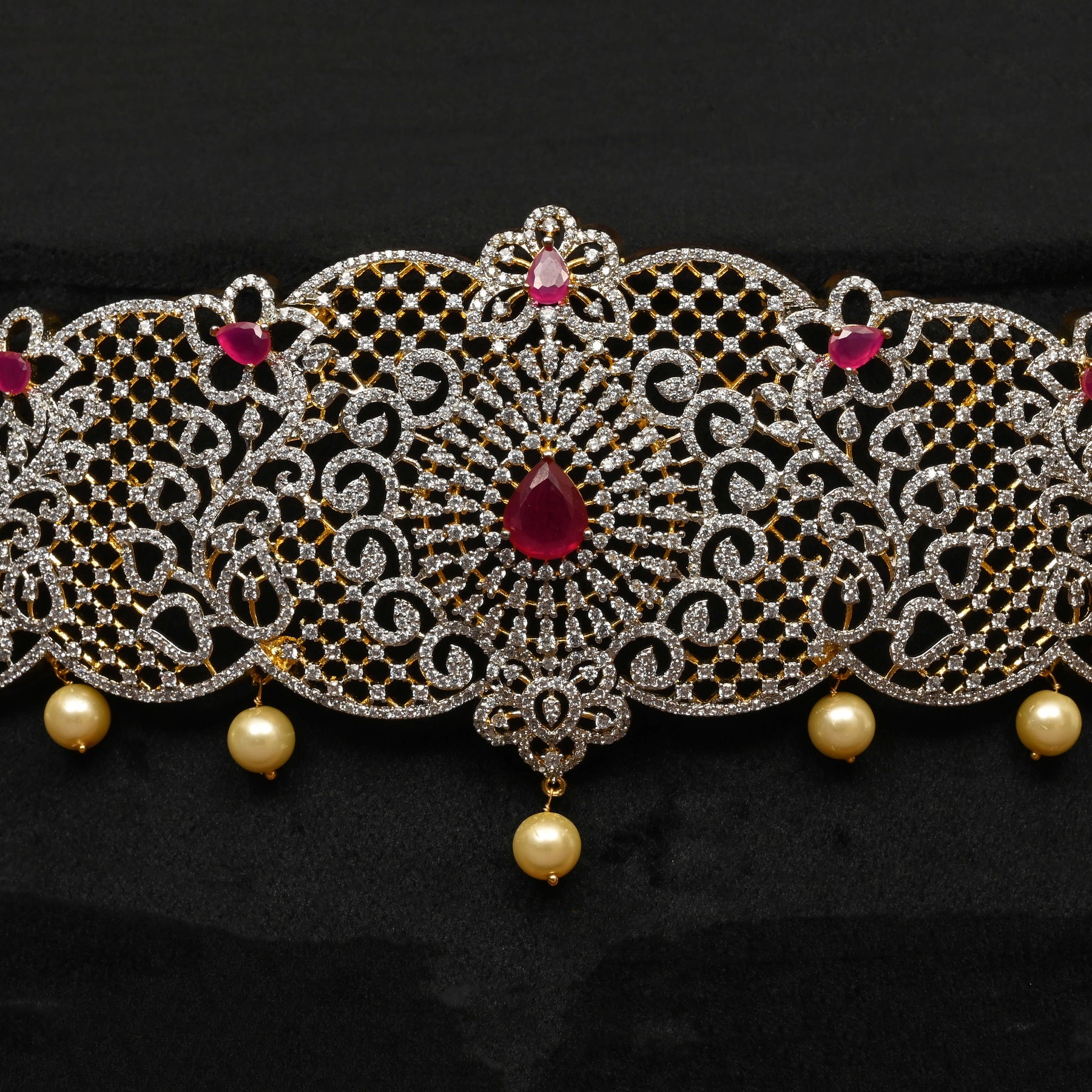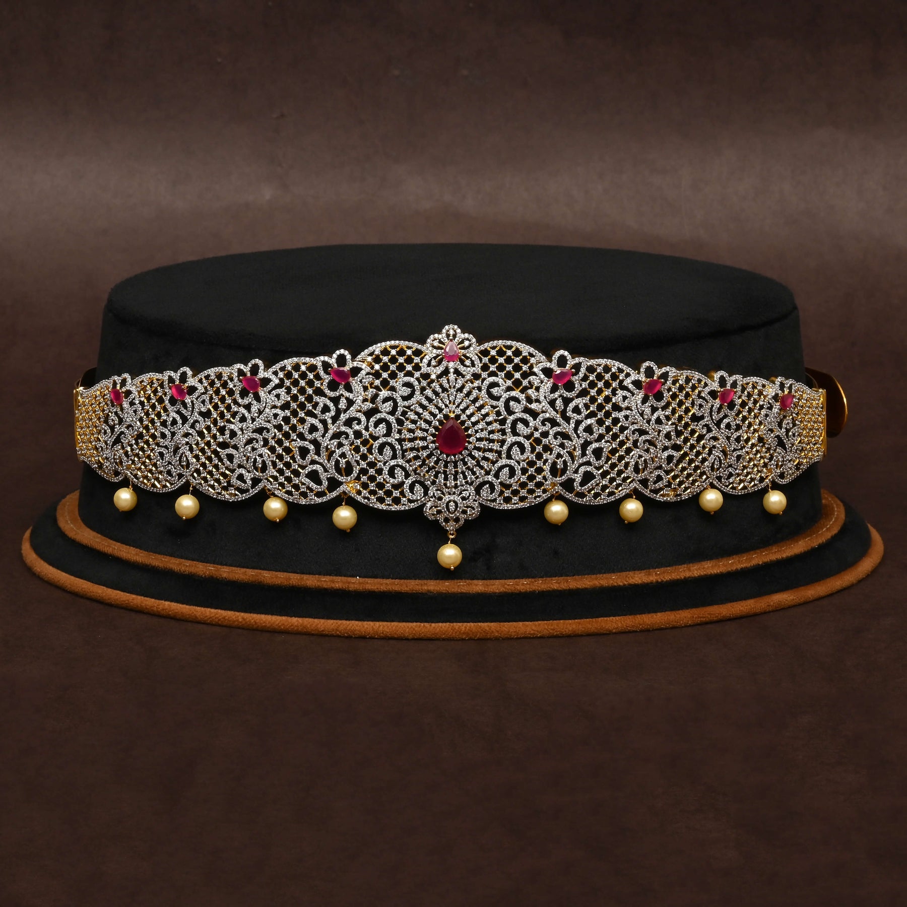 Elevate traditional elegance with this handcrafted CZ Vaddanam featuring a stunning diamond finish. Adorned with genuine CZ stones and accented by a semi-precious ruby, this exquisite piece showcases meticulous craftsmanship and a unique design. Perfect for those seeking a one-of-a-kind accessory that blends timeless beauty with modern sophistication.
