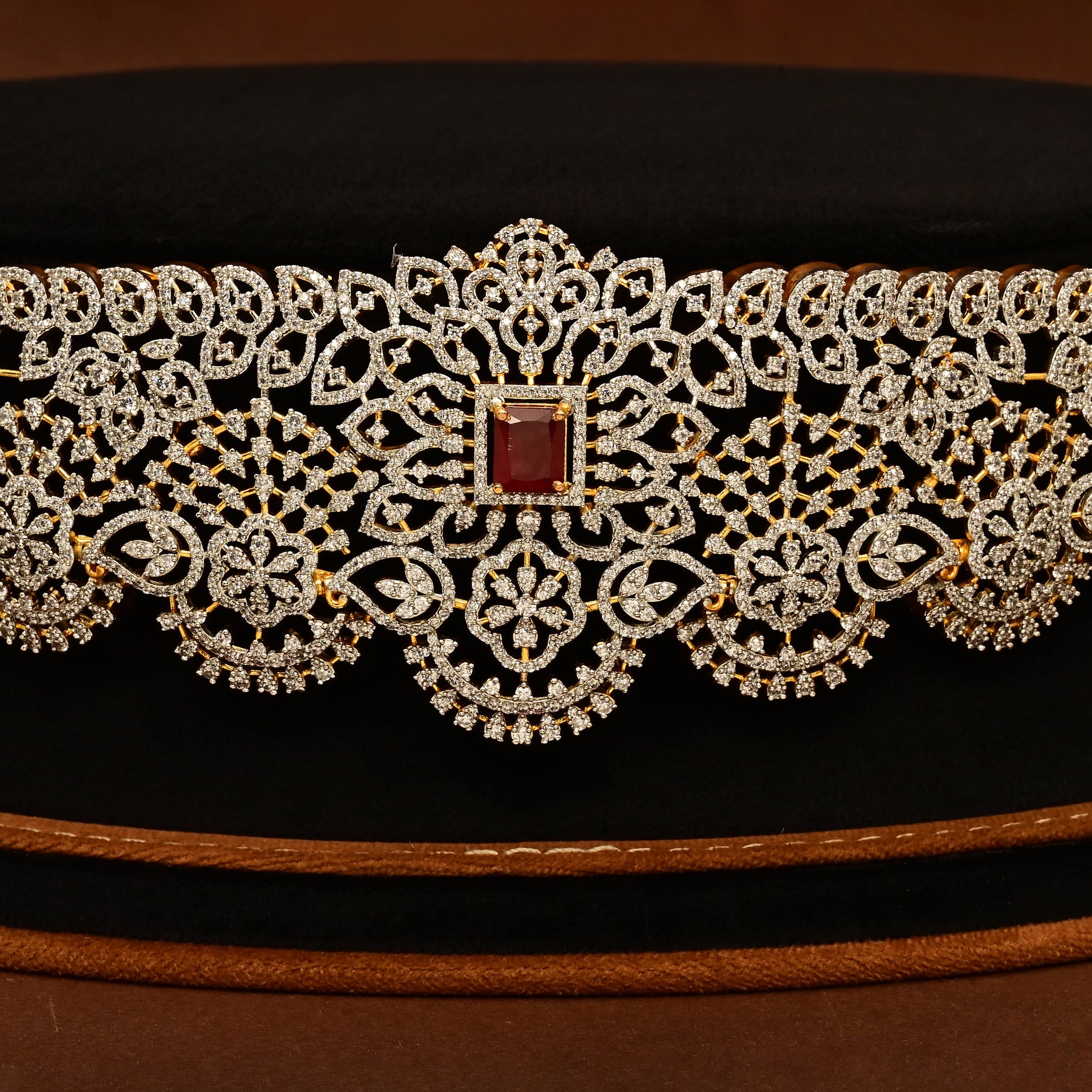 This CZ Vaddanam showcases a refined gold finish and features genuine CZ stones paired with semi-precious ruby accents. Handcrafted with precision, its exclusive, one-of-a-kind design reflects exceptional artistry, ideal for adding an elegant and distinctive touch to your traditional ensemble.