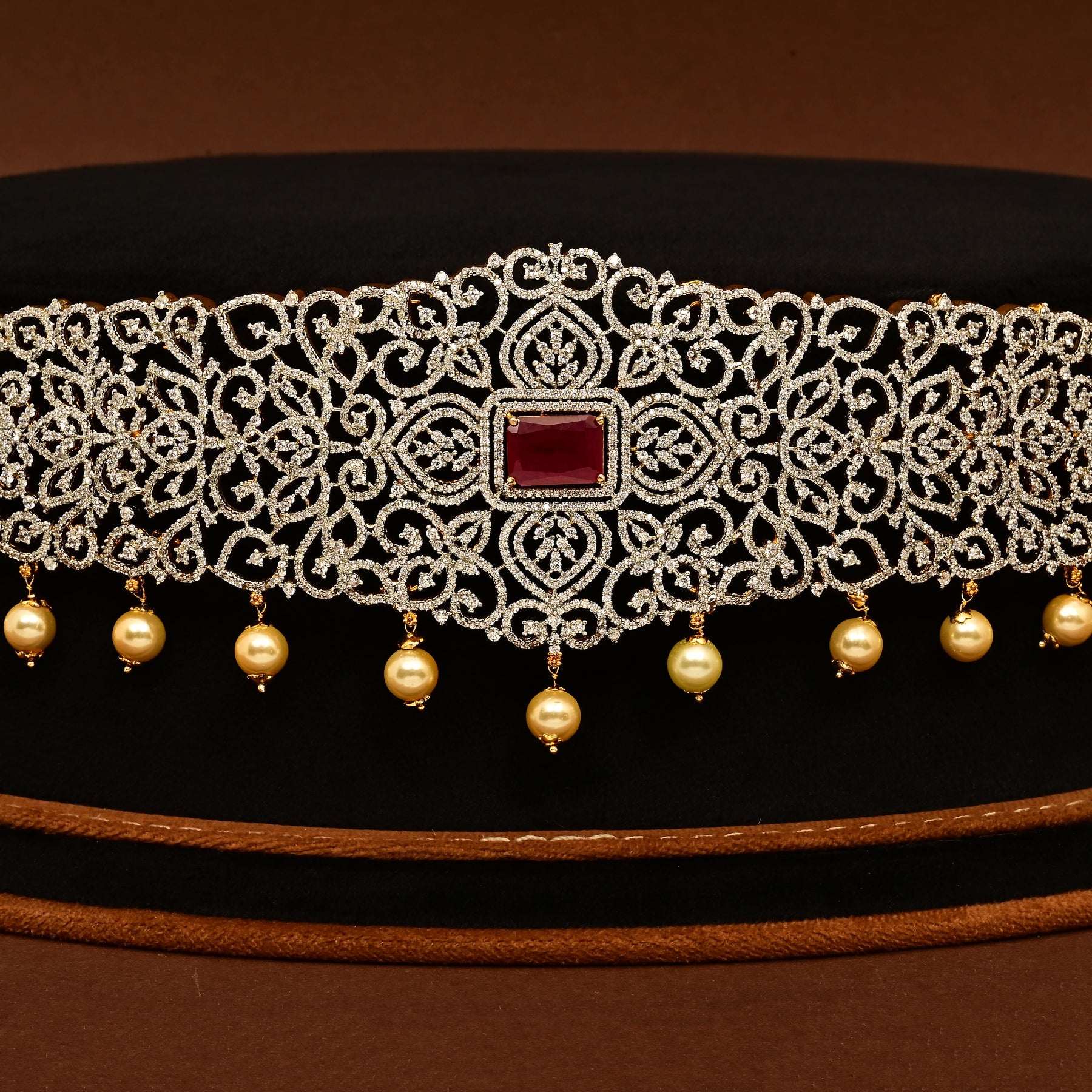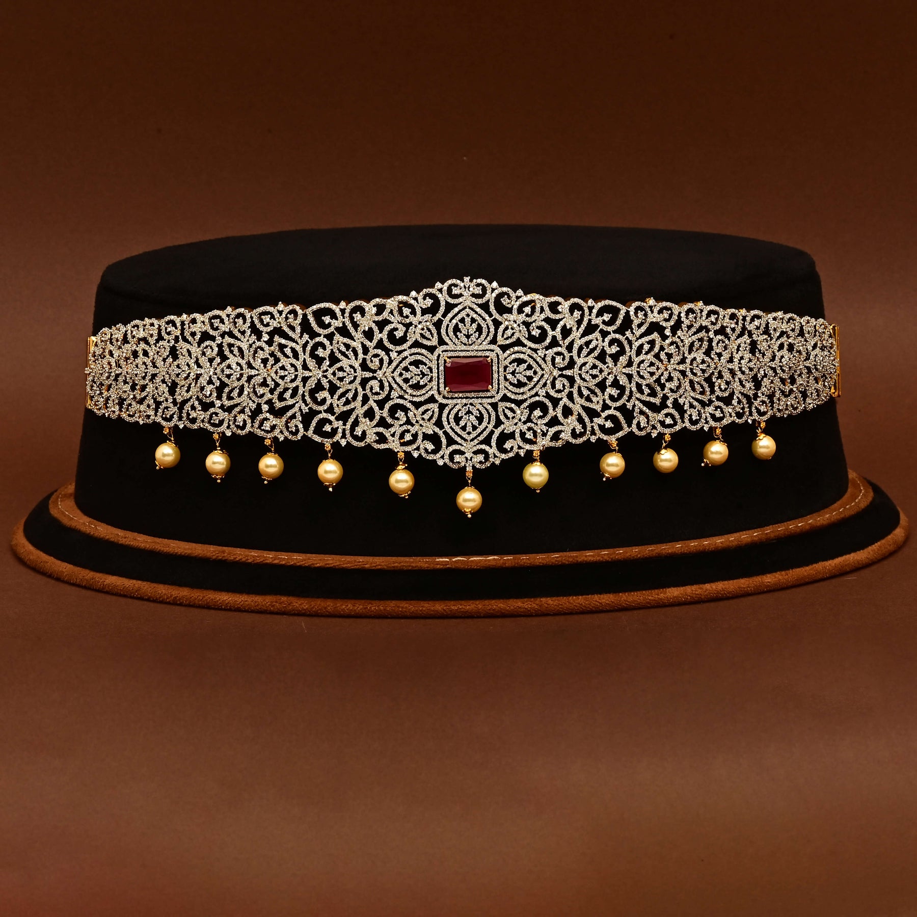 This CZ Vaddanam features a gold finish and is meticulously handcrafted with real cubic zirconia stones and semi-precious ruby accents. Its unique, one-of-a-kind design combines elegance with traditional craftsmanship, making it a perfect statement piece for special occasions.
