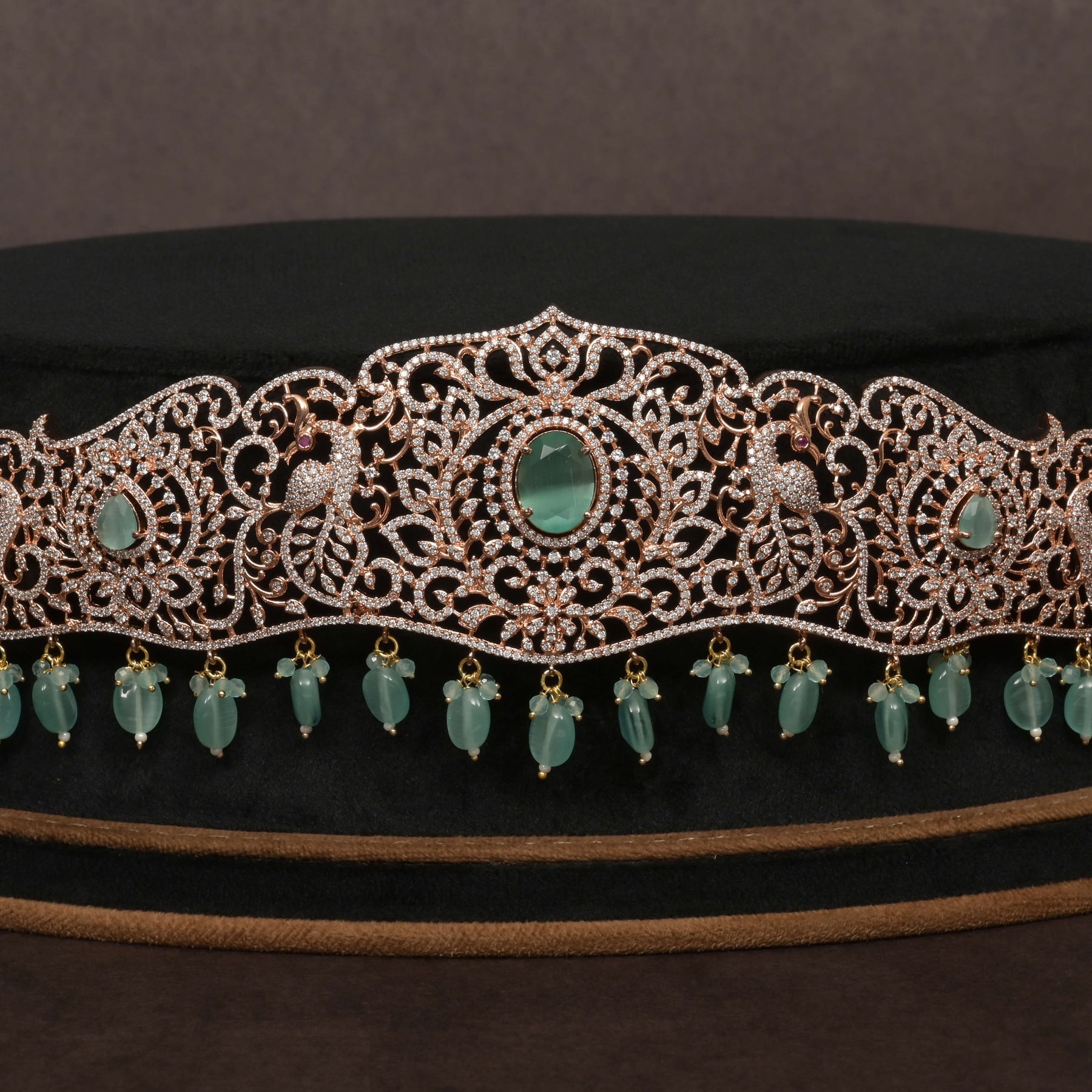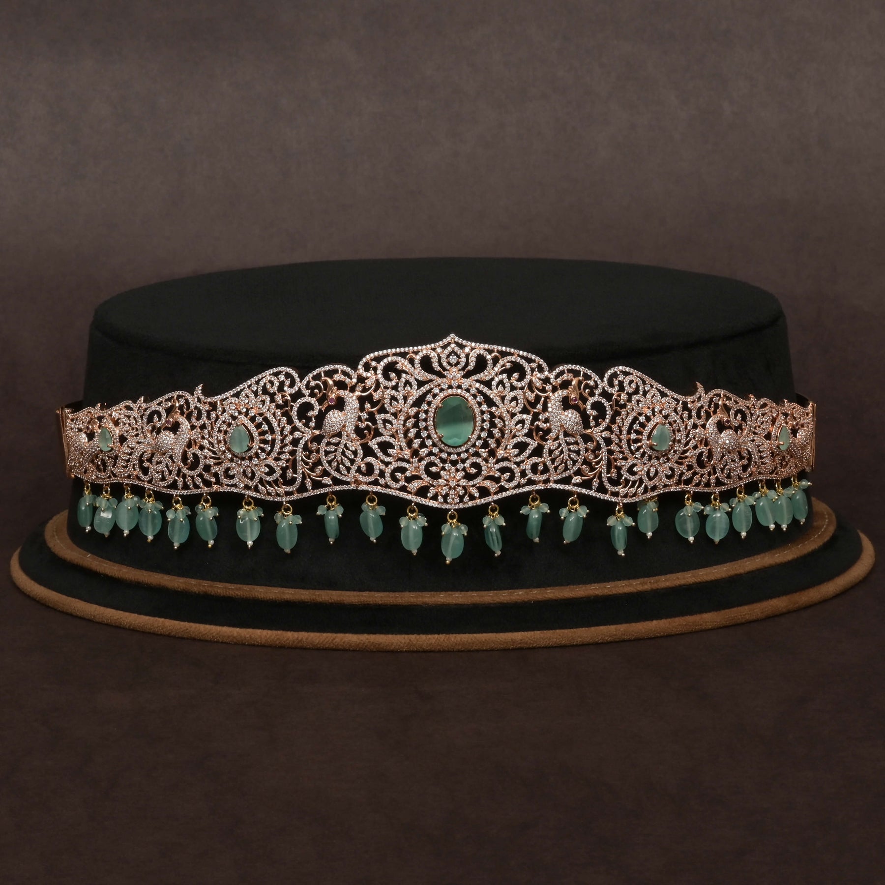 This CZ Vaddanam showcases a gold-finish handcrafted design, expertly crafted to resemble real diamond brilliance. Featuring genuine cubic zirconia stones and semi-precious mint stones, it offers a luxurious yet accessible alternative to traditional diamond jewelry. Its unique, one-of-a-kind design highlights meticulous workmanship, making it an exceptional statement piece for discerning collectors.