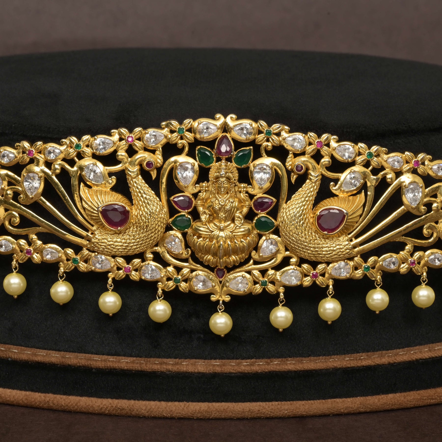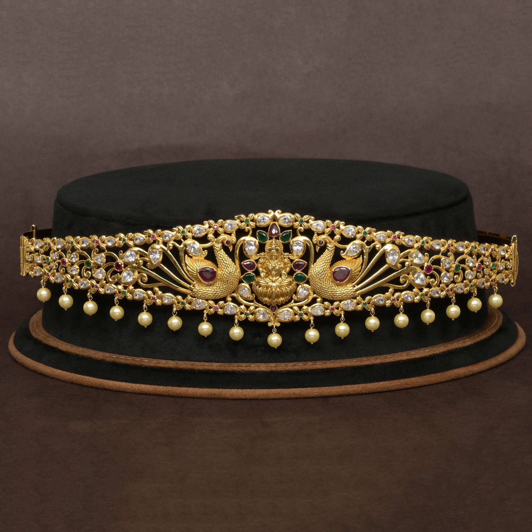 Experience elegance with the CZ Vaddanam, featuring a radiant gold finish and authentic CZ stones that mimic the brilliance of real gold. Handcrafted with meticulous attention, each piece showcases a unique design that sets it apart. Perfect for those seeking a luxurious, one-of-a-kind accessory that combines traditional craftsmanship with contemporary charm.