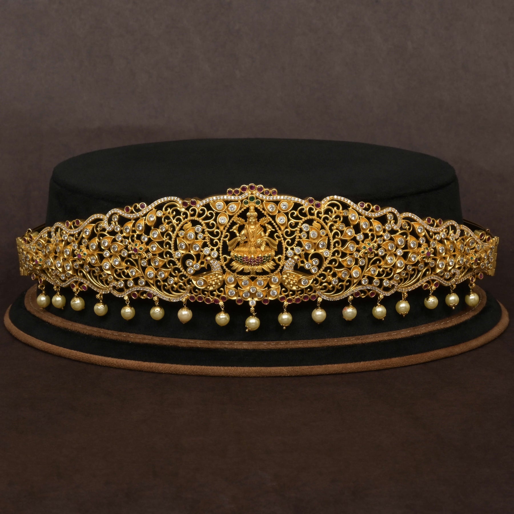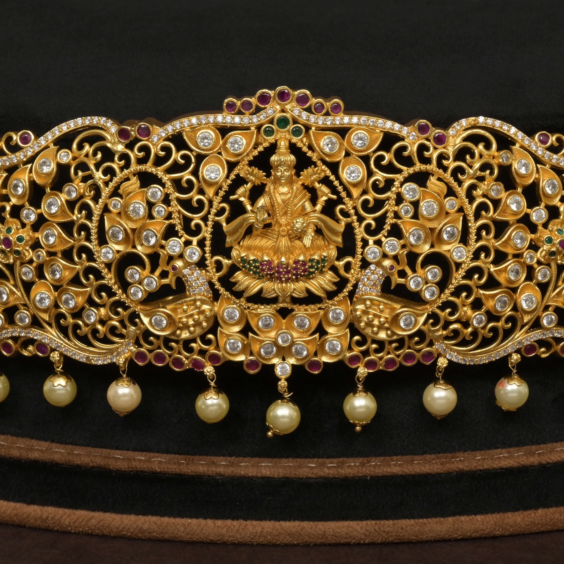 This CZ Vaddanam features a stunning gold finish that beautifully mimics real gold, showcasing exquisite craftsmanship. Adorned with genuine CZ stones and an intricately handcrafted design inspired by Goddess Lakshmi, it offers a unique, one-of-a-kind piece that combines traditional elegance with enduring style. Perfect for special occasions, this Vaddanam delivers the luxurious look of gold with the brilliance of fine detailing.