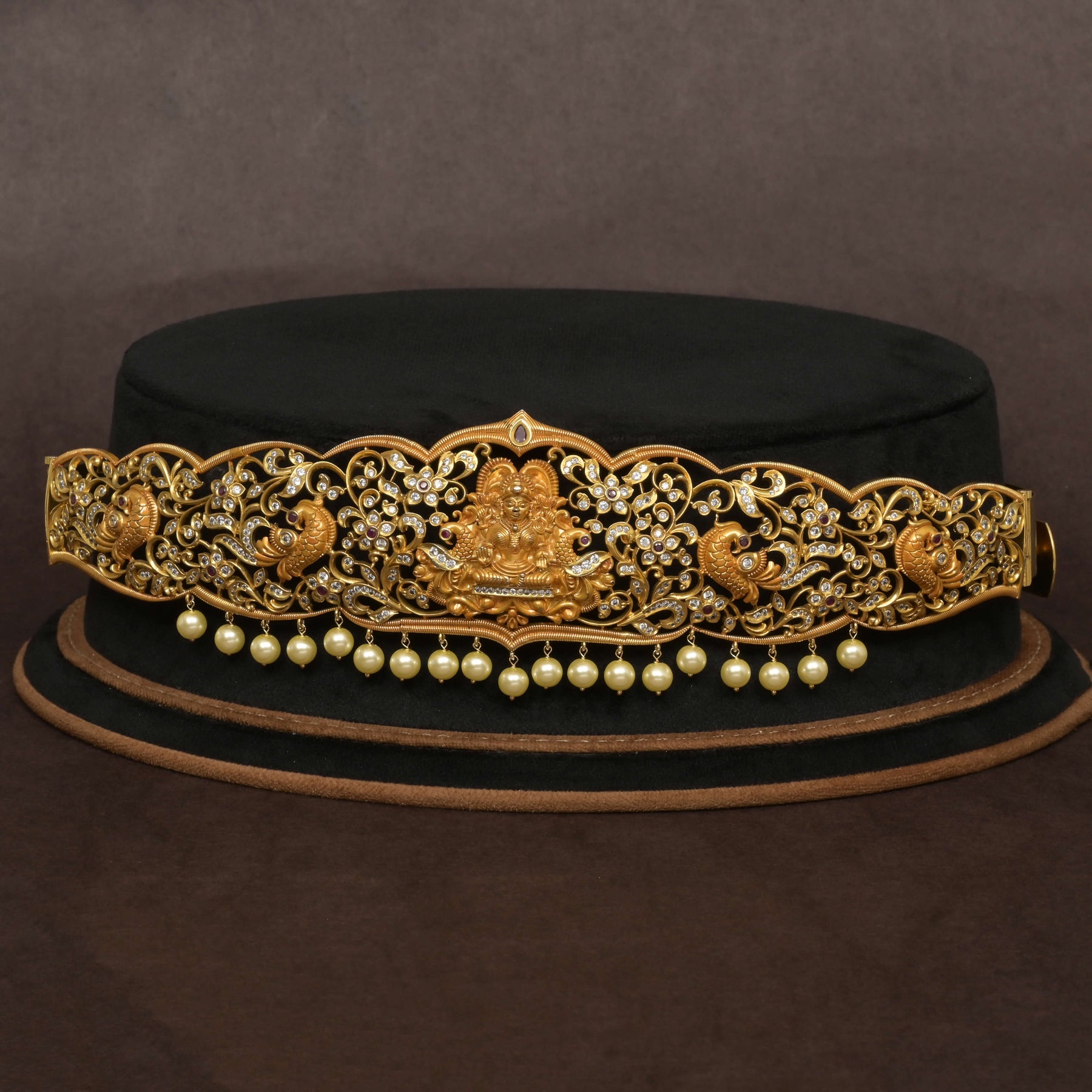 This exquisite CZ Vaddanam features a meticulously handcrafted design that captures the divine elegance of Goddess Lakshmi. Set with genuine CZ stones, it radiates a stunning gold-like finish, offering a rich, traditional appearance without compromising durability. Unique and one of a kind, this piece blends timeless artistry with refined craftsmanship, making it an exceptional accessory for special occasions.
