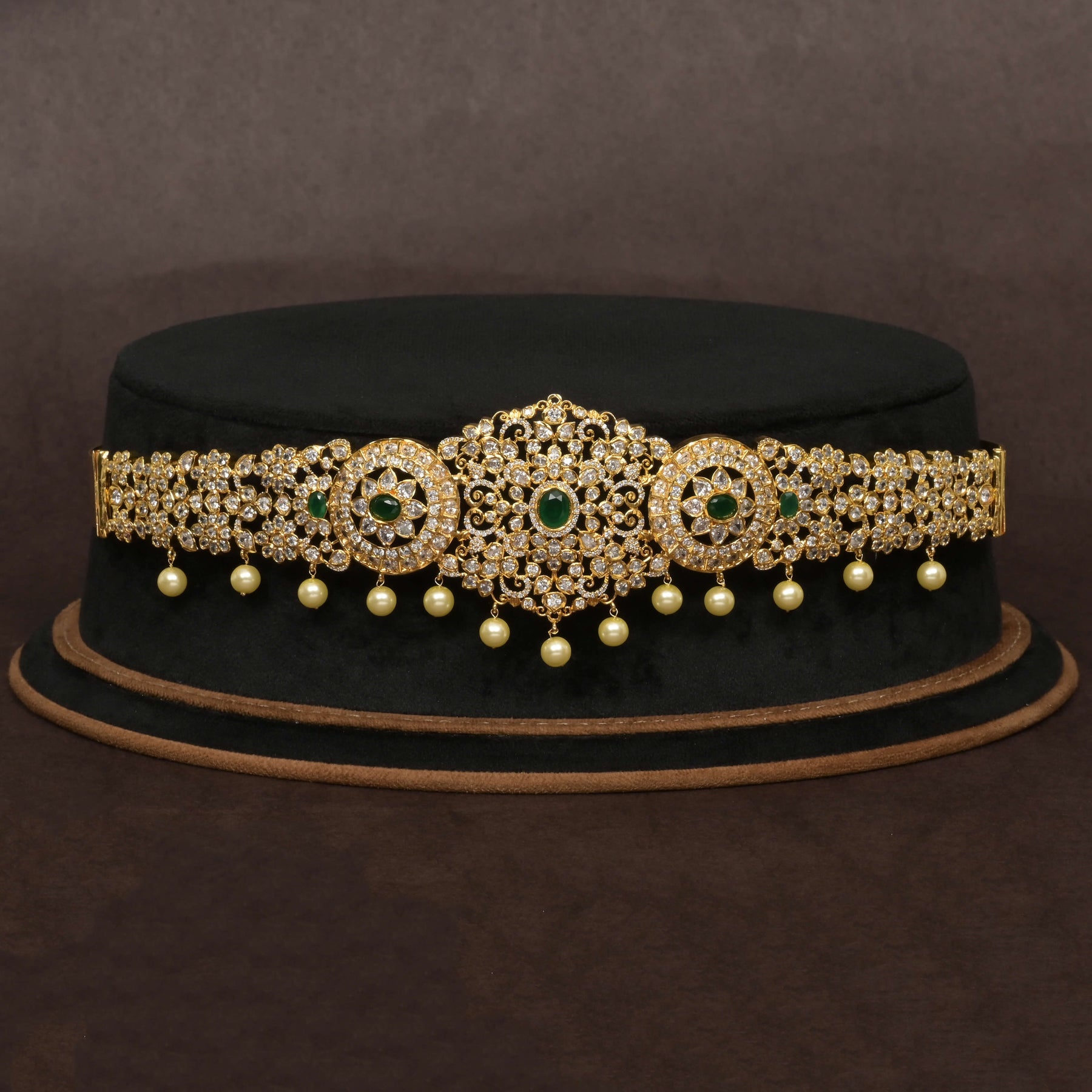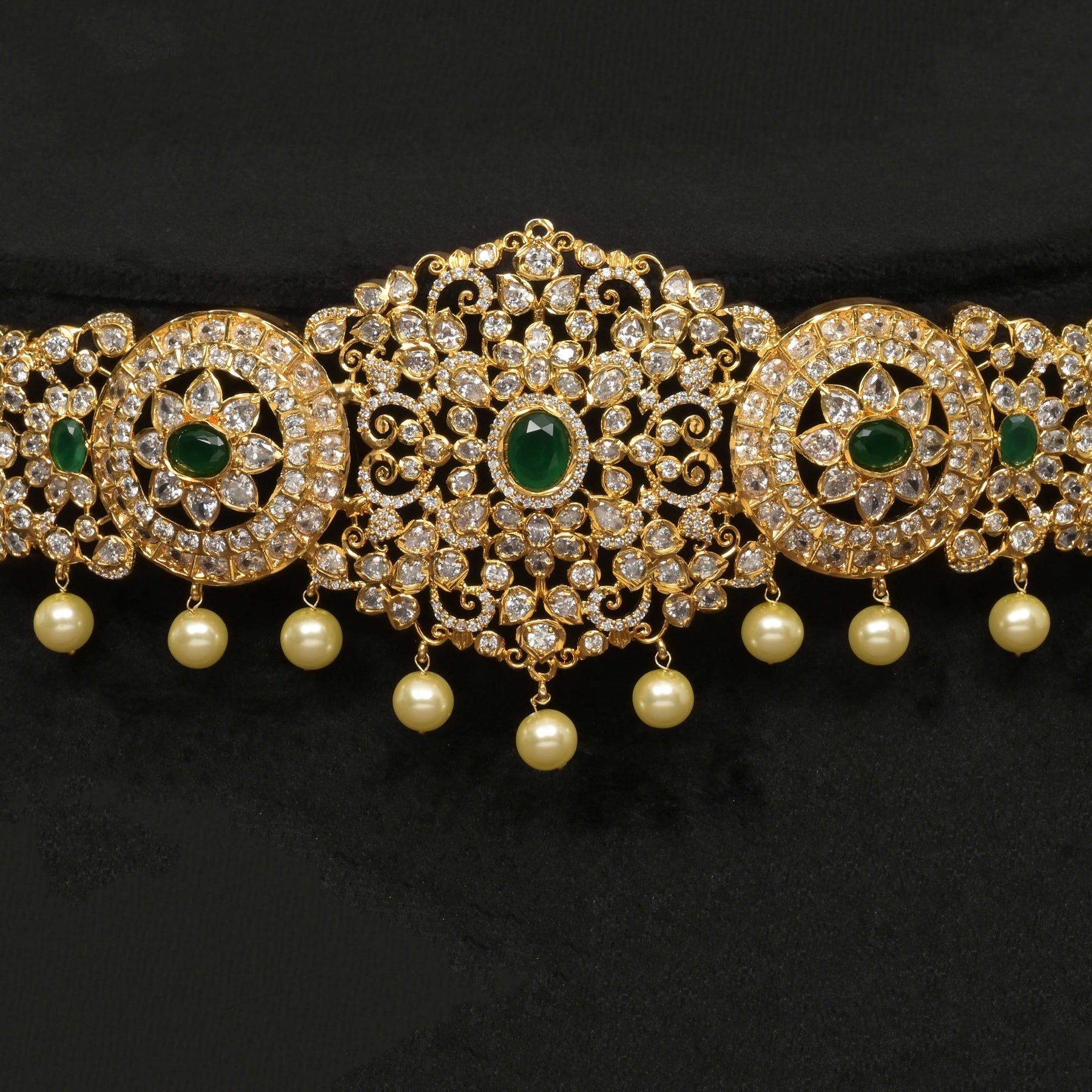 This CZ Vaddanam features a radiant gold finish complemented by genuine cubic zirconia stones and semi-precious emerald accents. Handcrafted with meticulous attention to detail, its unique design offers an exquisite and timeless aesthetic that emulates the richness of real gold jewelry. Perfect for those seeking a distinctive piece that combines elegance with exceptional craftsmanship.
