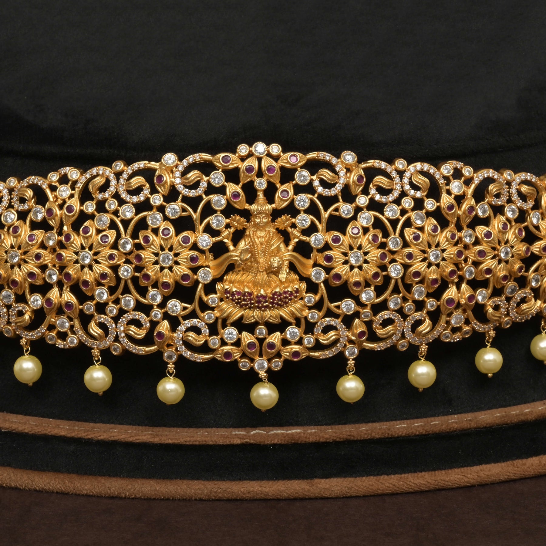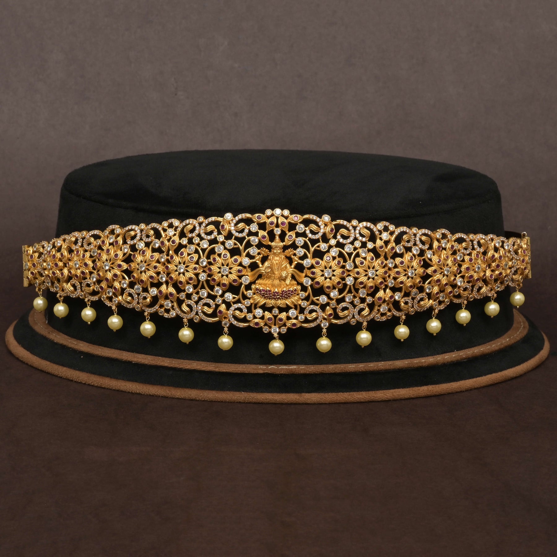 This CZ Vaddanam features a stunning Lakshmi Goddess design, meticulously handcrafted to showcase intricate artistry. Adorned with real cubic zirconia stones, it offers the rich look of gold with lasting elegance. Its one-of-a-kind design makes it a distinguished piece, perfect for traditional occasions and celebrations. Experience the blend of craftsmanship and timeless beauty with this exquisite accessory.