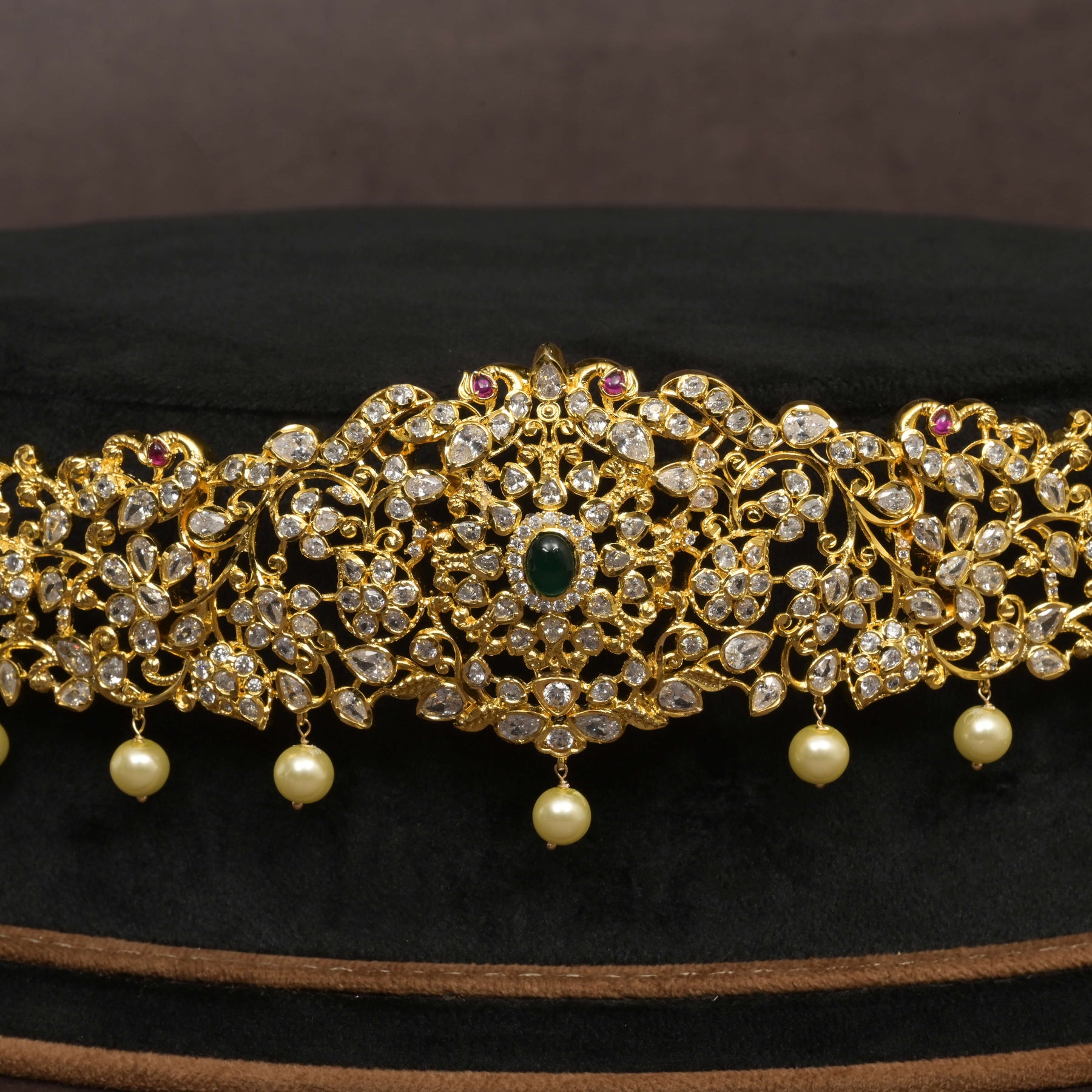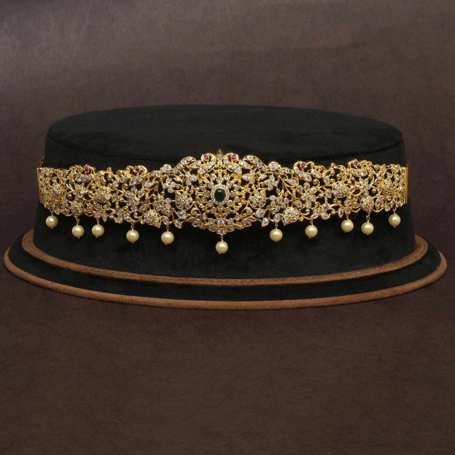 This exquisite CZ Vaddanam features a luxurious gold finish that beautifully mimics authentic gold craftsmanship. Adorned with sparkling real cubic zirconia stones and semi-precious emerald accents, it combines elegance with vibrant color. Each piece is handcrafted with meticulous attention to detail, resulting in a unique design that stands out as a one-of-a-kind treasure, perfect for adding a regal touch to your traditional attire.
