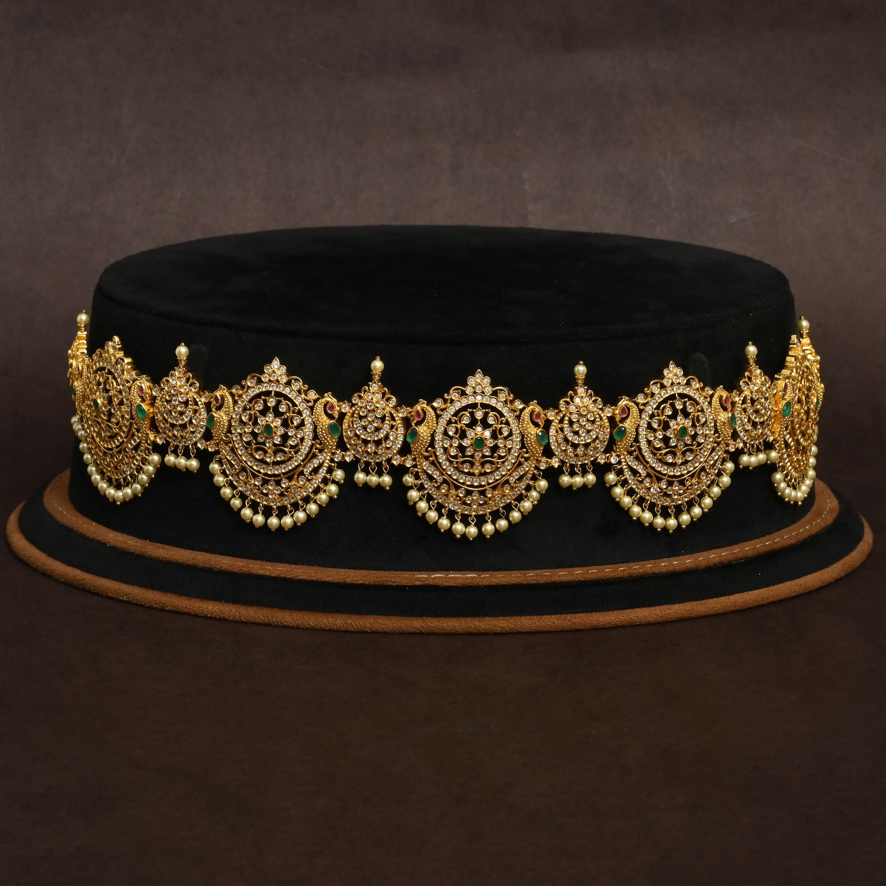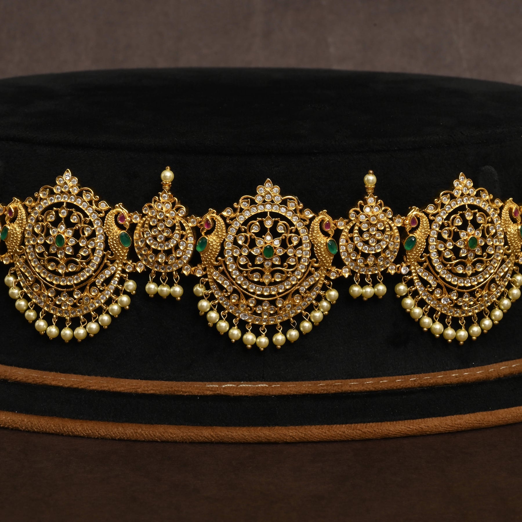 Elevate your traditional ensemble with this exquisite Chain Vaddanam, meticulously handcrafted in lustrous gold finish. Adorned with authentic cubic zirconia stones that capture light with brilliant sparkle, each piece showcases a distinctive one-of-a-kind design. The intricate chain work demonstrates superior craftsmanship, making it an ideal choice for festive occasions and special celebrations. A timeless accessory that seamlessly blends heritage elegance with contemporary artistry.