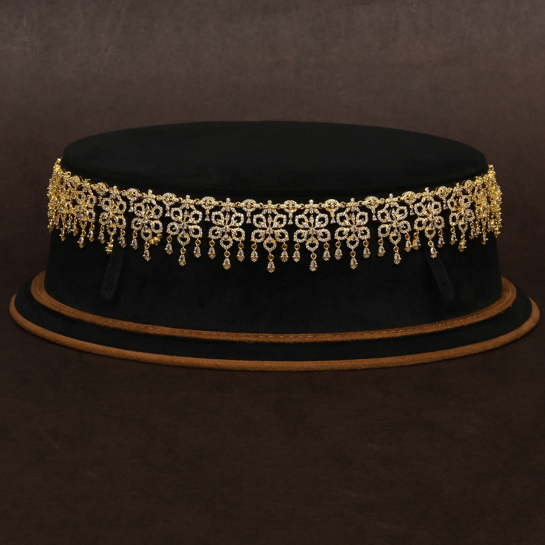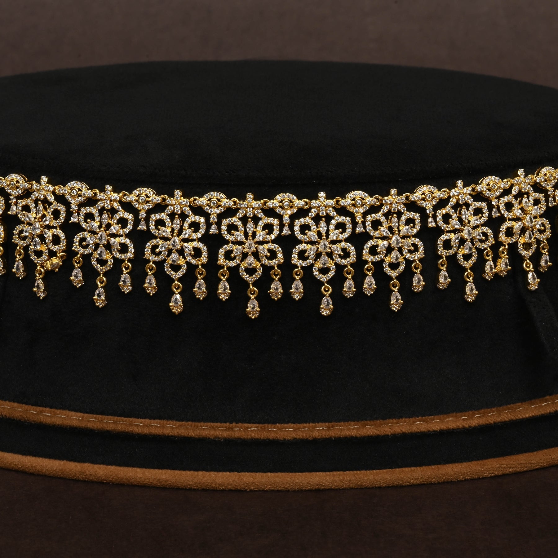 Elevate your traditional ensemble with this exquisite Chain Vaddanam, meticulously handcrafted in lustrous gold finish. Adorned with authentic cubic zirconia stones that capture light with brilliant sparkle, each piece showcases a distinctive one-of-a-kind design. The intricate chain work demonstrates superior craftsmanship, making it an ideal choice for festive occasions and special celebrations. A timeless accessory that seamlessly blends heritage elegance with contemporary artistry.