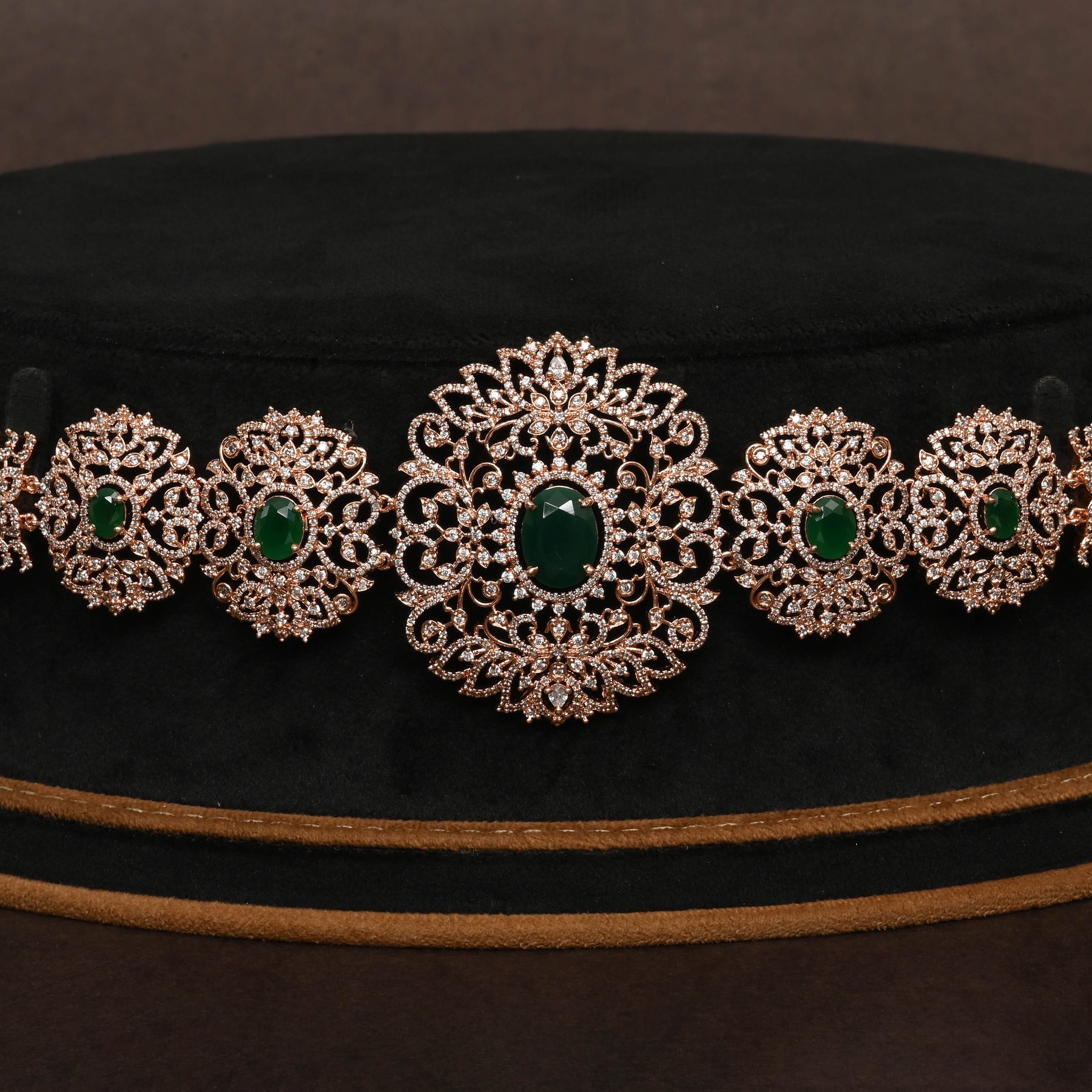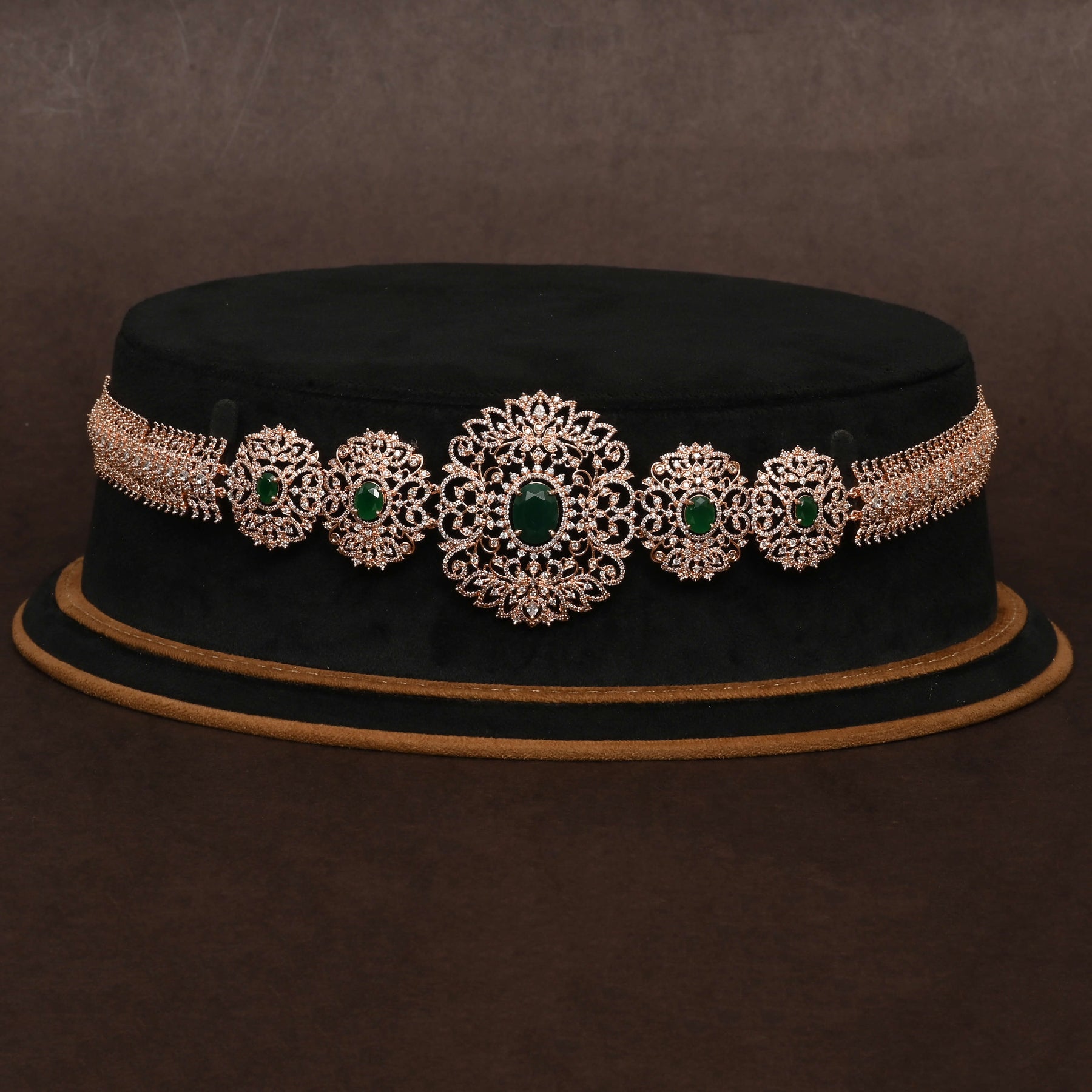 Elevate your traditional ensemble with this exquisite Rose Gold Finish Vaddanam, meticulously handcrafted to showcase authentic CZ stones that deliver a stunning diamond-like brilliance. Each piece is a one-of-a-kind design, combining timeless craftsmanship with contemporary elegance. The lustrous rose gold finish enhances the sparkle of the stones, creating an heirloom-quality accessory that complements both festive occasions and everyday wear. A testament to fine jewelry artistry, this vaddanam captures light beautifully while maintaining the sophistication you deserve.