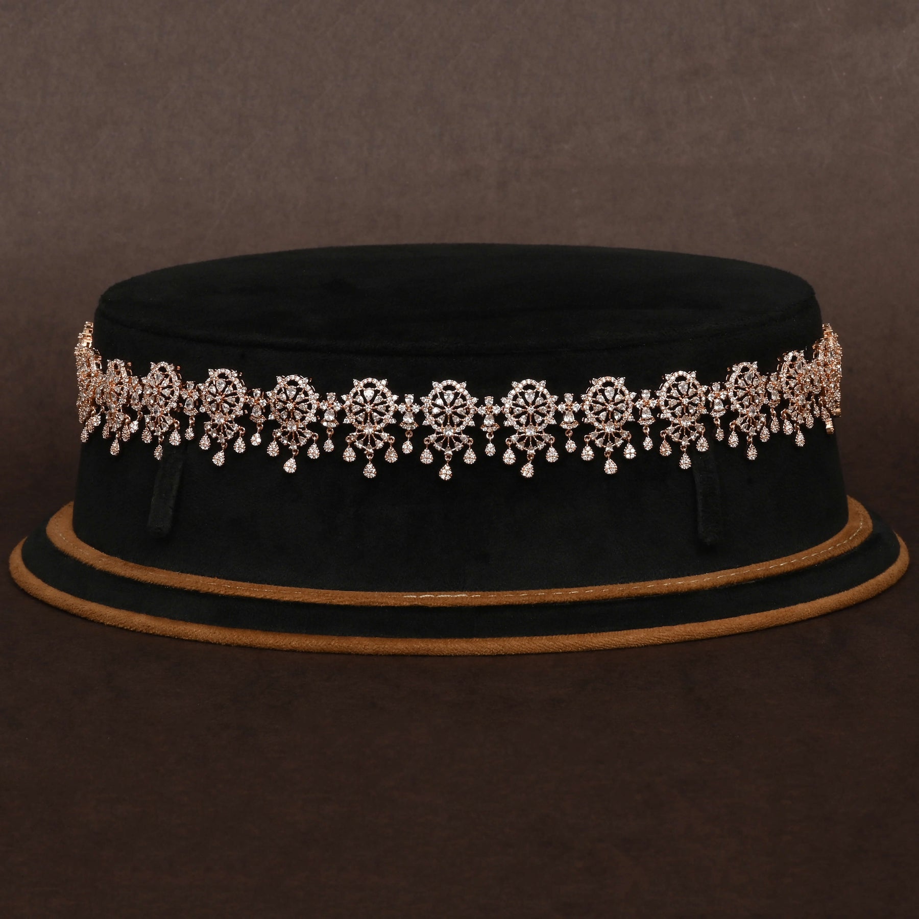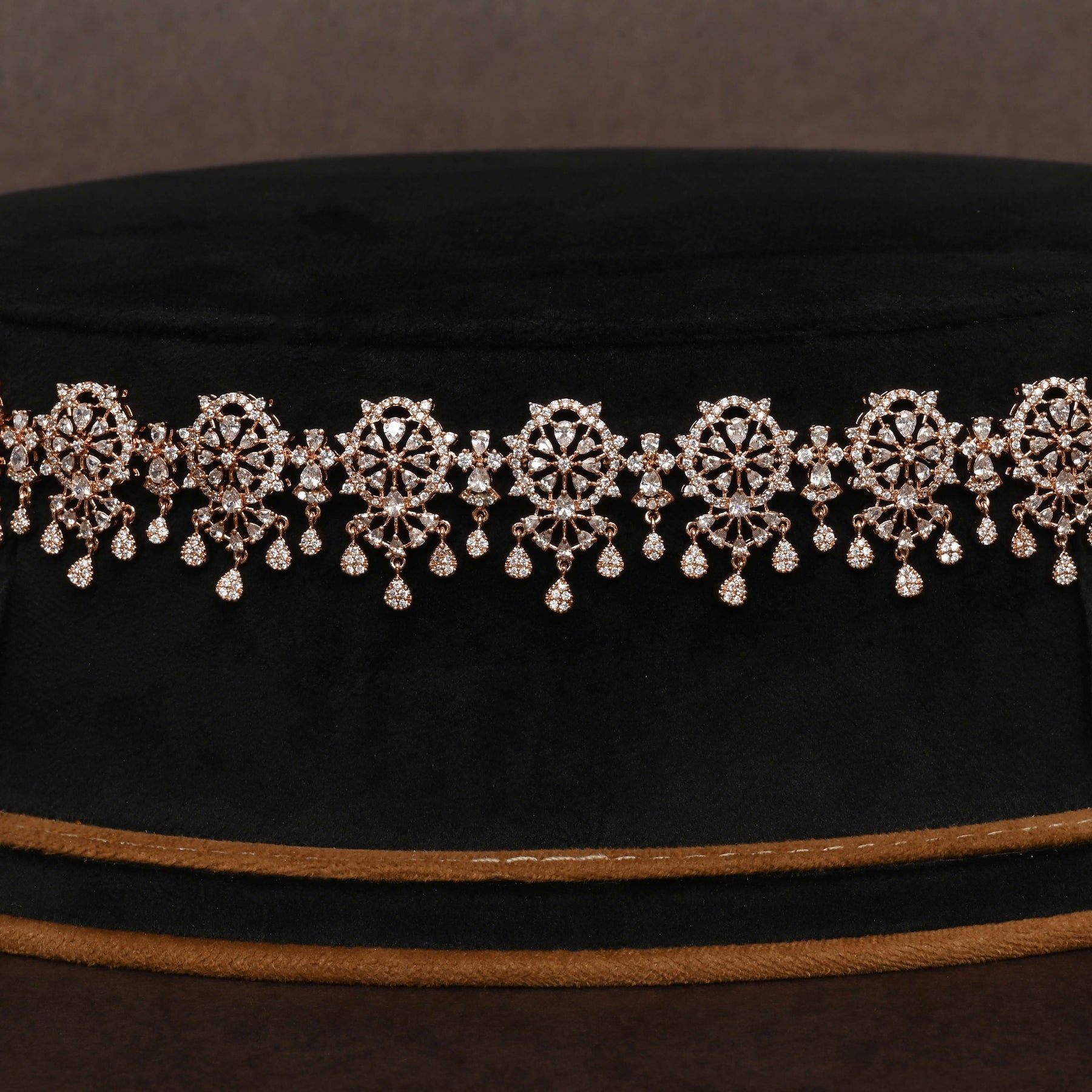 Elevate your traditional ensemble with this exquisite Rose Gold Finish Vaddanam, a handcrafted waist ornament that captures timeless elegance. Adorned with authentic cubic zirconia stones that deliver a stunning diamond-like brilliance, each piece showcases meticulous artisanal craftsmanship. The lustrous rose gold finish adds warmth and sophistication to your festive look. As a one-of-a-kind design, this vaddanam combines heritage aesthetics with contemporary allure, making it an investment-worthy addition to your fine jewellery collection.