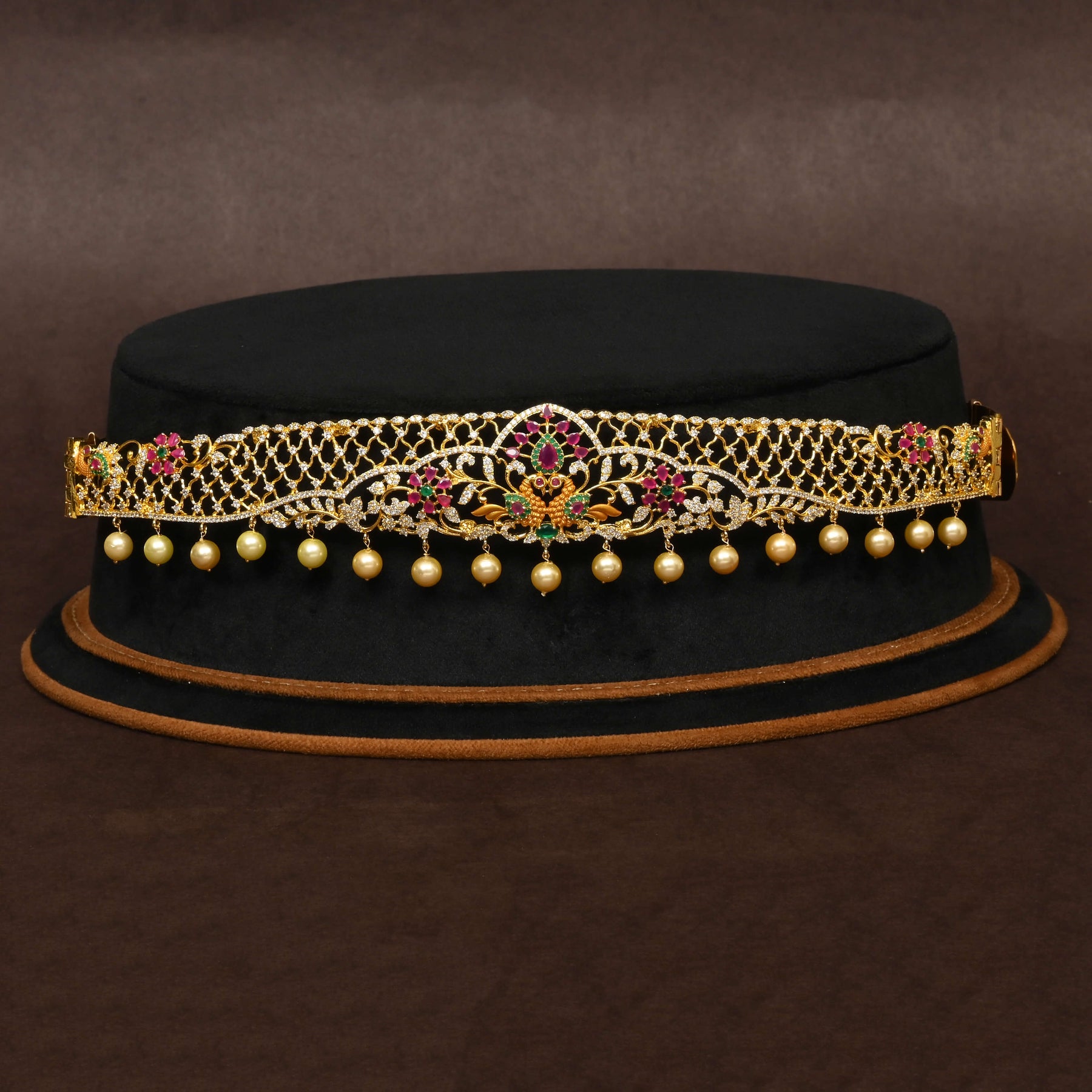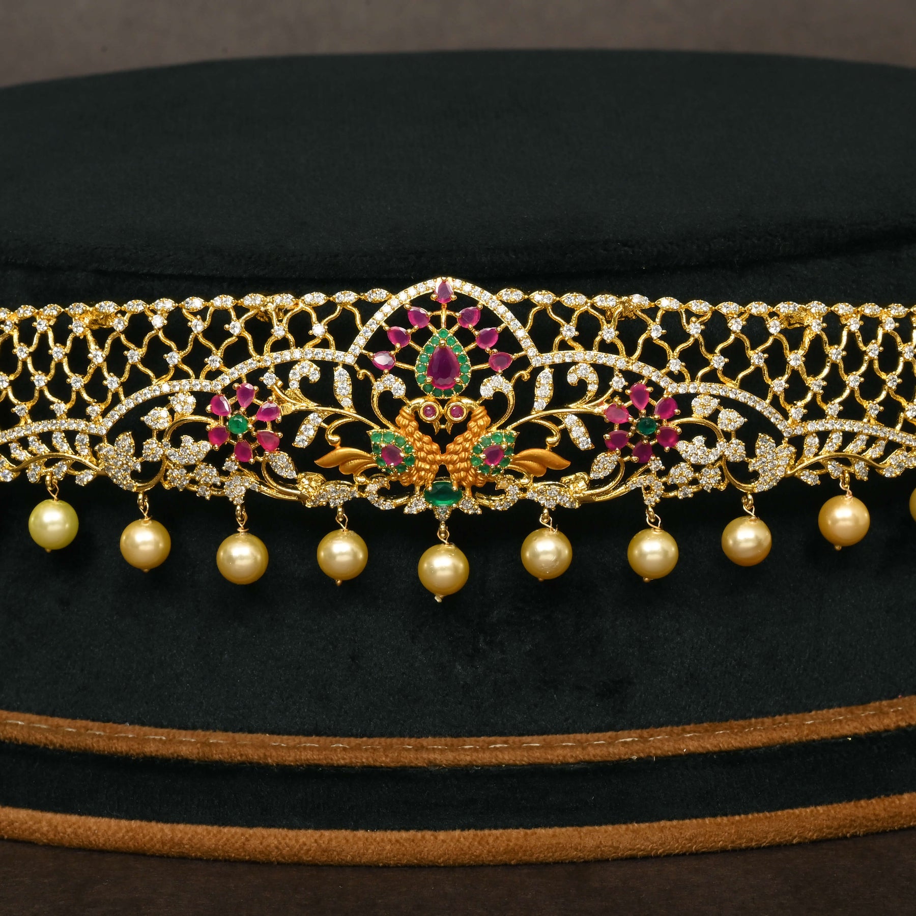 This handcrafted CZ Vaddanam showcases intricate peacock motifs, enhanced with semi-precious emerald and ruby stones and genuine CZ accents. Finished in a rich gold tone, it offers a unique blend of traditional artistry and refined elegance, making it a one-of-a-kind statement piece for special occasions.