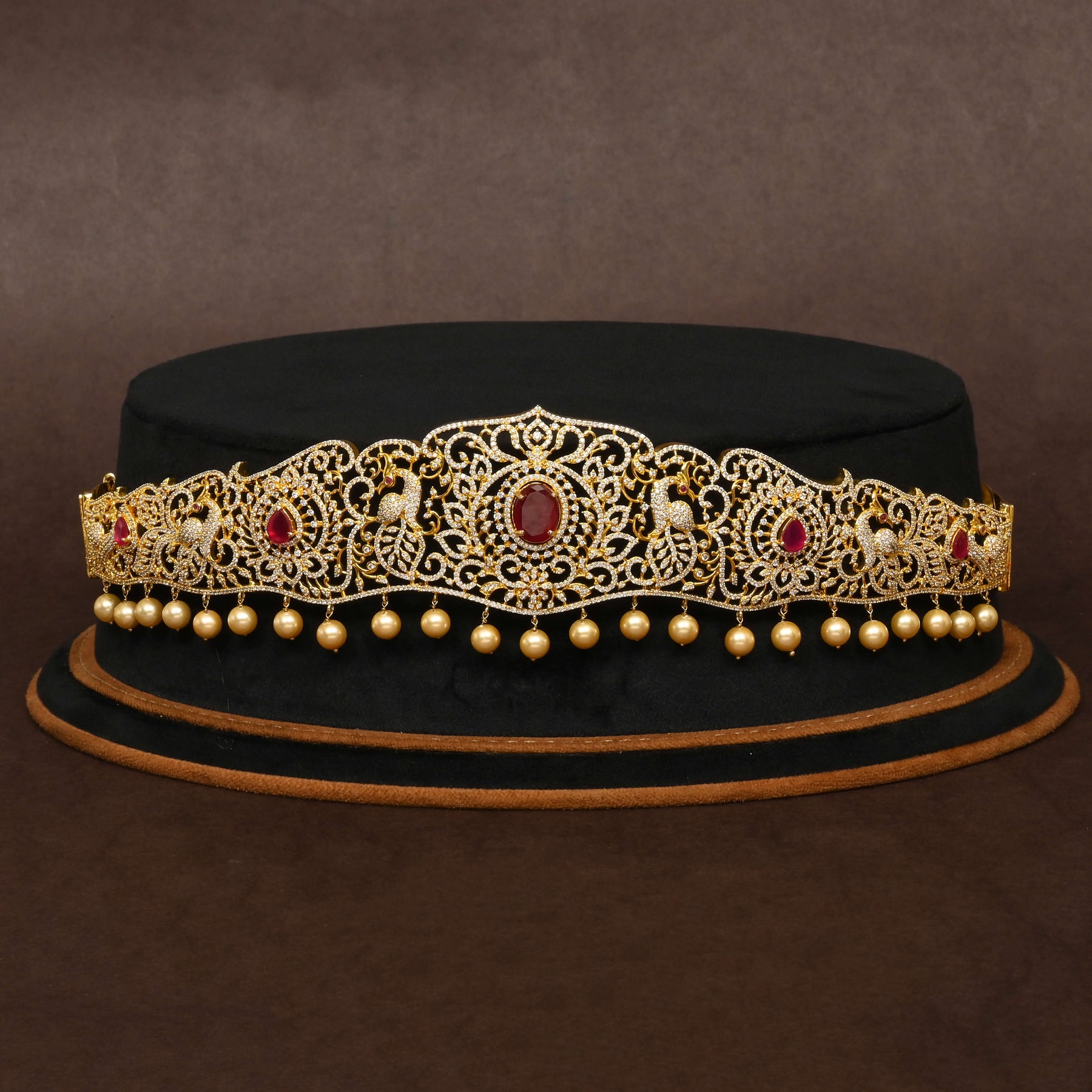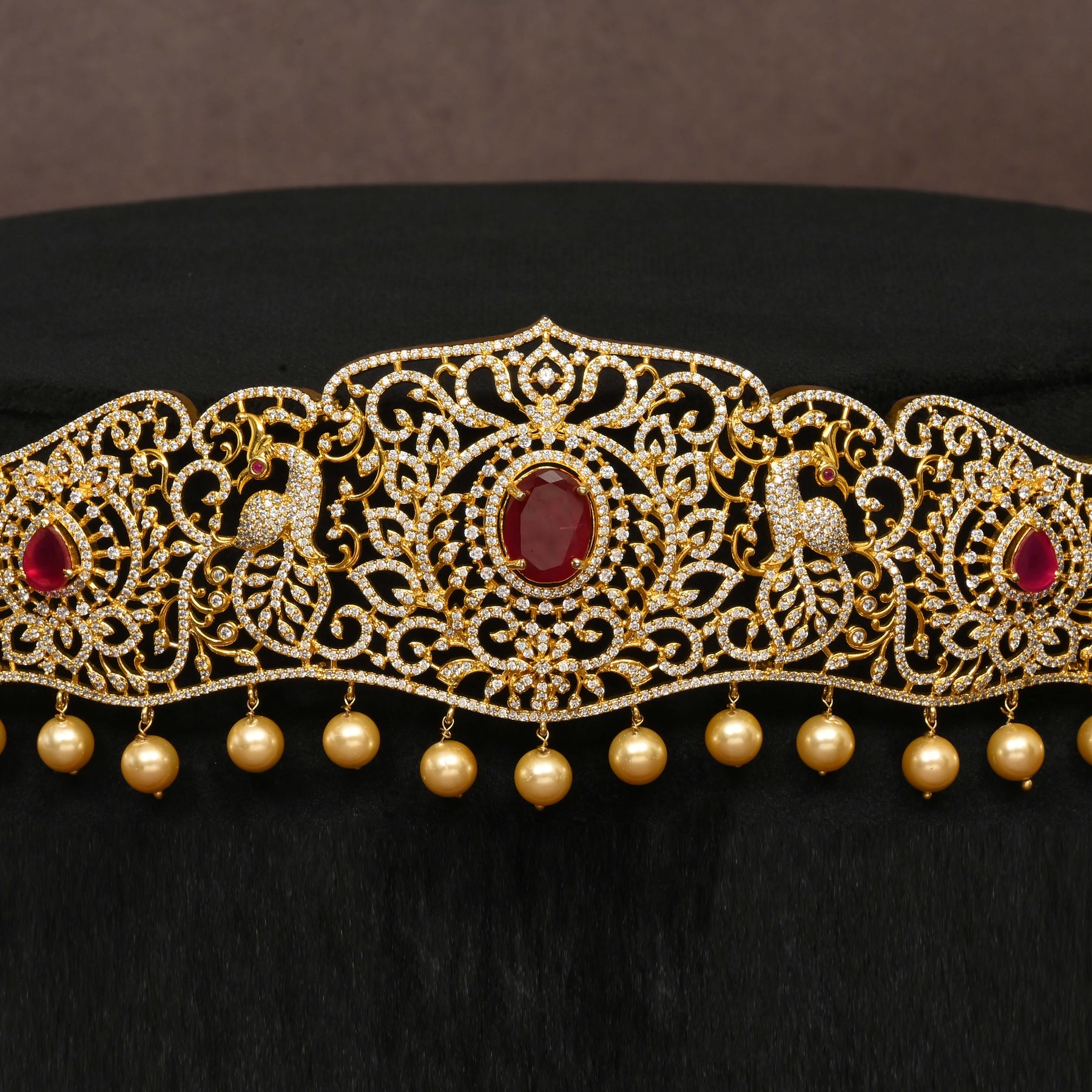 This handcrafted CZ Vaddanam showcases a unique design combining a gold finish with semi-precious ruby stones and vibrant peacock stones. Accented with genuine cubic zirconia stones, it offers a luxurious and elegant look. Perfect for enhancing traditional attire, this one-of-a-kind piece exemplifies expert craftsmanship and timeless beauty.