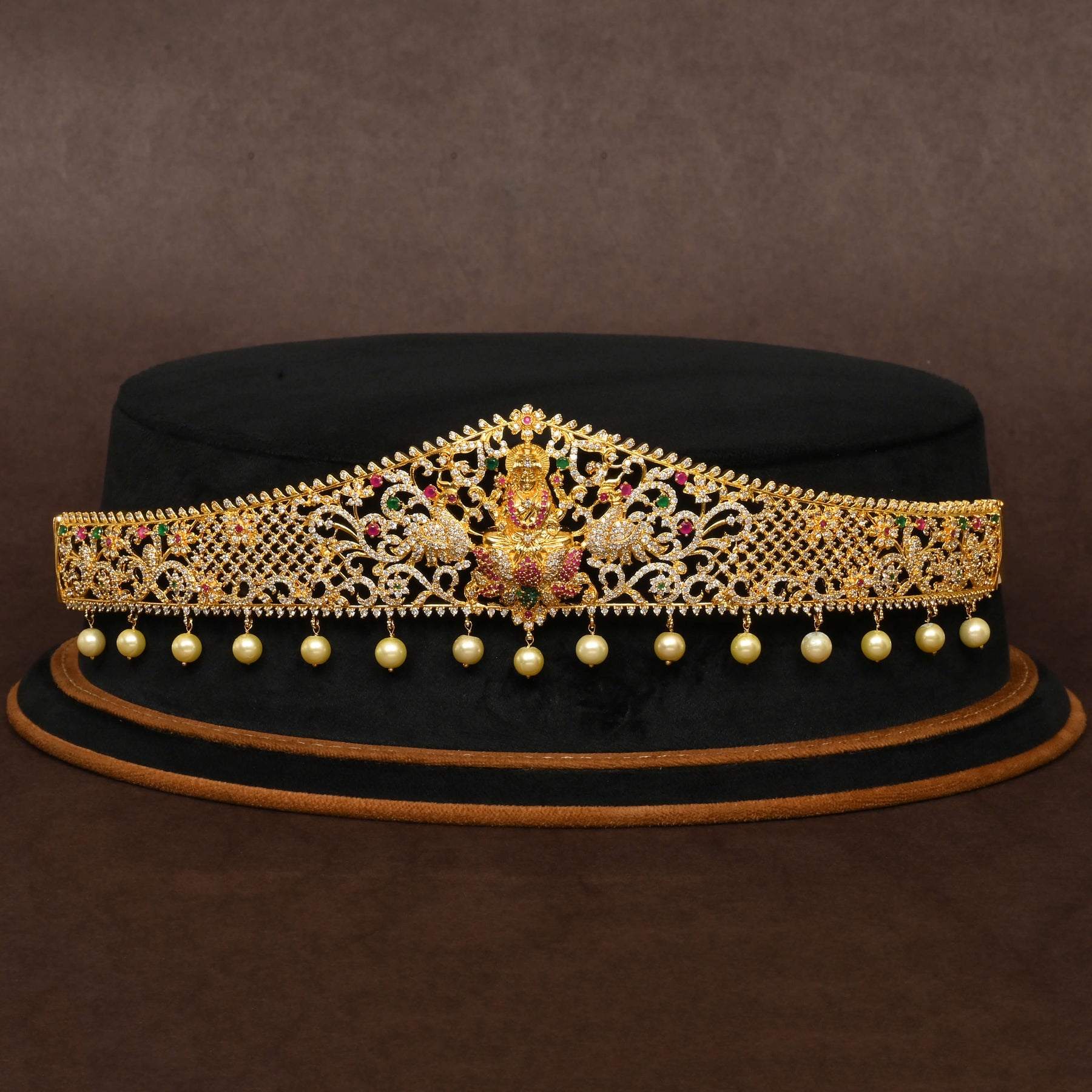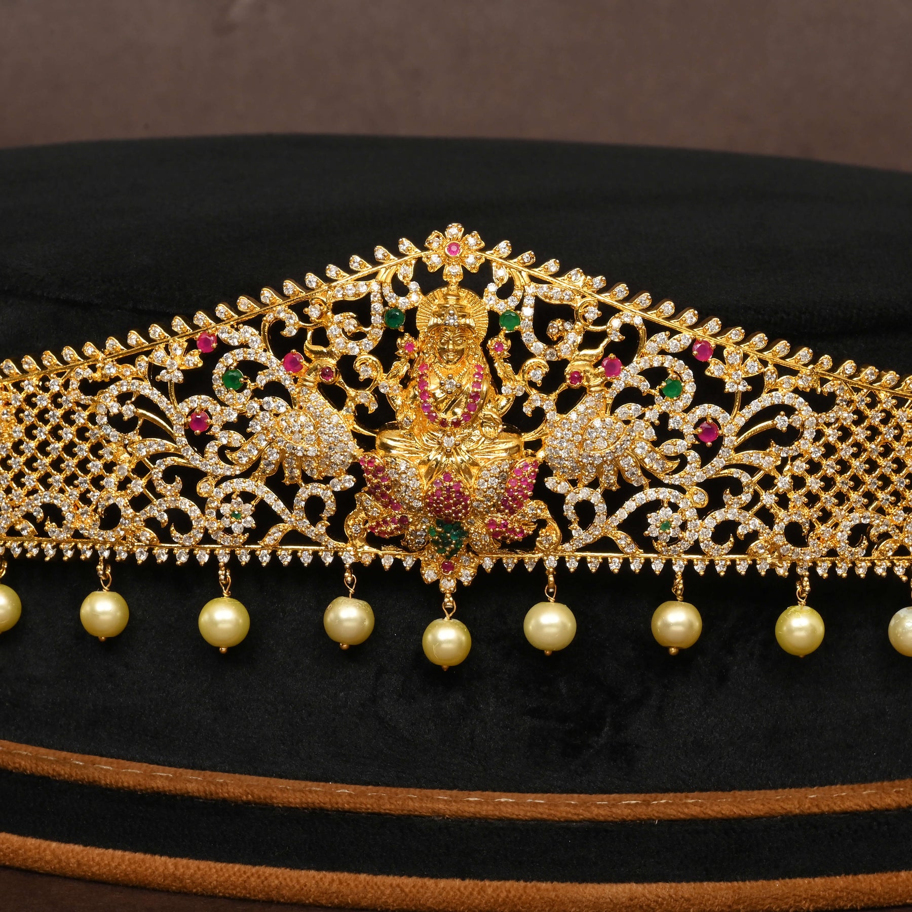 Crafted with exquisite attention to detail, this CZ Vaddanam features a gold finish with a stunning depiction of Goddess Lakshmi. Adorned with semi-precious emerald and ruby stones alongside real CZ stones, this handcrafted piece showcases a unique, one-of-a-kind design that embodies traditional elegance and spiritual significance. Perfect for elevating any special occasion with timeless beauty.