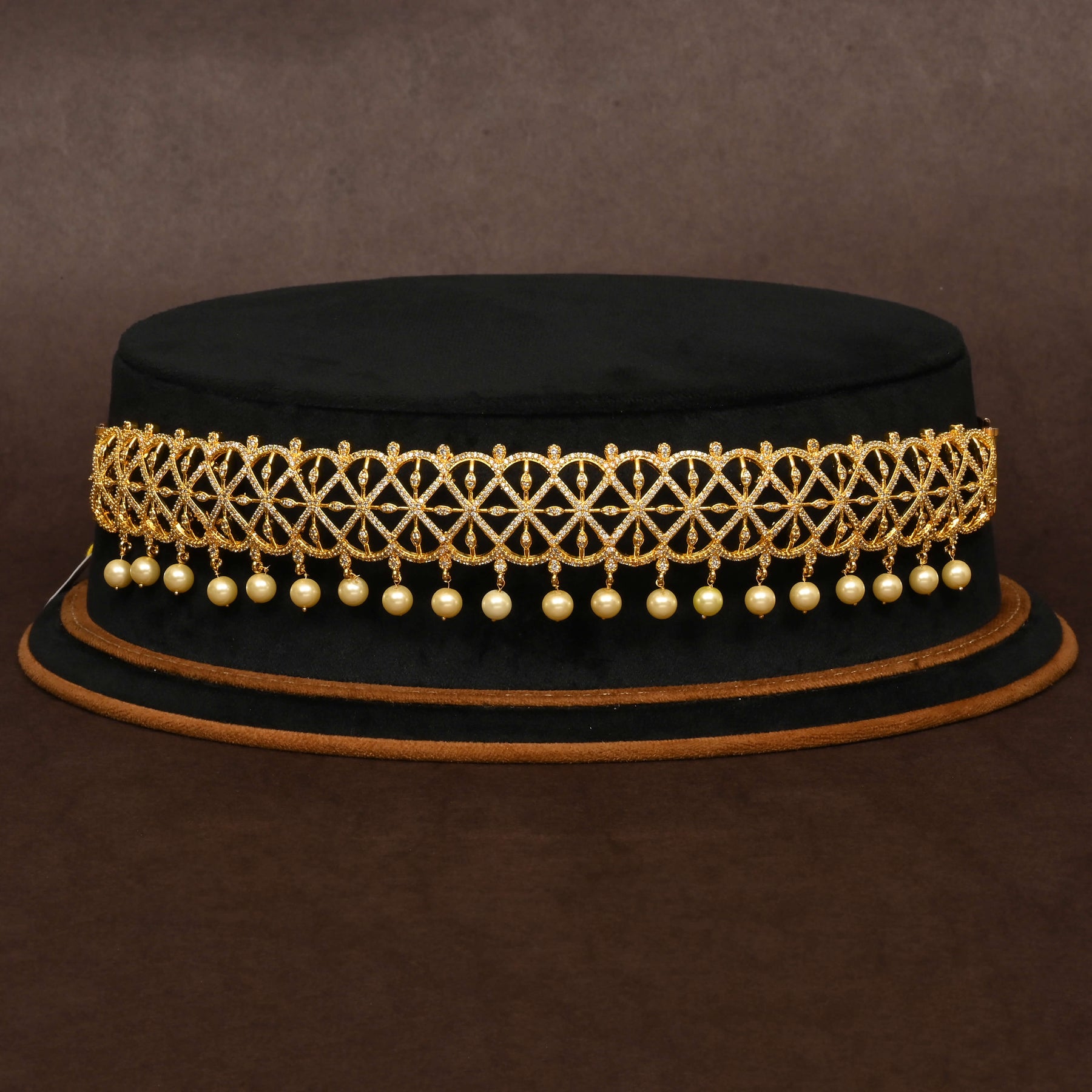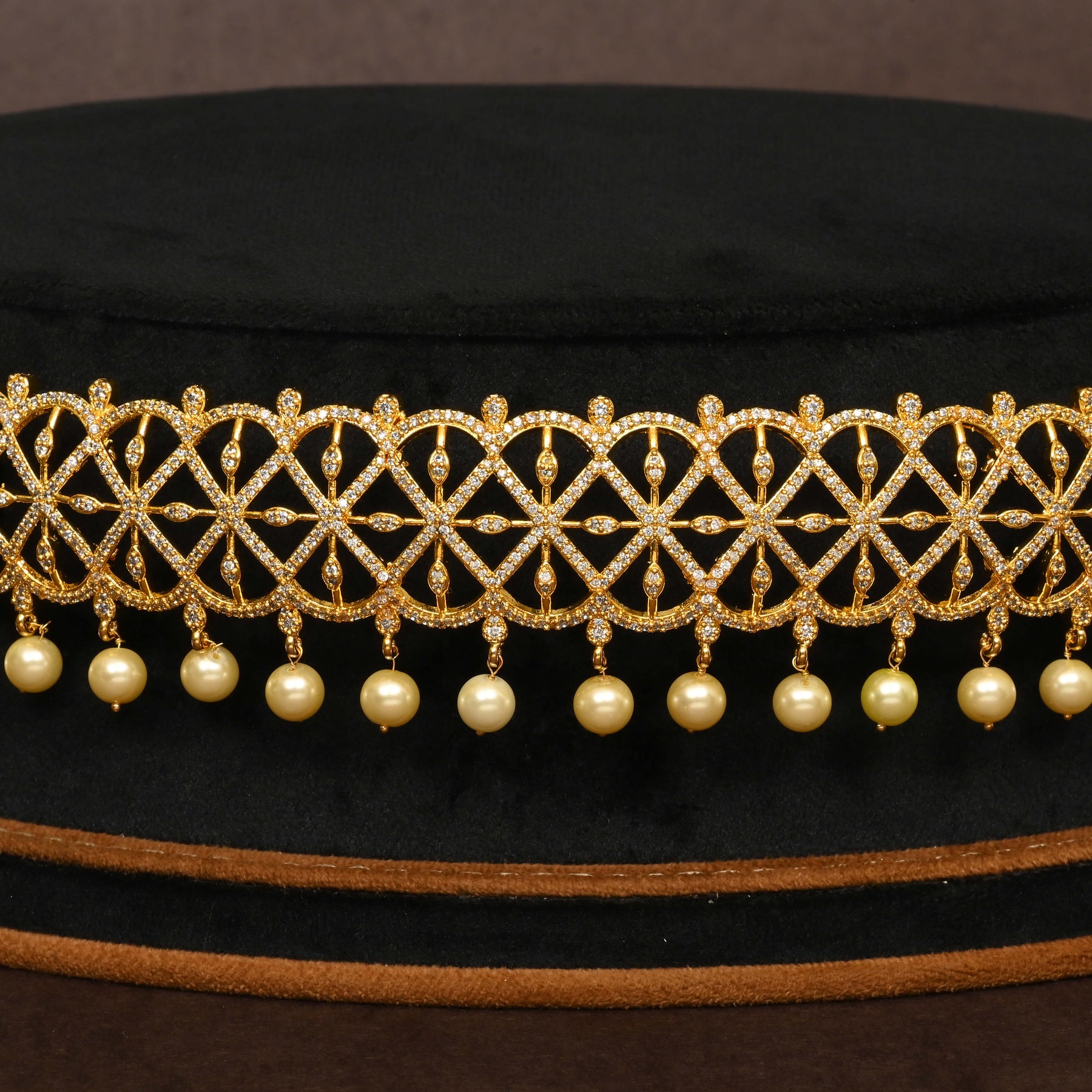 This CZ Vaddanam showcases expert craftsmanship with its gold finish and intricate handwork. Adorned with delicate pearls that gently dangle, it adds a graceful movement to the piece. Real cubic zirconia stones enhance its brilliance, creating a striking contrast against the traditional design. Each element is carefully handcrafted, making this vaddanam a unique and timeless accessory perfect for special occasions.