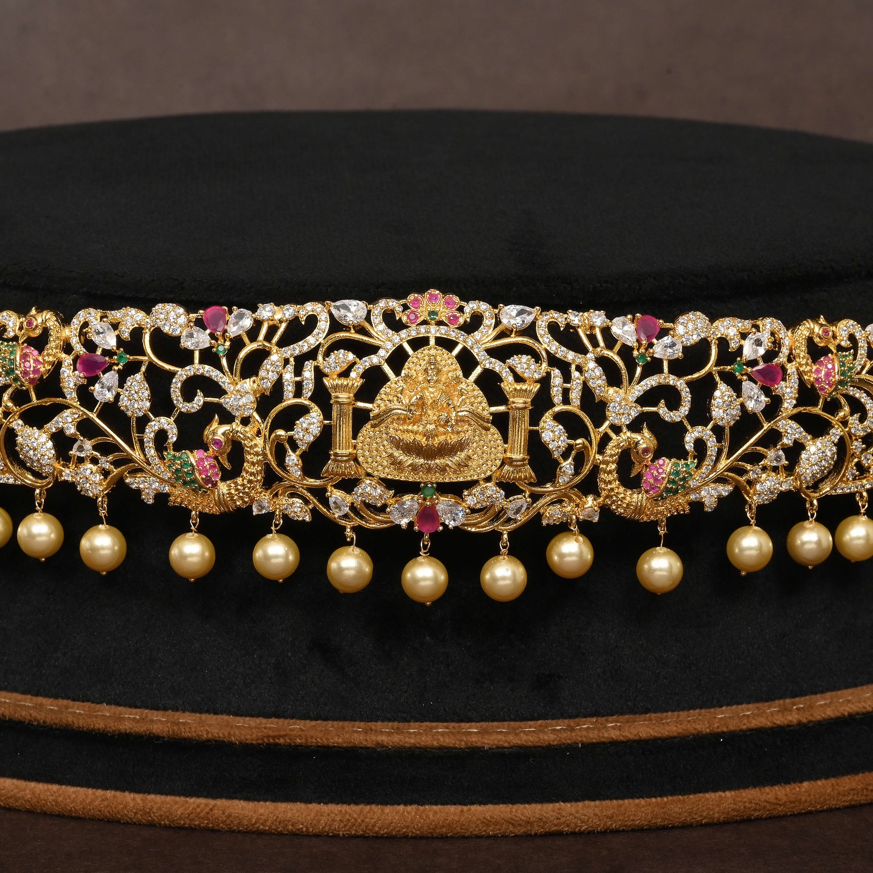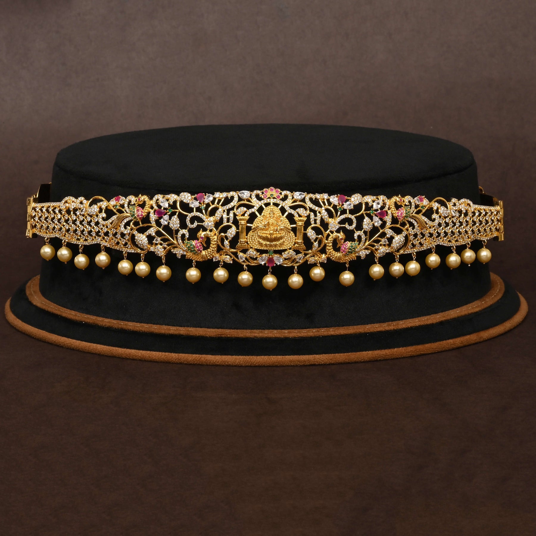 This Temple Vaddanam features a gold finish that enhances its traditional appeal. Adorned with semi-precious emerald and ruby stones alongside genuine CZ stones, it offers a rich and vibrant look. Handcrafted with meticulous attention to detail, each piece showcases a unique design that stands out as one of a kind. Ideal for special occasions, this vaddanam combines heritage aesthetics with exquisite craftsmanship.