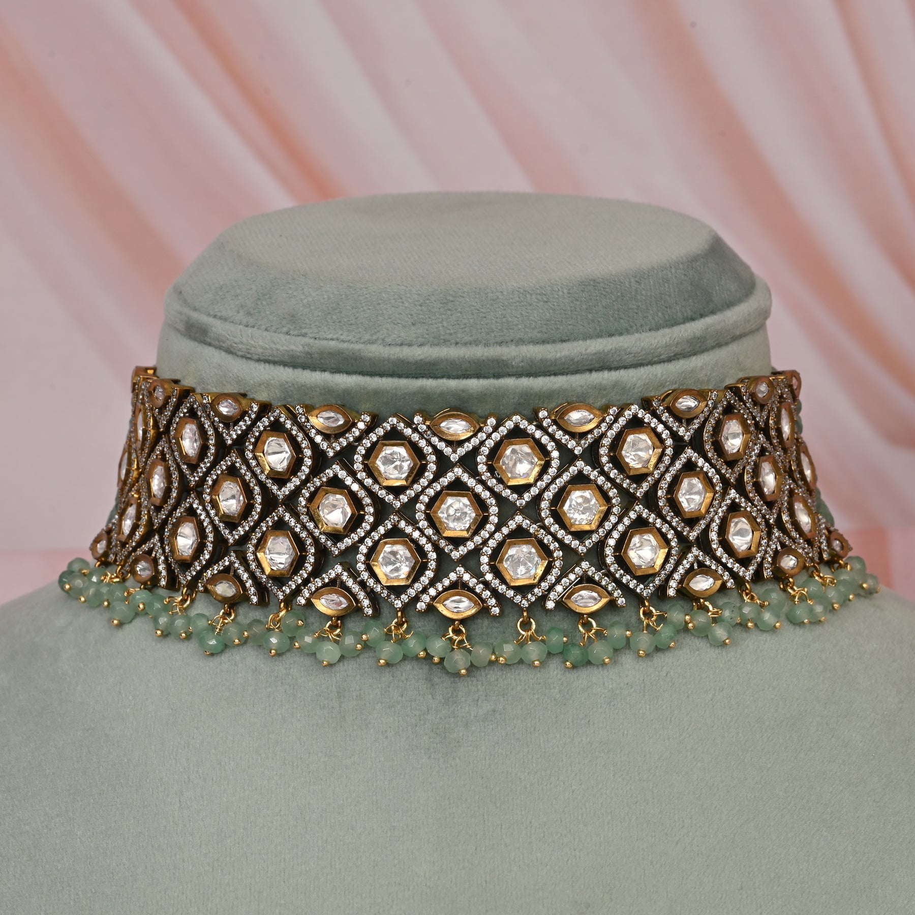 Meticulously hand-crafted Victorian beads choker featuring an exquisite combination of genuine CZ stones and premium moissanite. This luxury piece showcases superior artisanship with authentic Victorian-inspired detailing, creating a sophisticated statement accessory that elevates both traditional and contemporary ensembles.