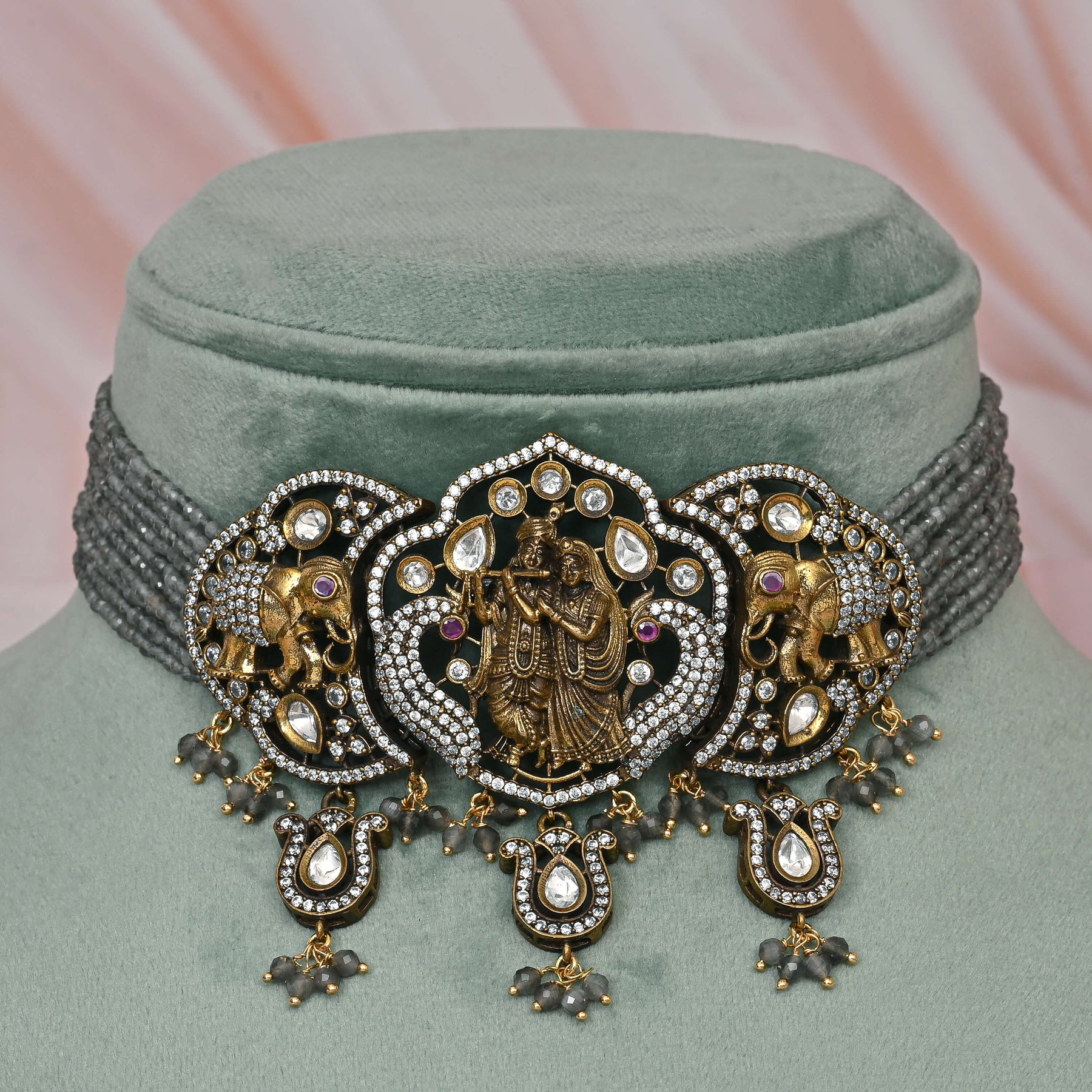 Meticulously hand-crafted Victorian choker featuring authentic CZ stones arranged in a traditional beaded pattern. This elegant necklace combines historical design elements with precision craftsmanship, creating a luxury statement piece that enhances both formal attire and contemporary ensembles. The intricate detailing reflects superior artisanal techniques characteristic of fine jewelry.