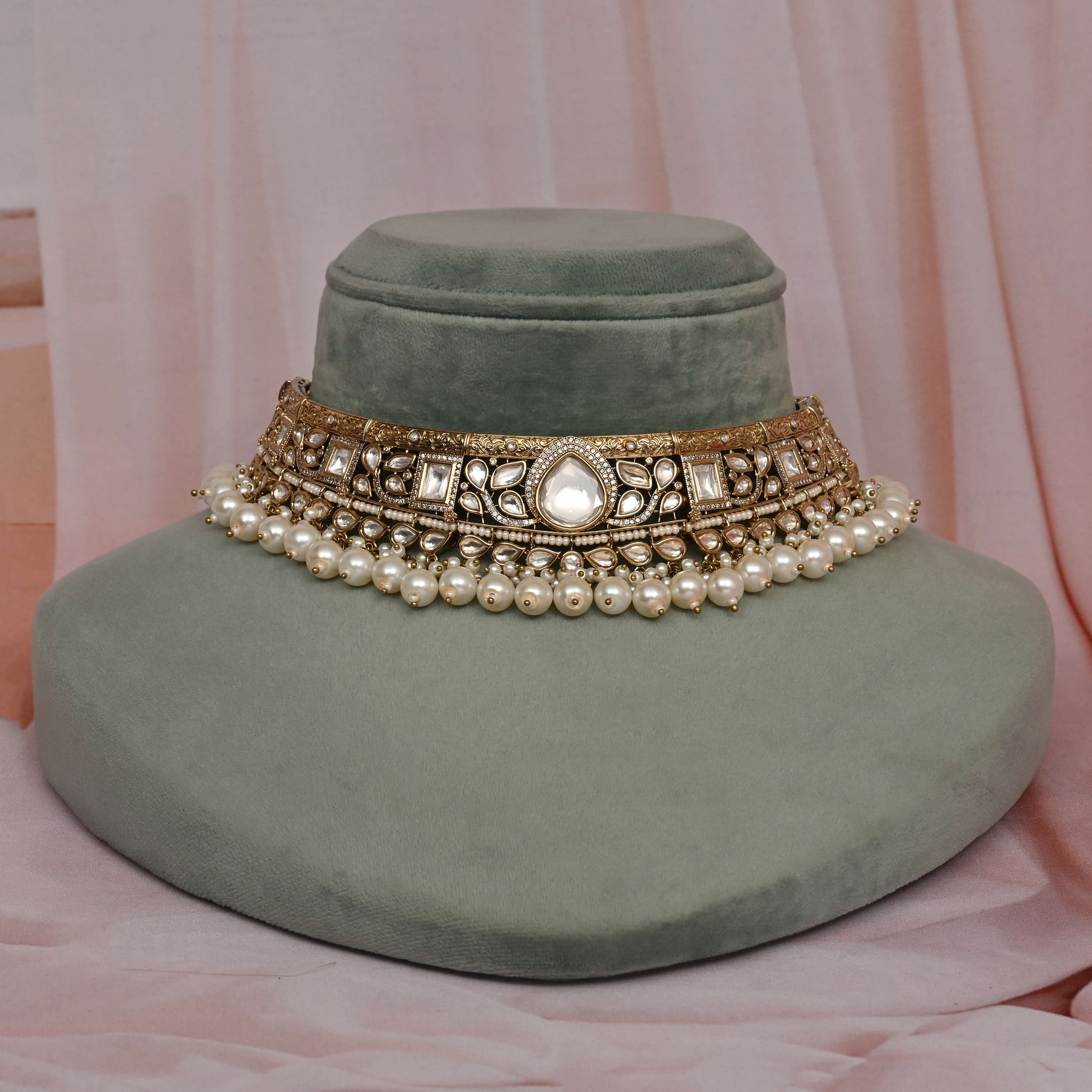 This Victorian choker set showcases expert craftsmanship with a unique, one-of-a-kind design. Featuring real CZ and moissanite stones, it offers the brilliance and sparkle of genuine diamonds. Delicately accented with dangling pearls, this handcrafted piece combines timeless elegance with exceptional quality, making it a standout addition to any fine jewellery collection.