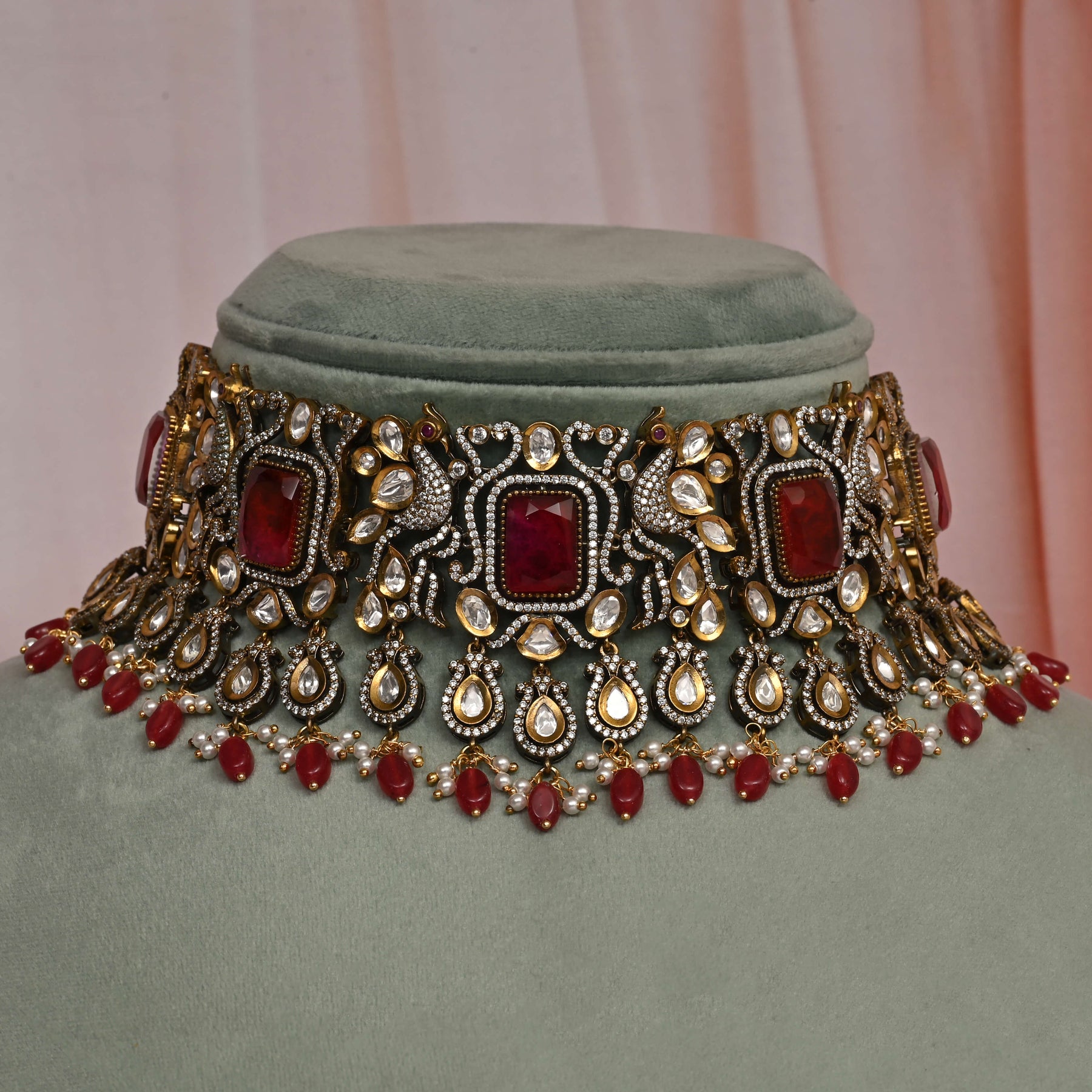 This Victorian choker set showcases expert craftsmanship with a unique, one-of-a-kind design. Featuring real cubic zirconia and moissanite stones, it delivers the brilliance and sparkle of genuine diamonds. Elegant pearls dangle gracefully, enhancing its vintage charm. Handcrafted to perfection, this choker set is an exquisite choice for those seeking timeless sophistication and exceptional quality.