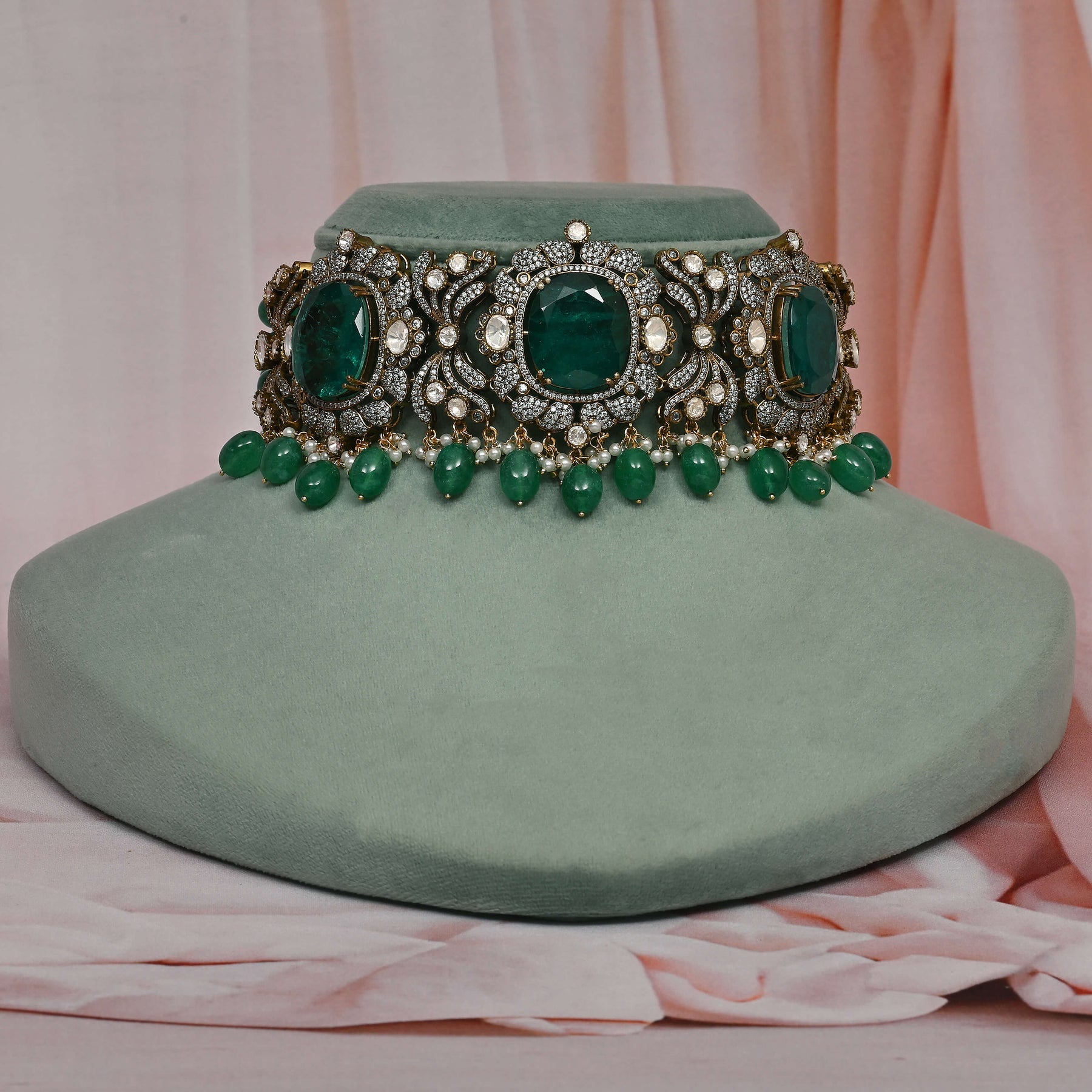 This Victorian choker set showcases expert craftsmanship with a unique, one-of-a-kind design. Featuring real cubic zirconia and moissanite stones, it offers the brilliance and sparkle of genuine diamonds. Delicately accented with dangling pearls, this handcrafted piece combines timeless elegance with exceptional detail, perfect for those seeking a sophisticated and authentic vintage-inspired accessory.