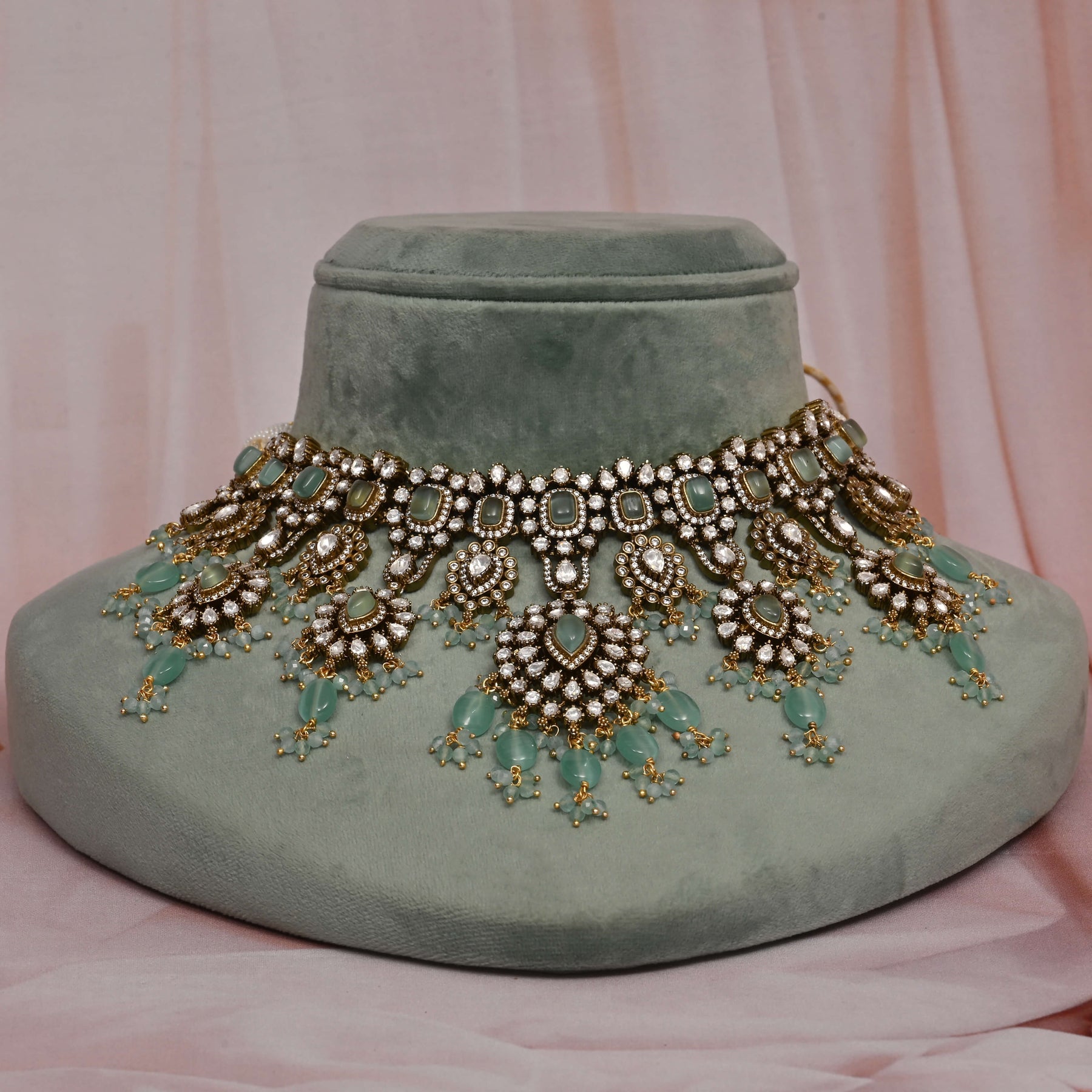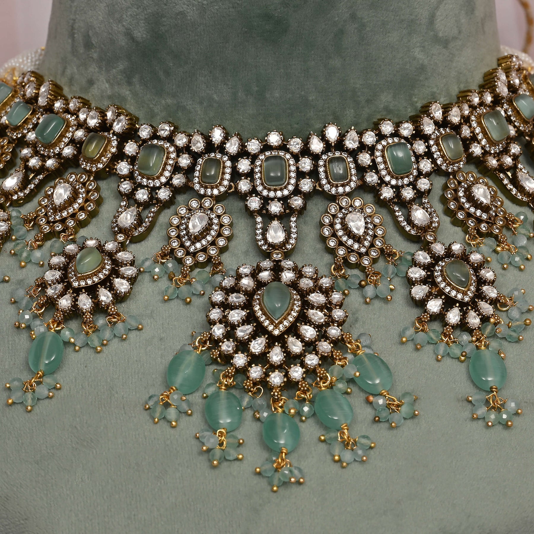 This Victorian choker set showcases expert craftsmanship with a unique, one-of-a-kind design. Featuring real CZ and moissanite stones, it offers the brilliance and sparkle of genuine diamonds. Delicately accented with dangling pearls, this handcrafted piece combines timeless elegance with exceptional detail, making it a standout addition to any fine jewelry collection.